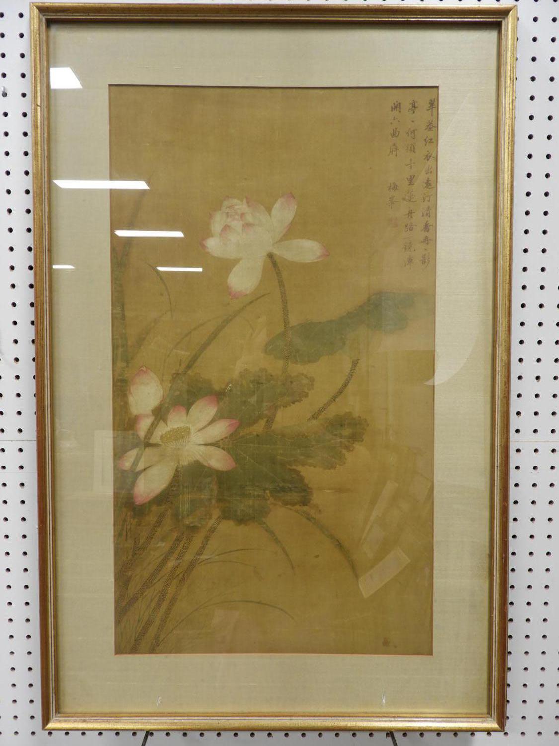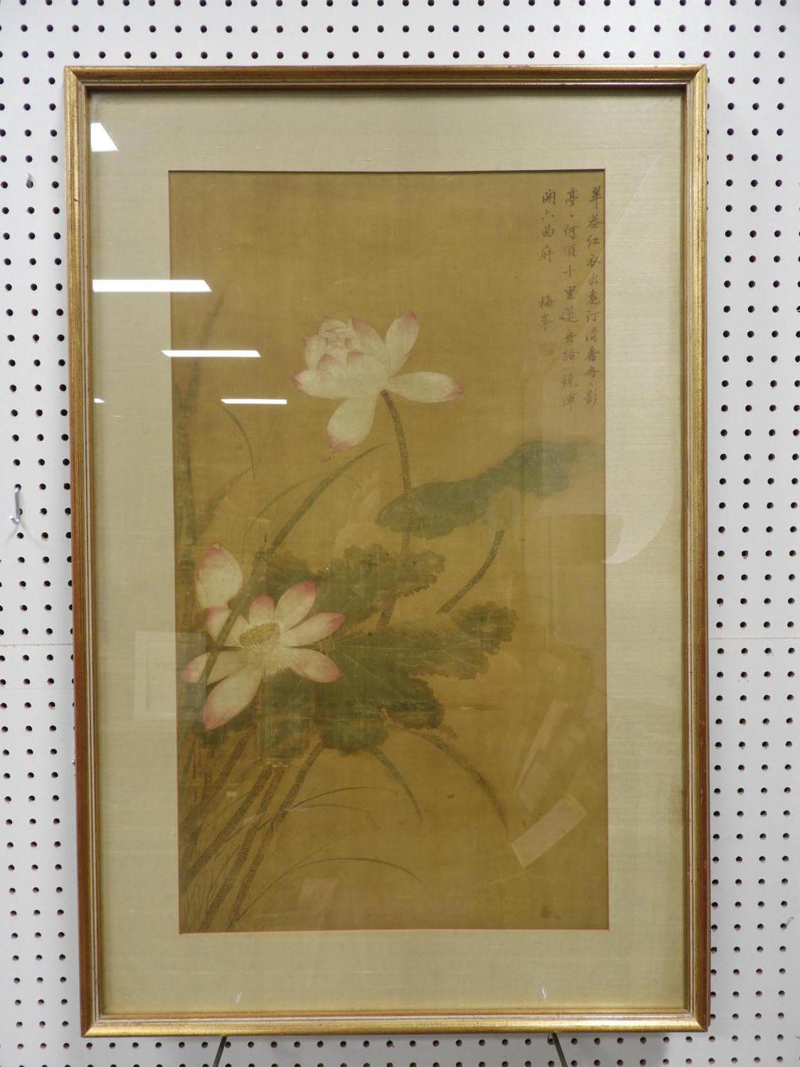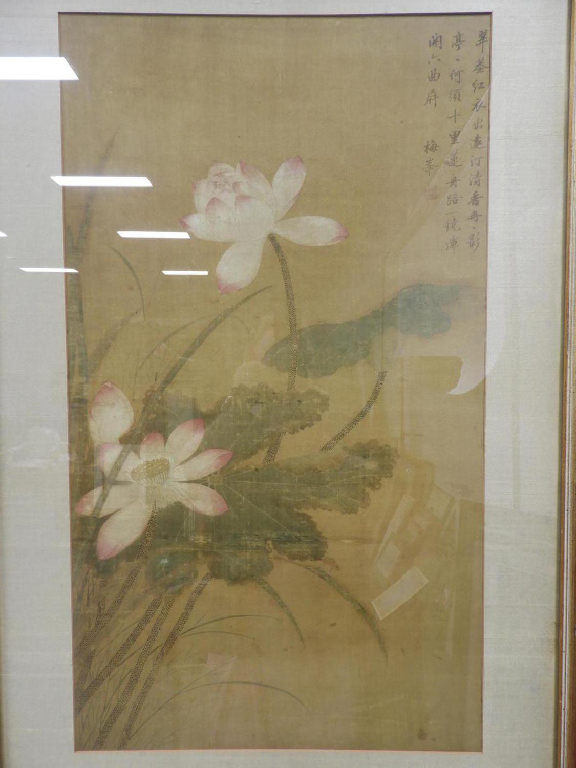 gilt framed chinese scroll-style print "lotus flower", overall 38" x 25", exclusivly designed for rollinson ltd, toronto