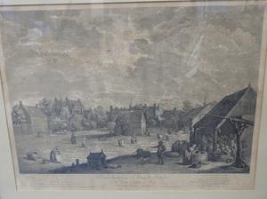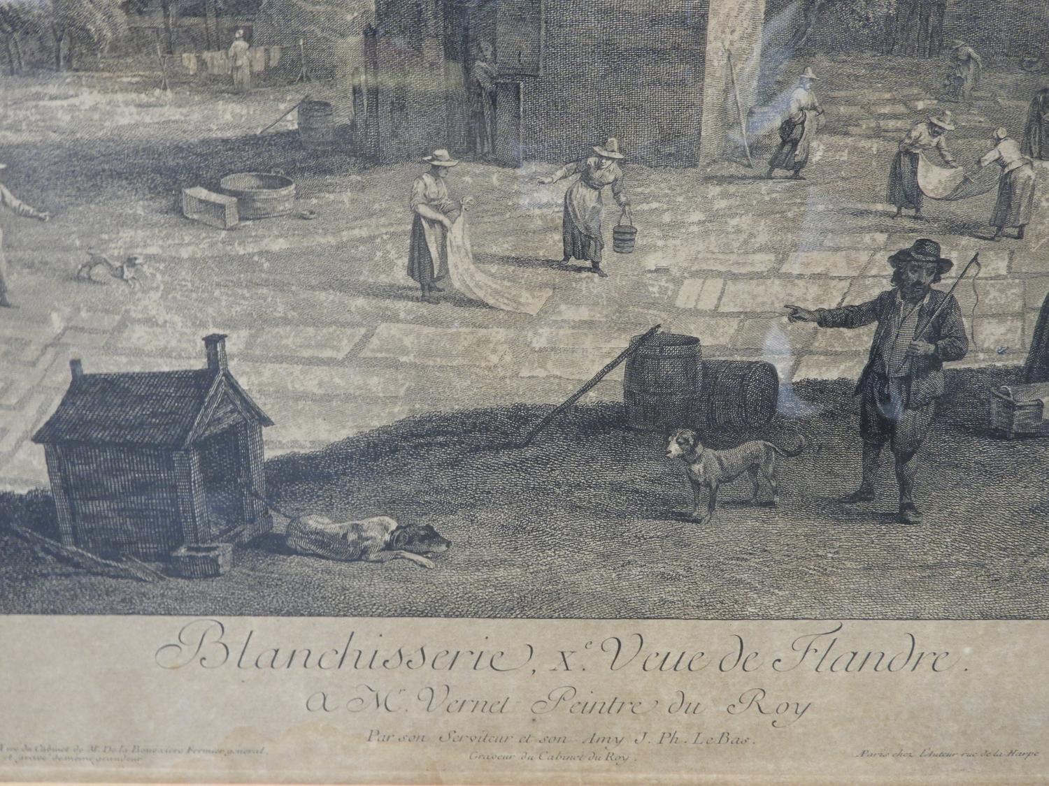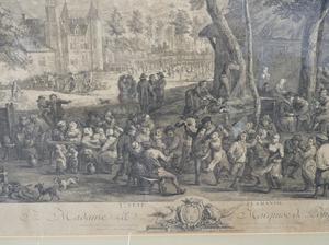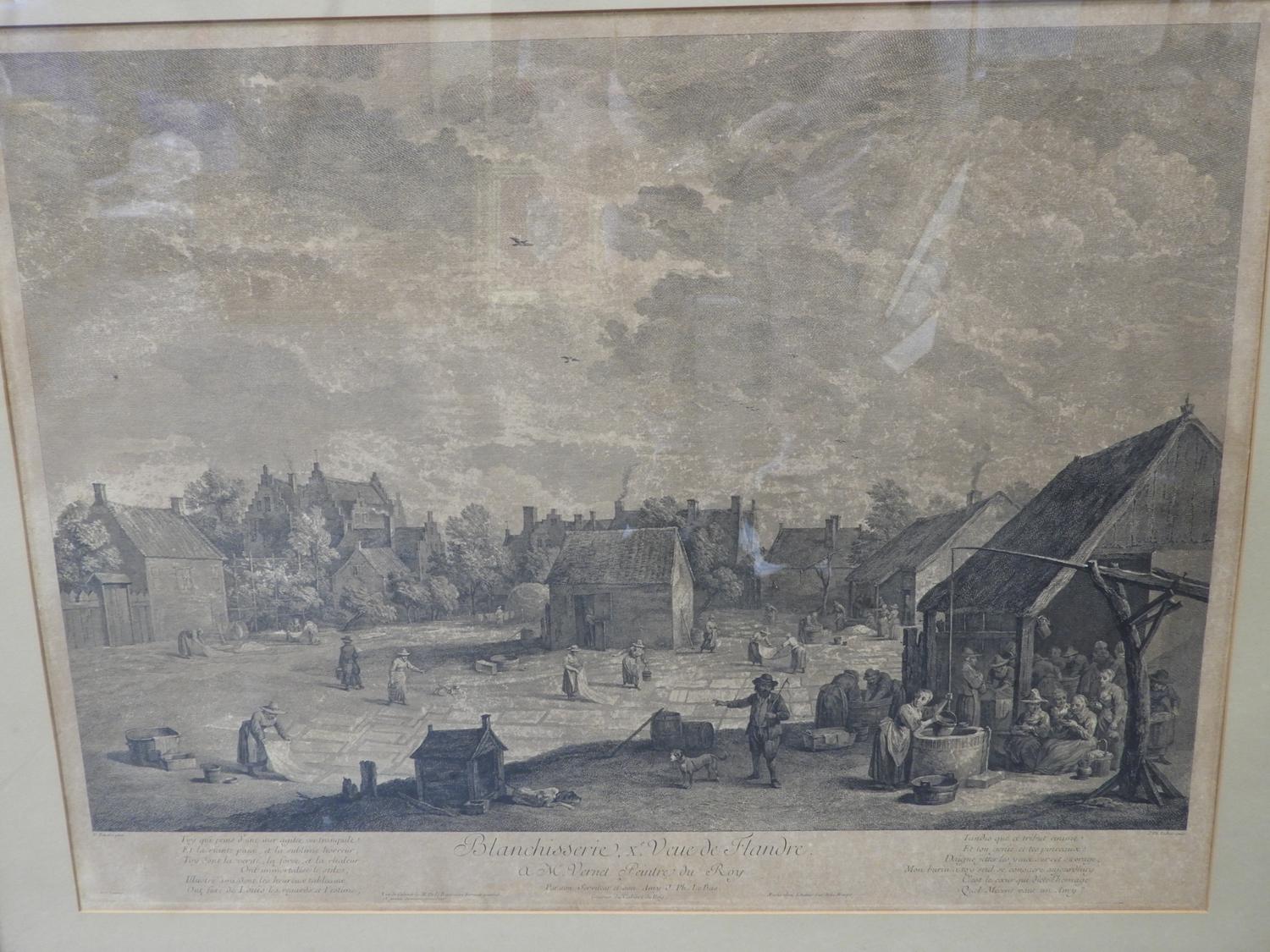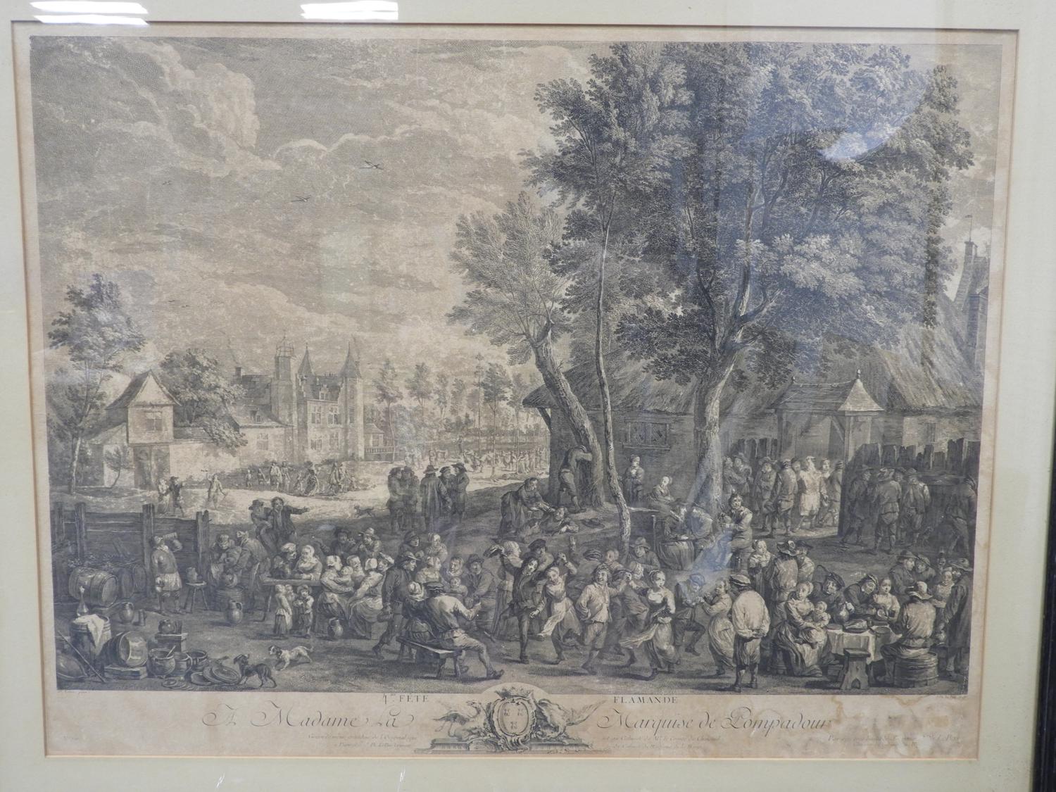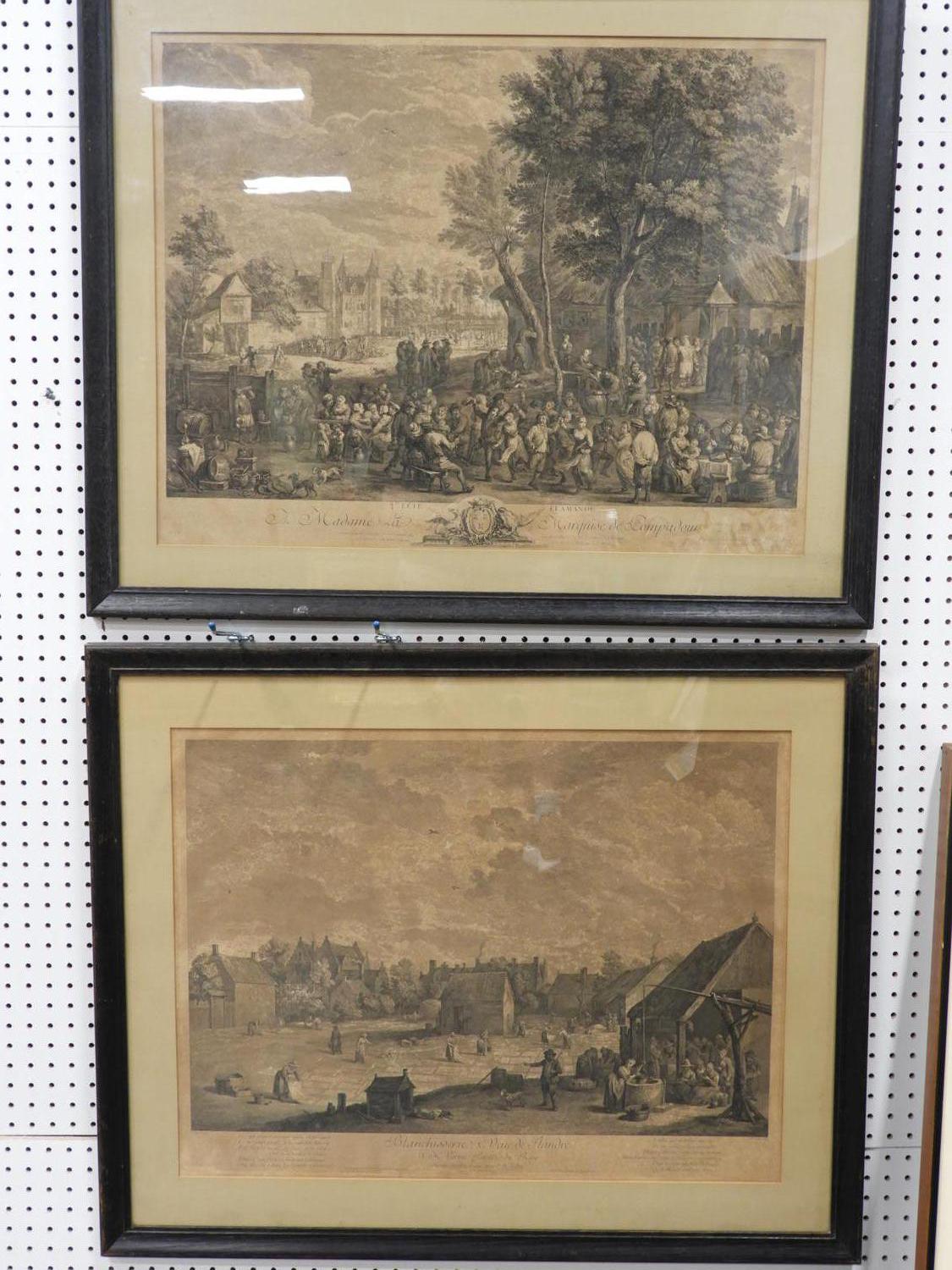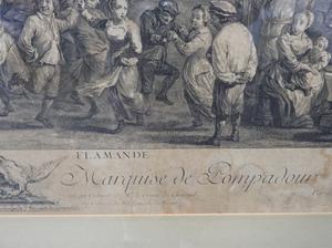 pair of framed antique prints after david teniers, "a madame la marquise de pompadour" & "blanchisserie vaie de flandre"