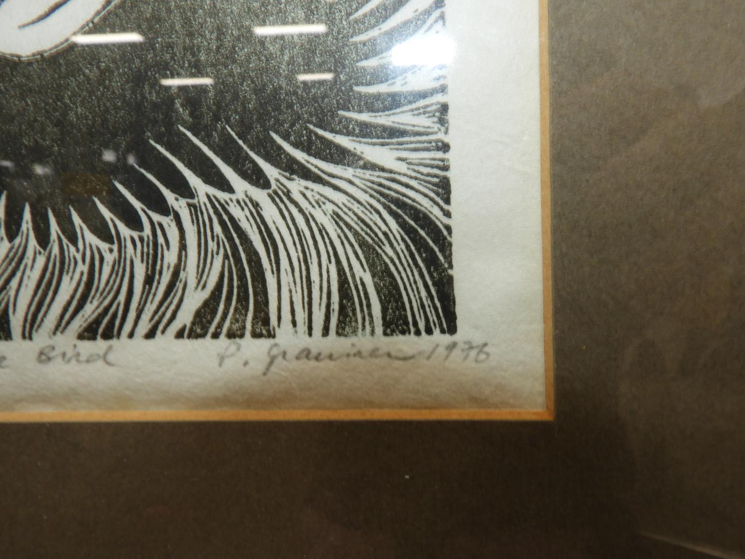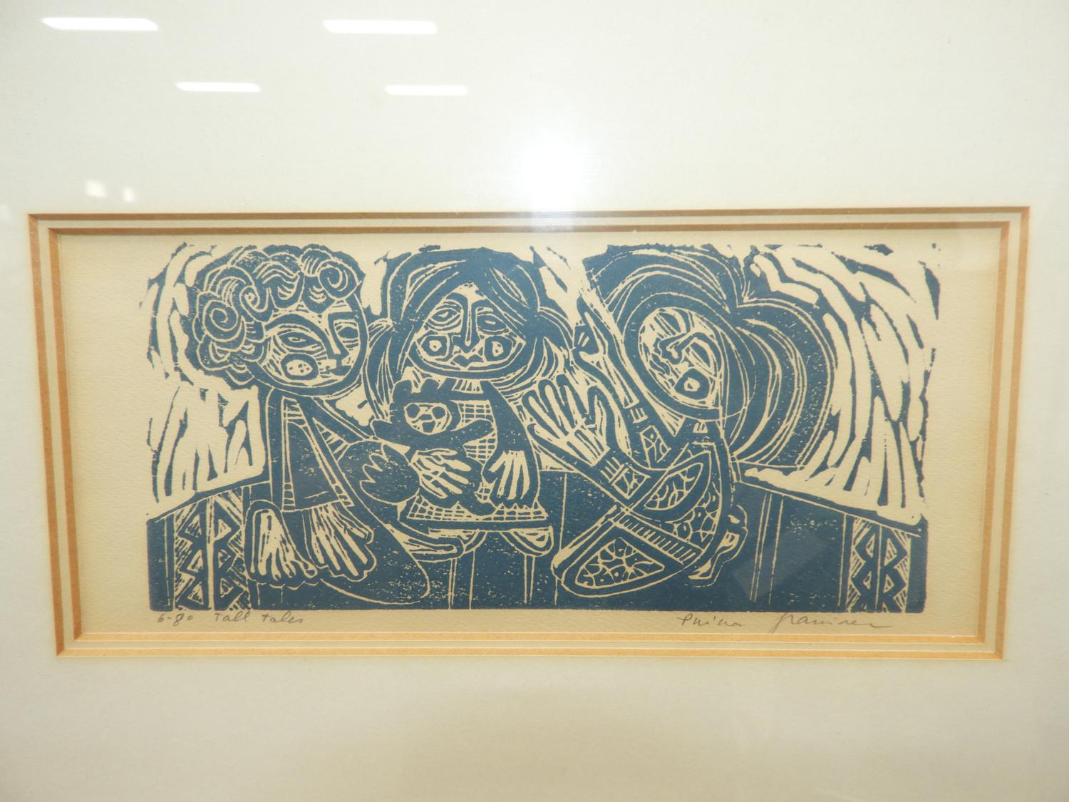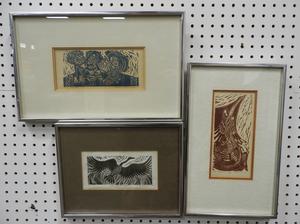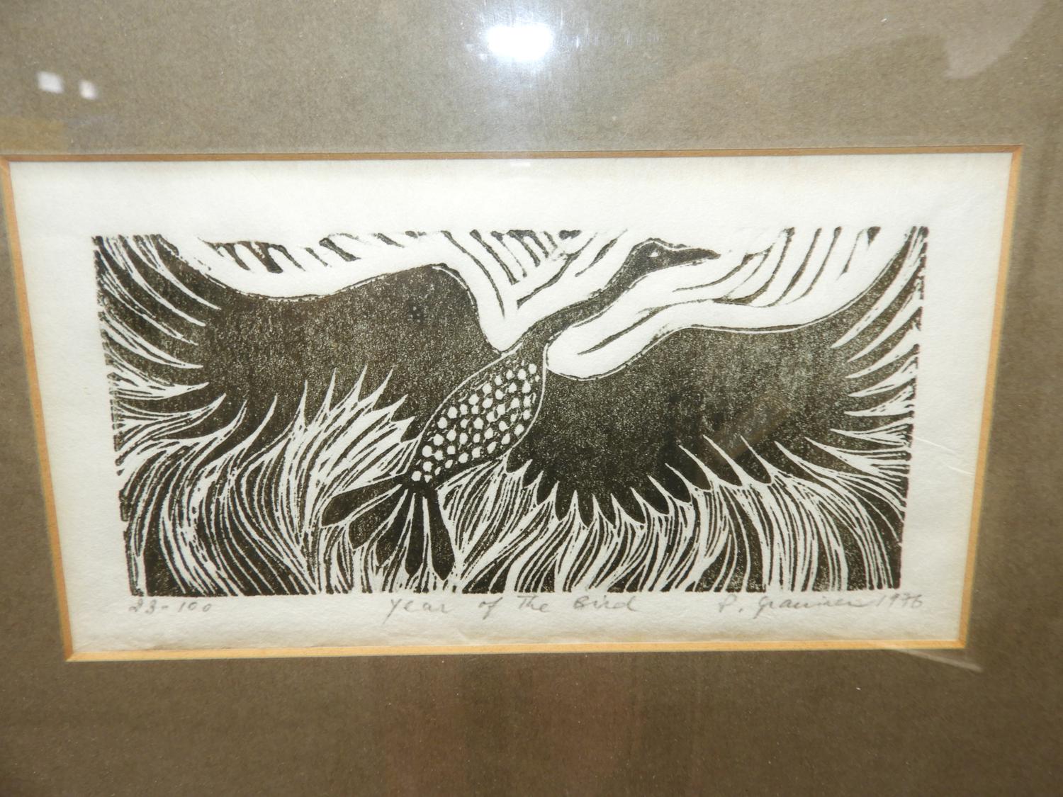 p. grainer, three woodblock prints, 4" x 8 1/2" and smaller, "tall tales", "life fragment" & "year of the bird"
