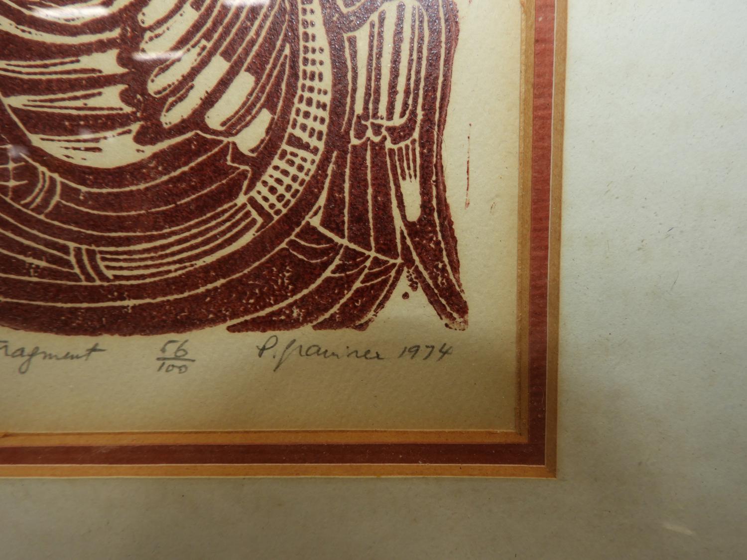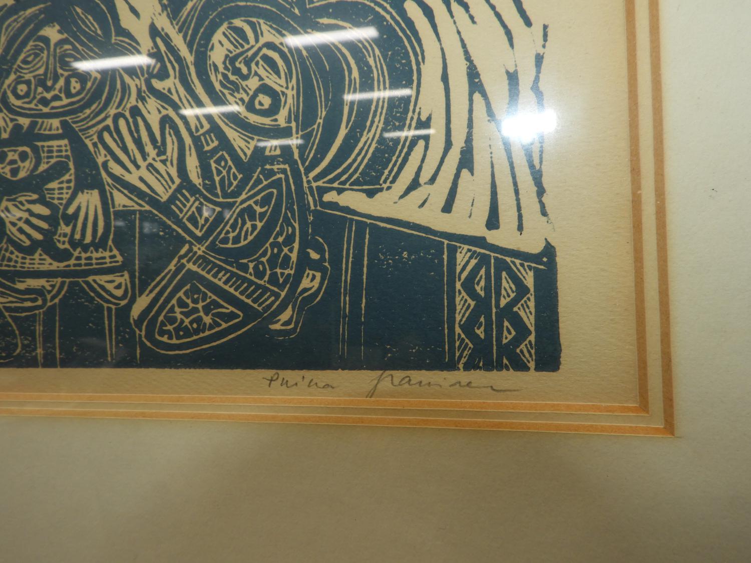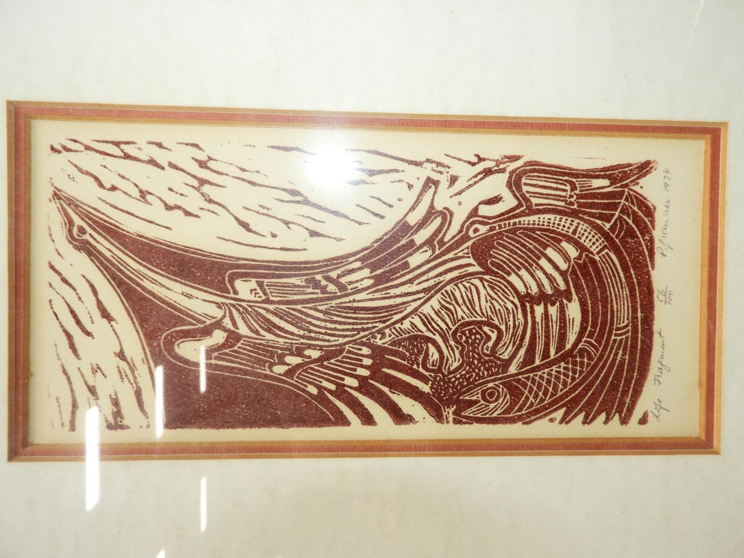 p. grainer, three woodblock prints, 4" x 8 1/2" and smaller, "tall tales", "life fragment" & "year of the bird"