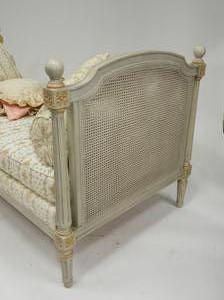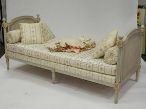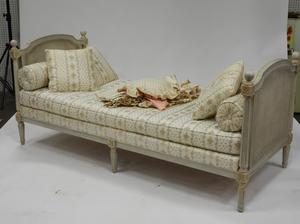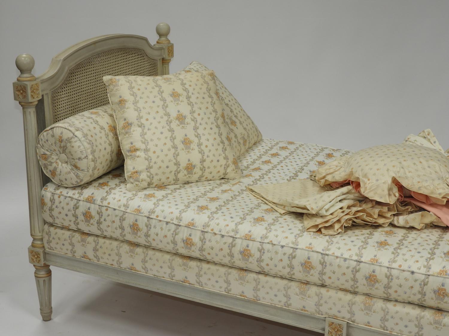 pair of louis xvi style painted beds with matching cushions and linens, mid/late 20th century, 34" x 78" x 33"