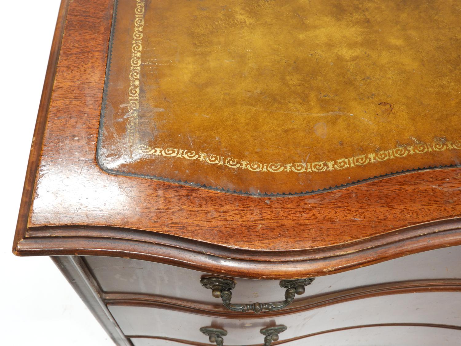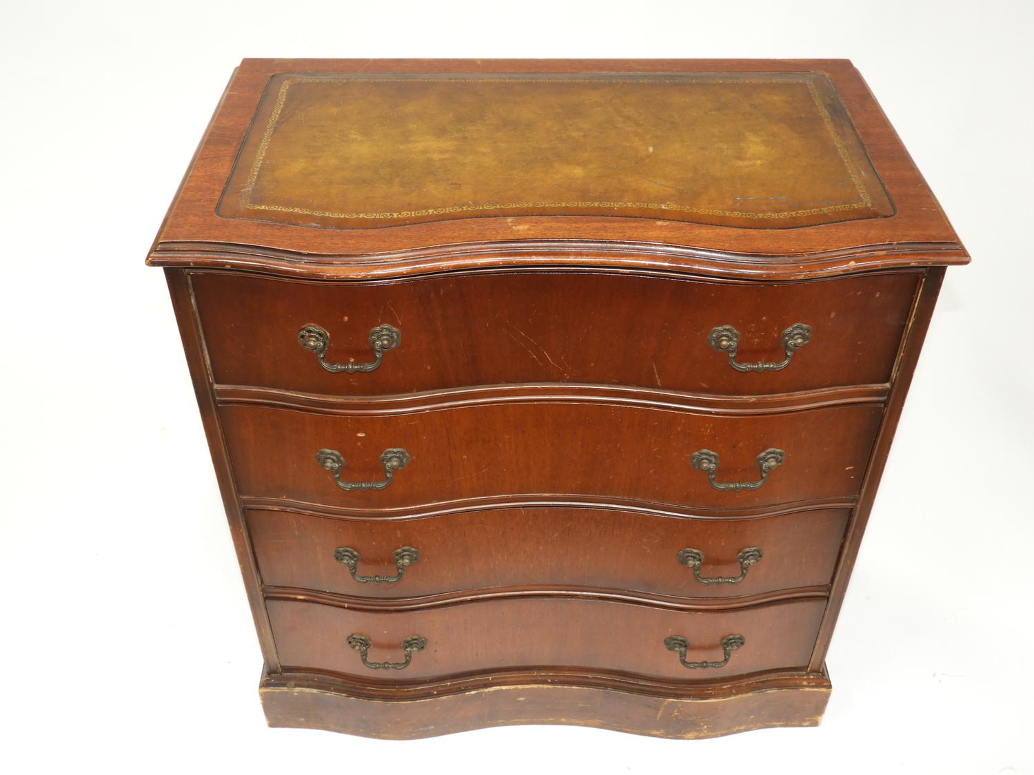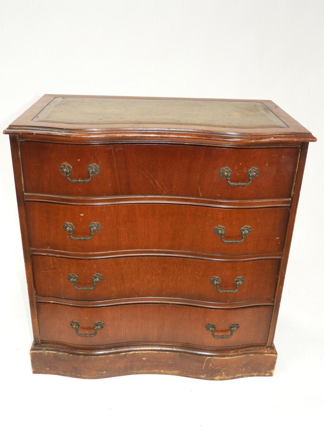 small mahogany serpentine front chest of drawers with lether inset top, c.1940, 30" x 29" x 17"