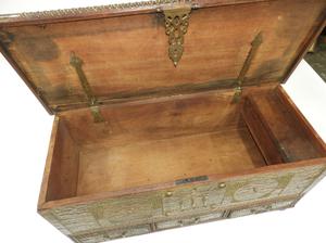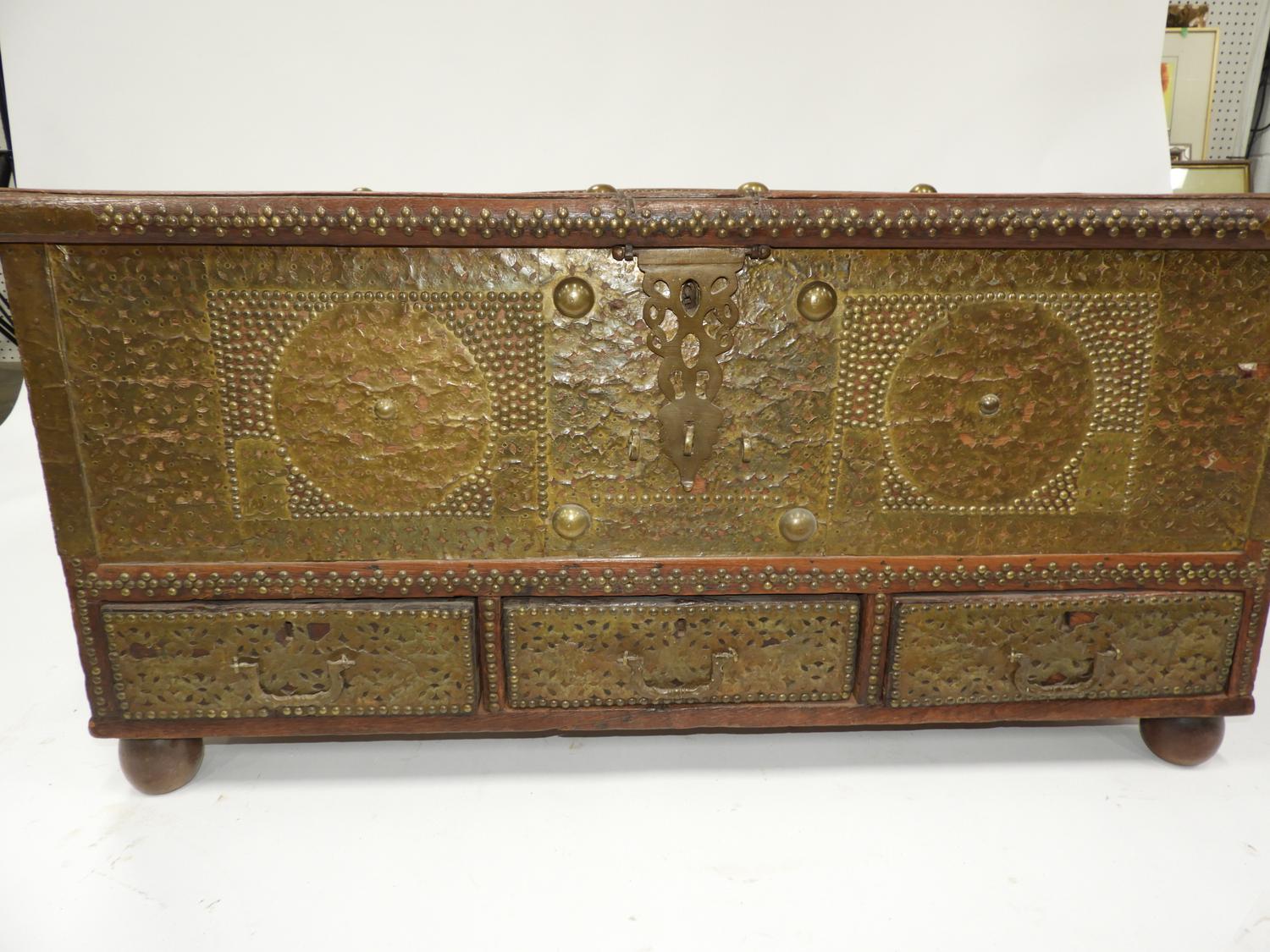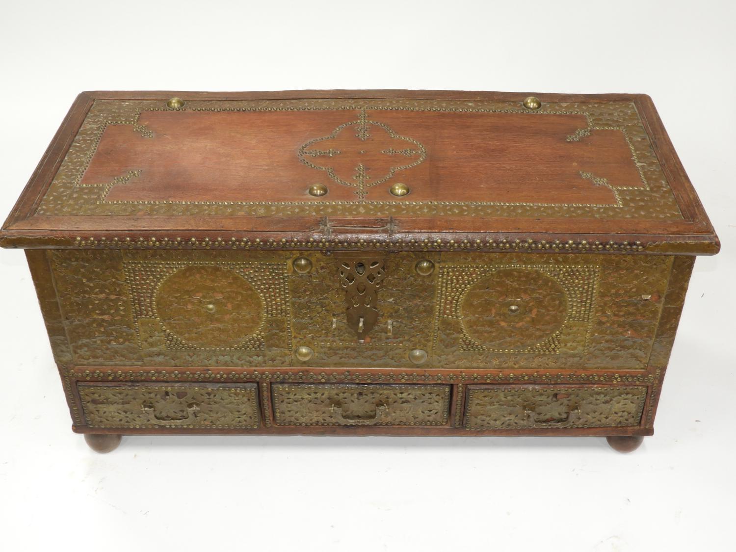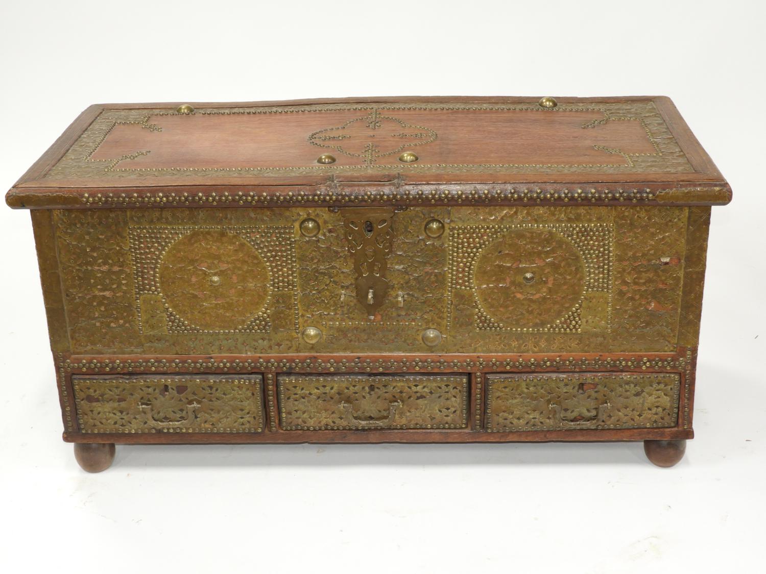 eastern close nail studded and brass overlay oak chest, late 19th century, 21" x 43" x 18"
