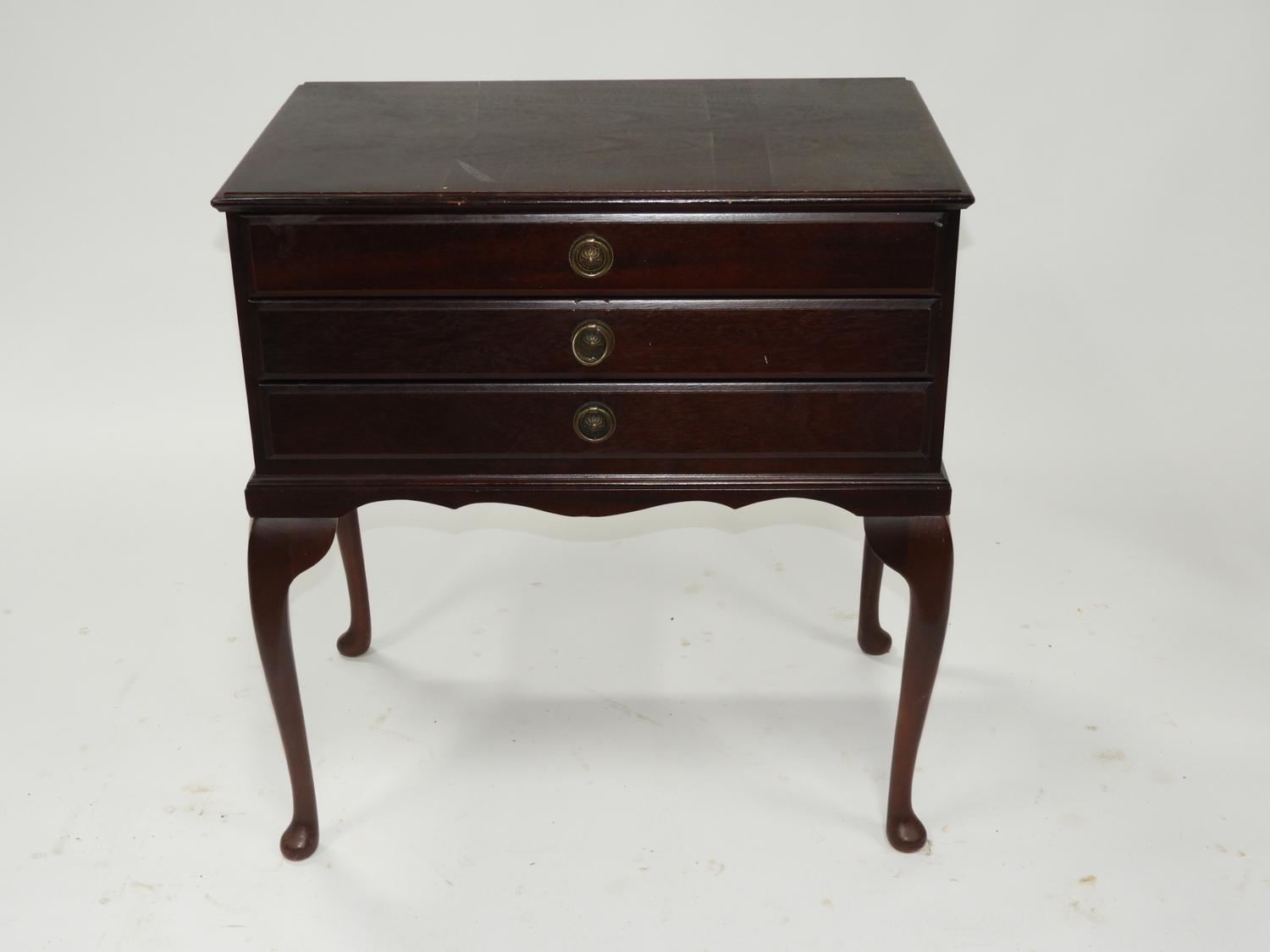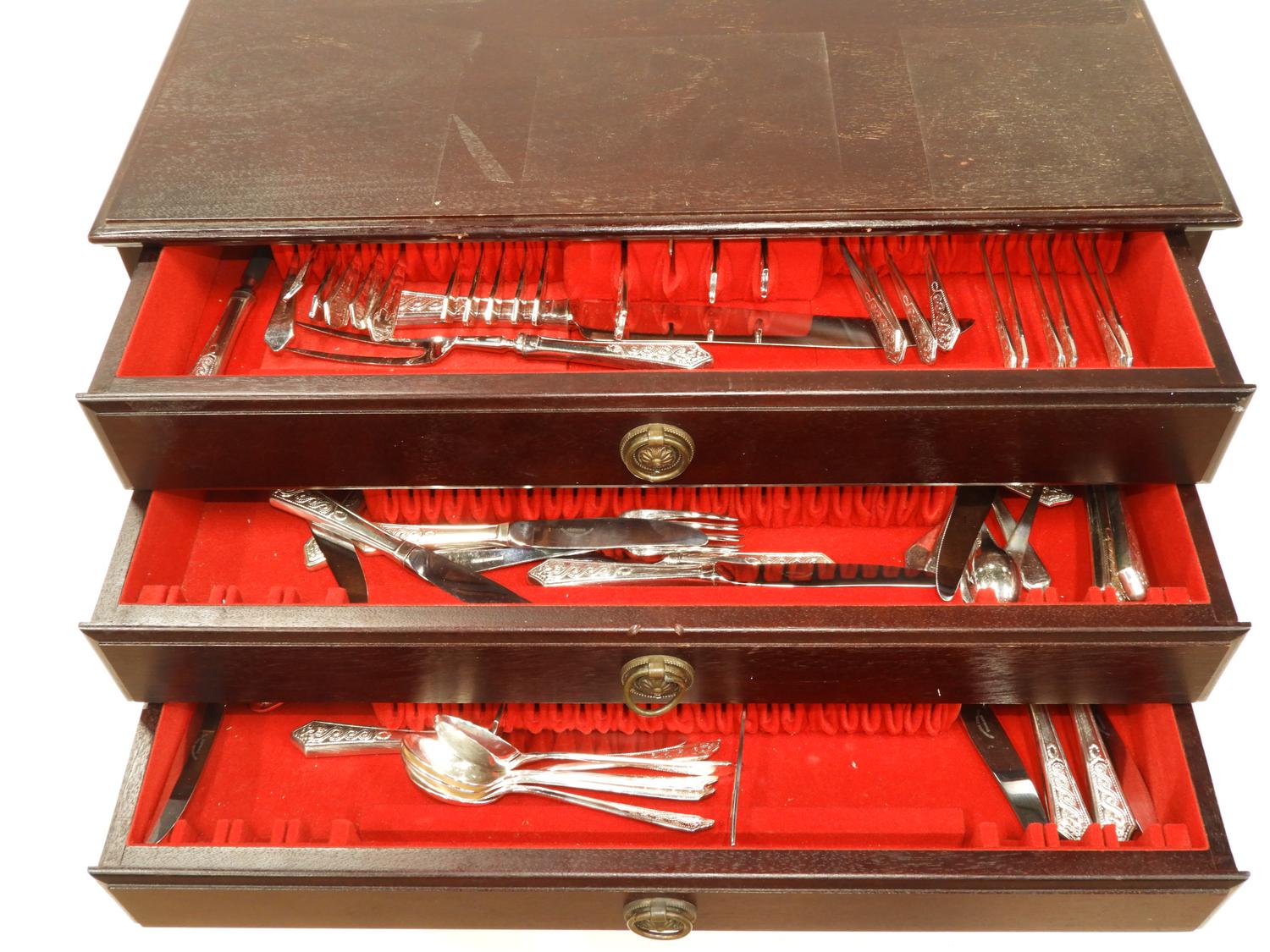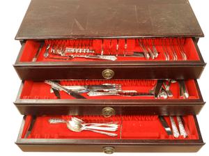 queen anne style mahogany finish silver table with large set of silver plate flatware