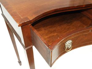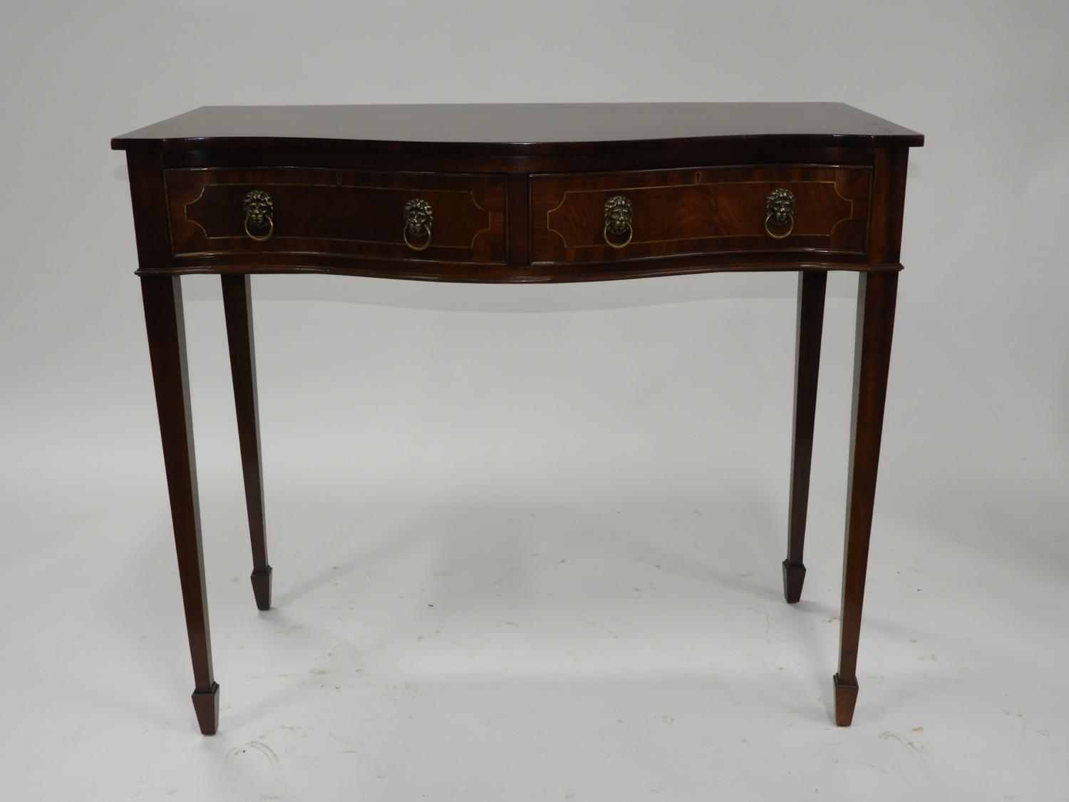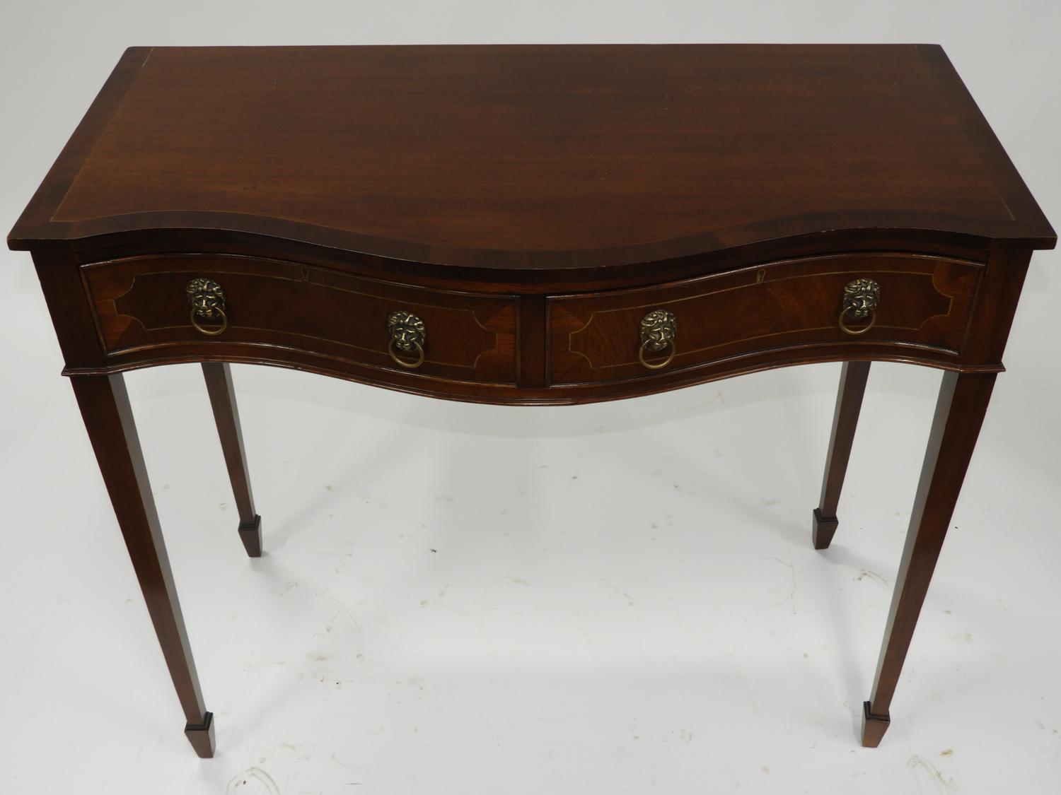 sheraton style brass inlaid mahogany serpentine side table, mid 20th century, 34" x 39 1/2" x 17 1/2"