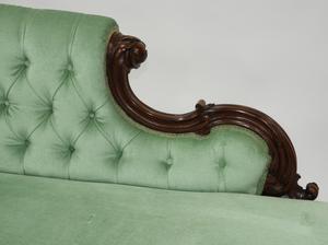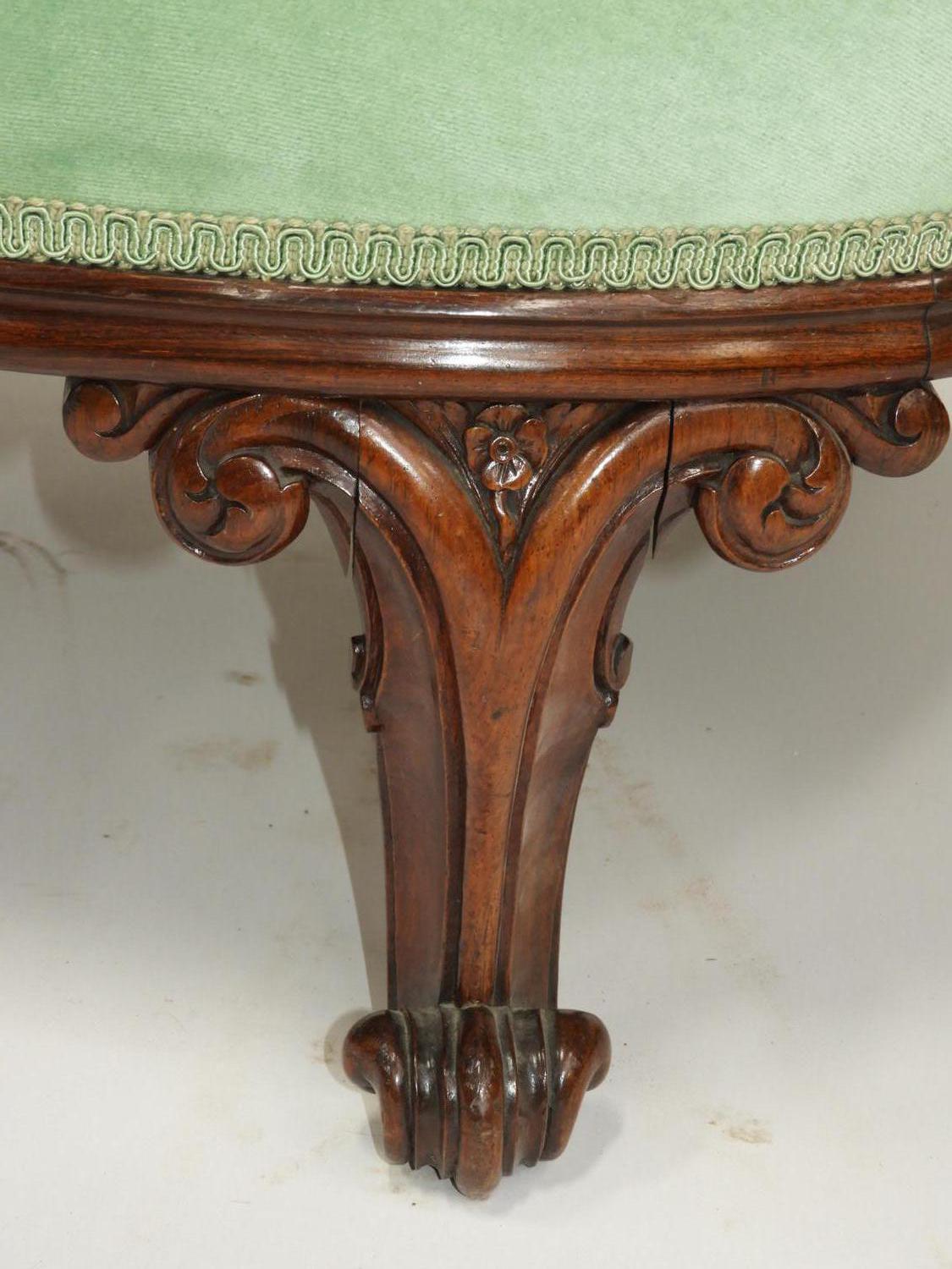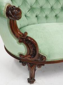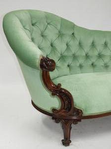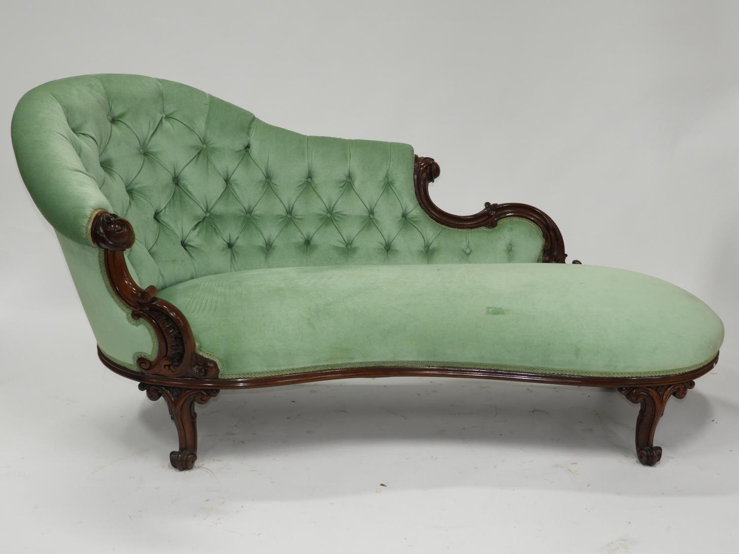 early victorian carved mahogany upholstered chaise longe, mid 19th century, 36" x 76" x 33"