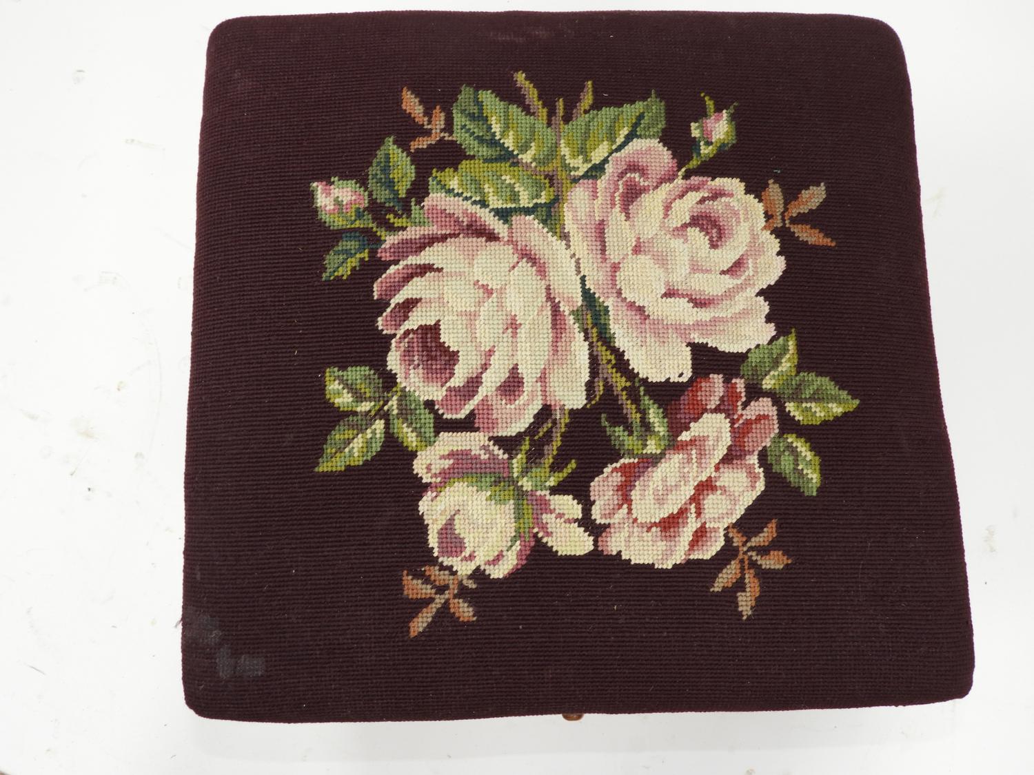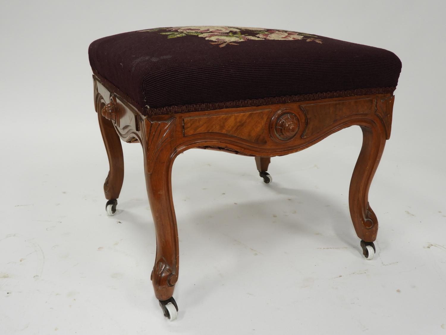 late 19th century needlepoint upholstered walnut footstool, 17" x 19" x 18"
