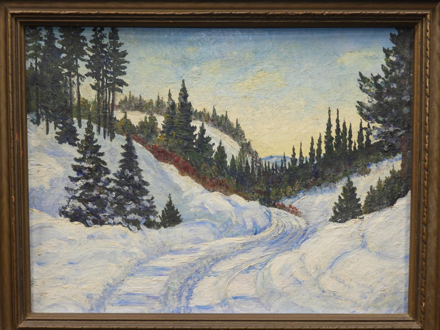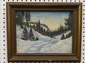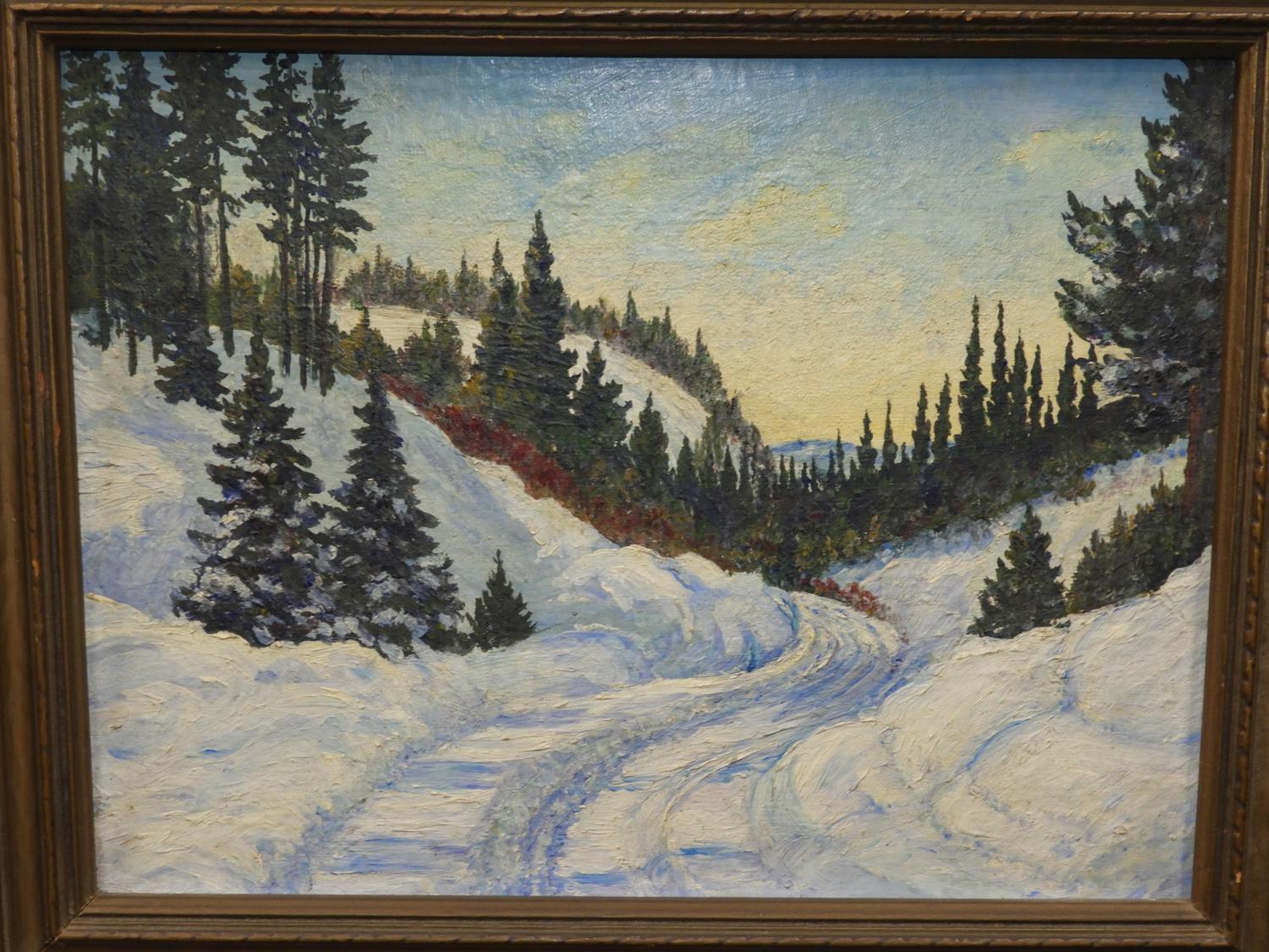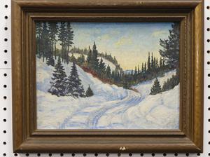 canadian school oil on board, unsigned, 10" x 13", "winter landscape"