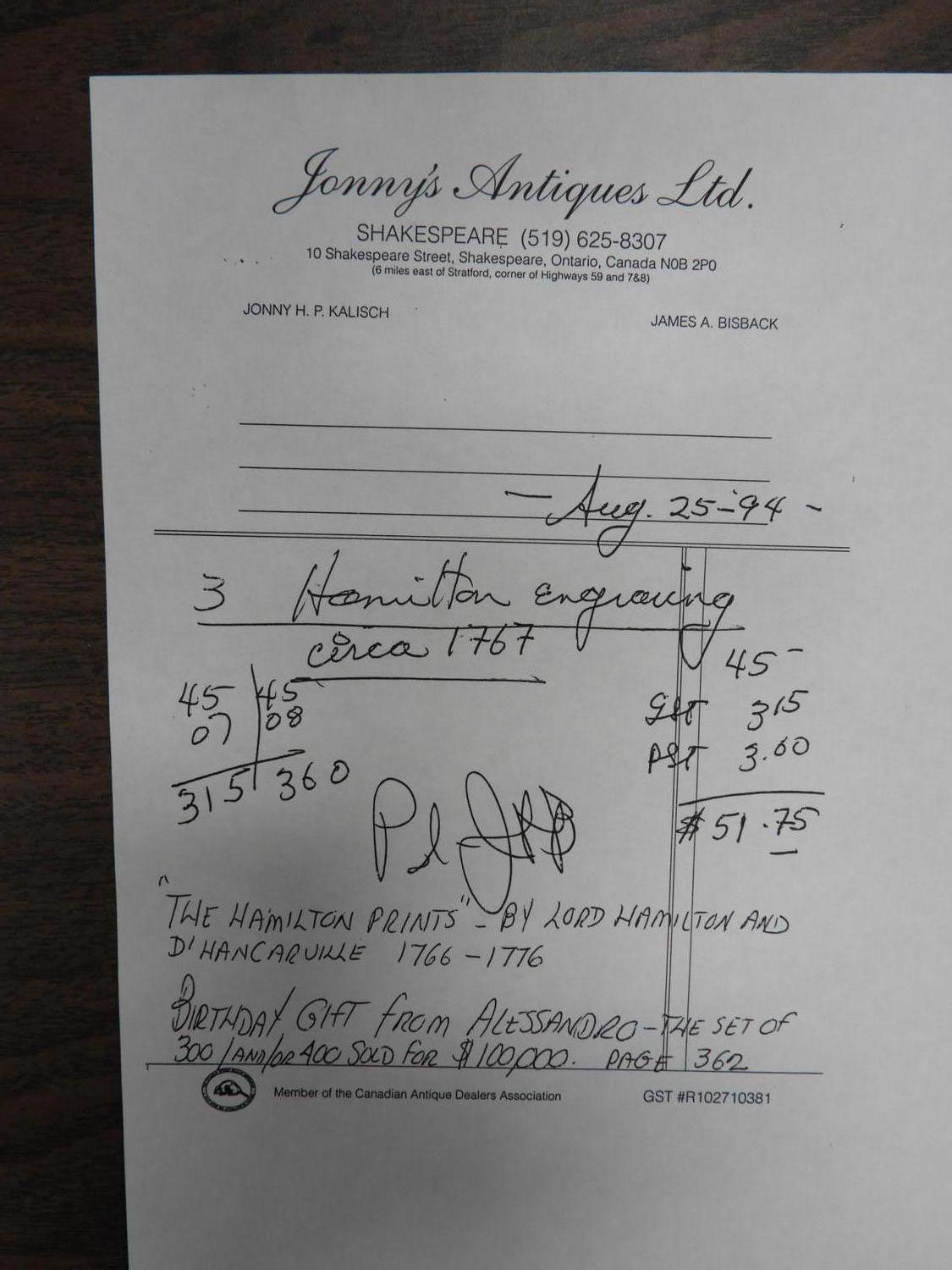 three 18th century "lord hamilton prints" c.1766-1776, unframed, sheet 19" x 14 1/2", with another 3 antique prints and provenance