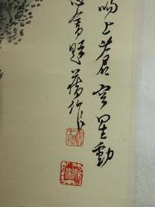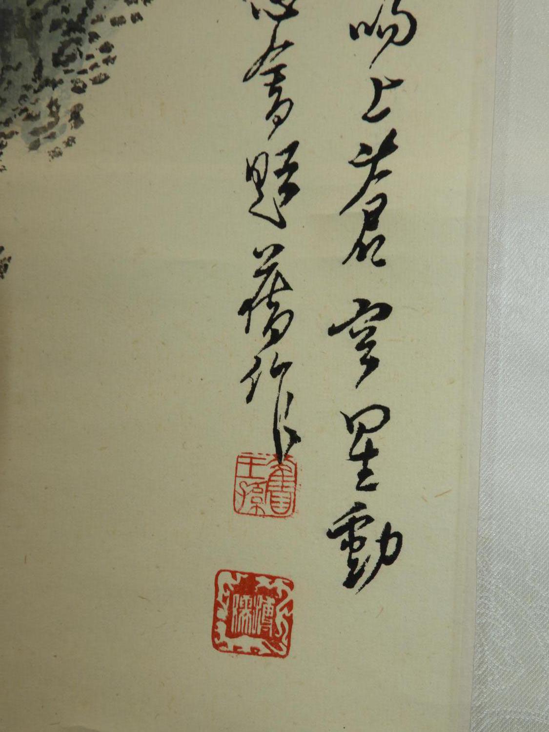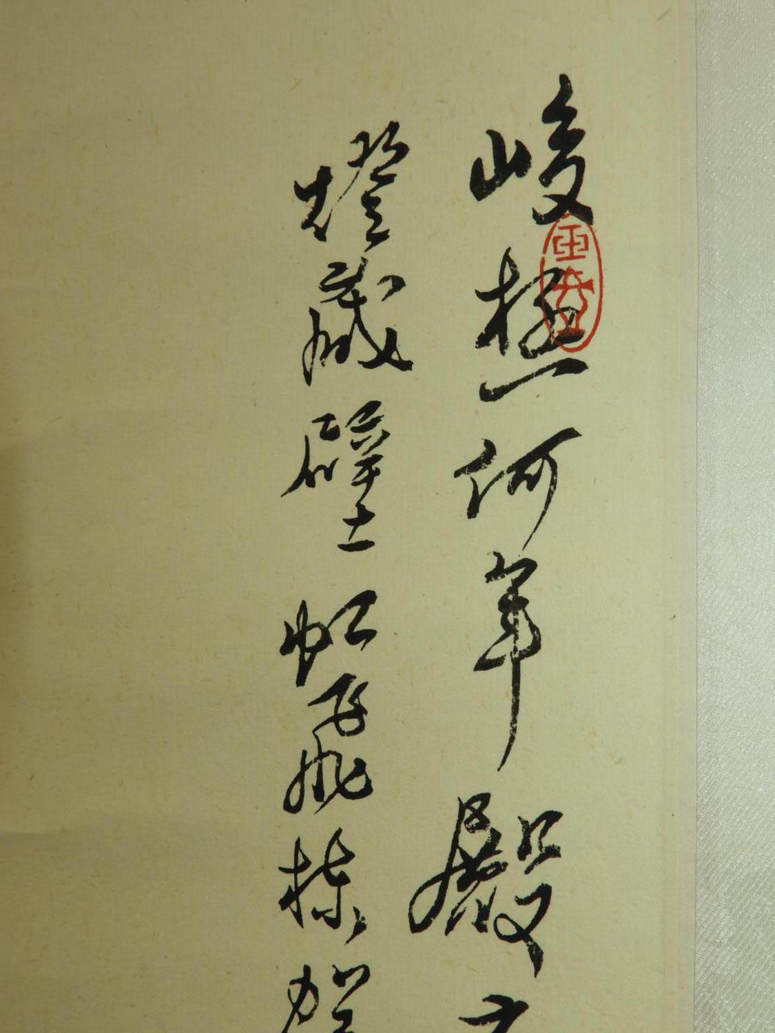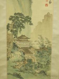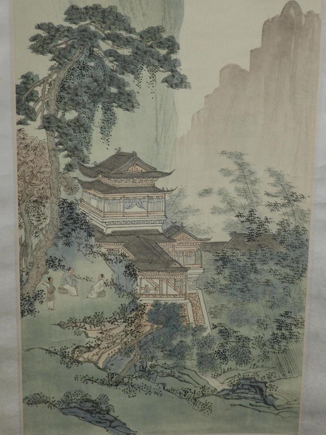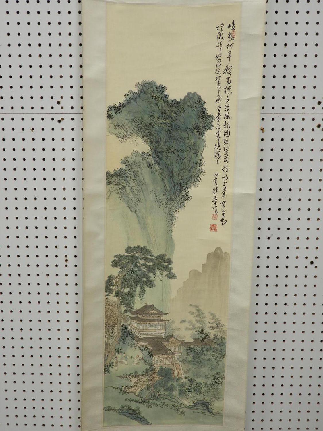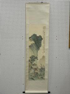 chinese watercolour scroll painting, 20th century, signed, 69" x 17 1/2", "mountain landscape with building"