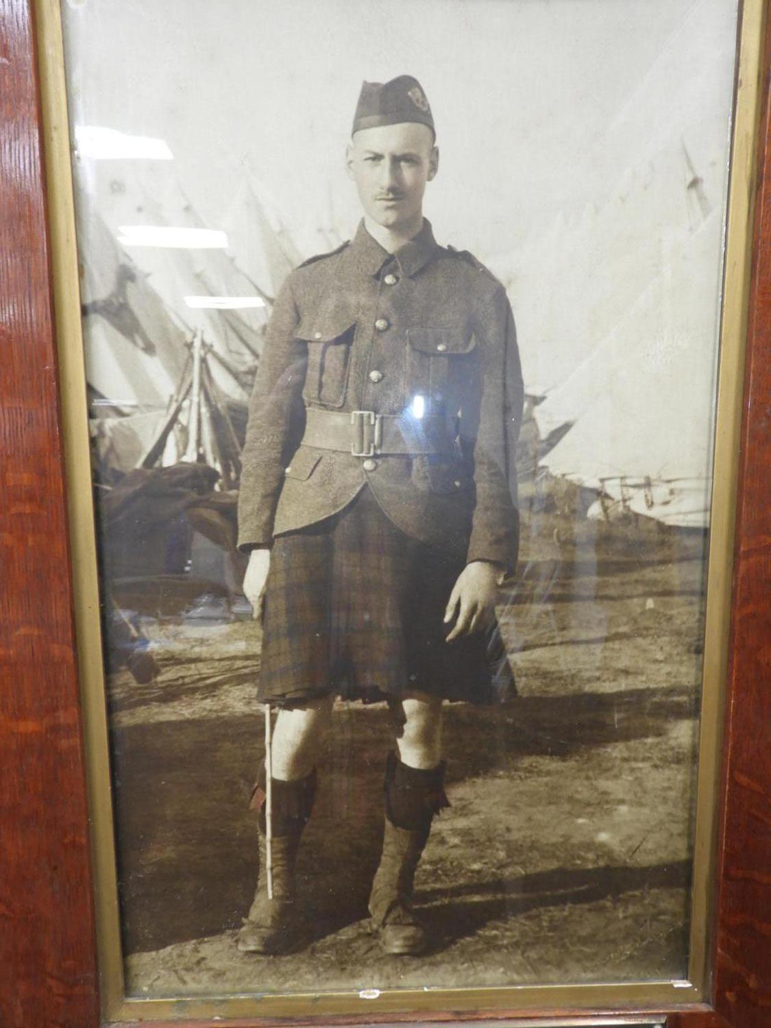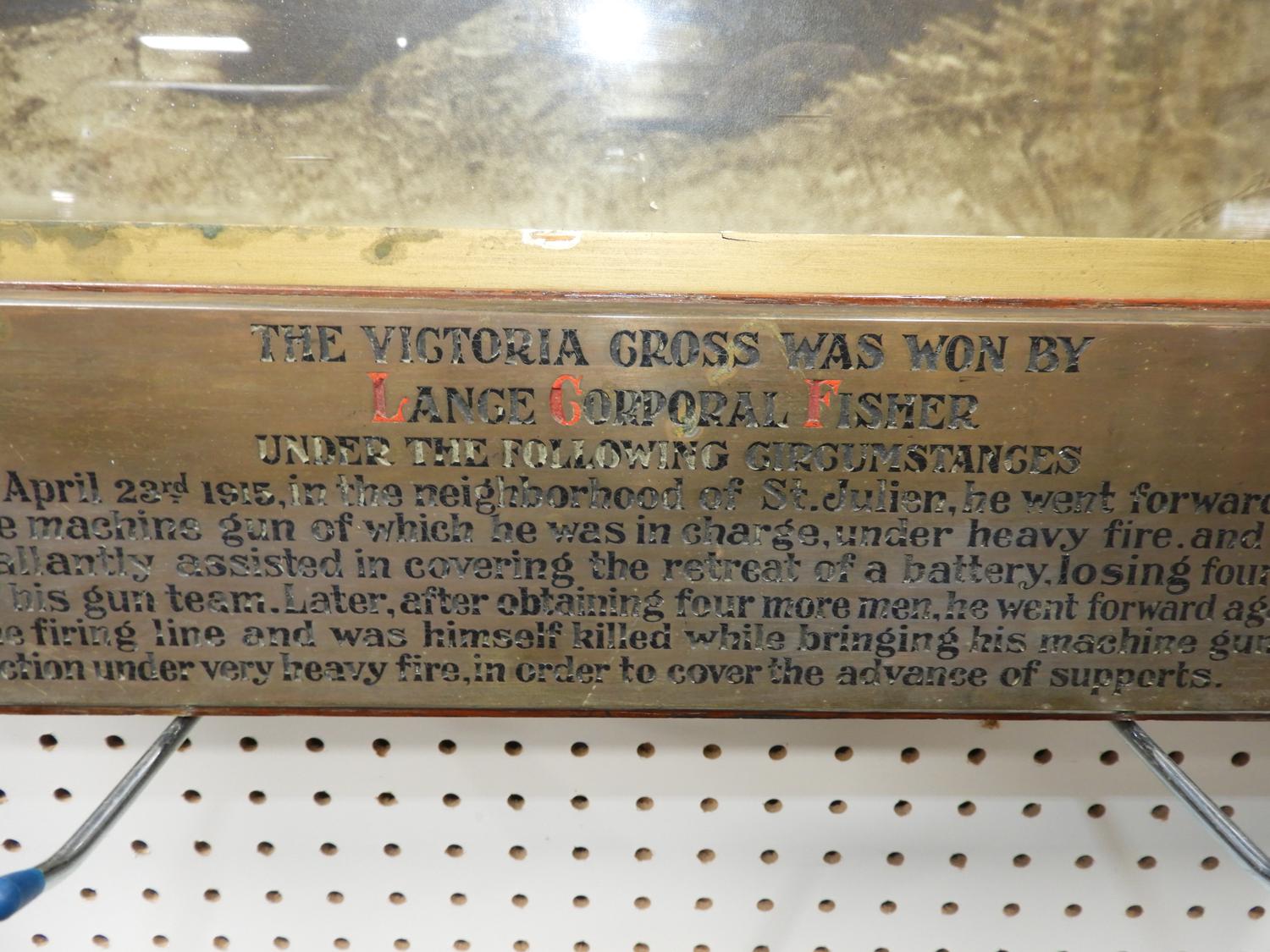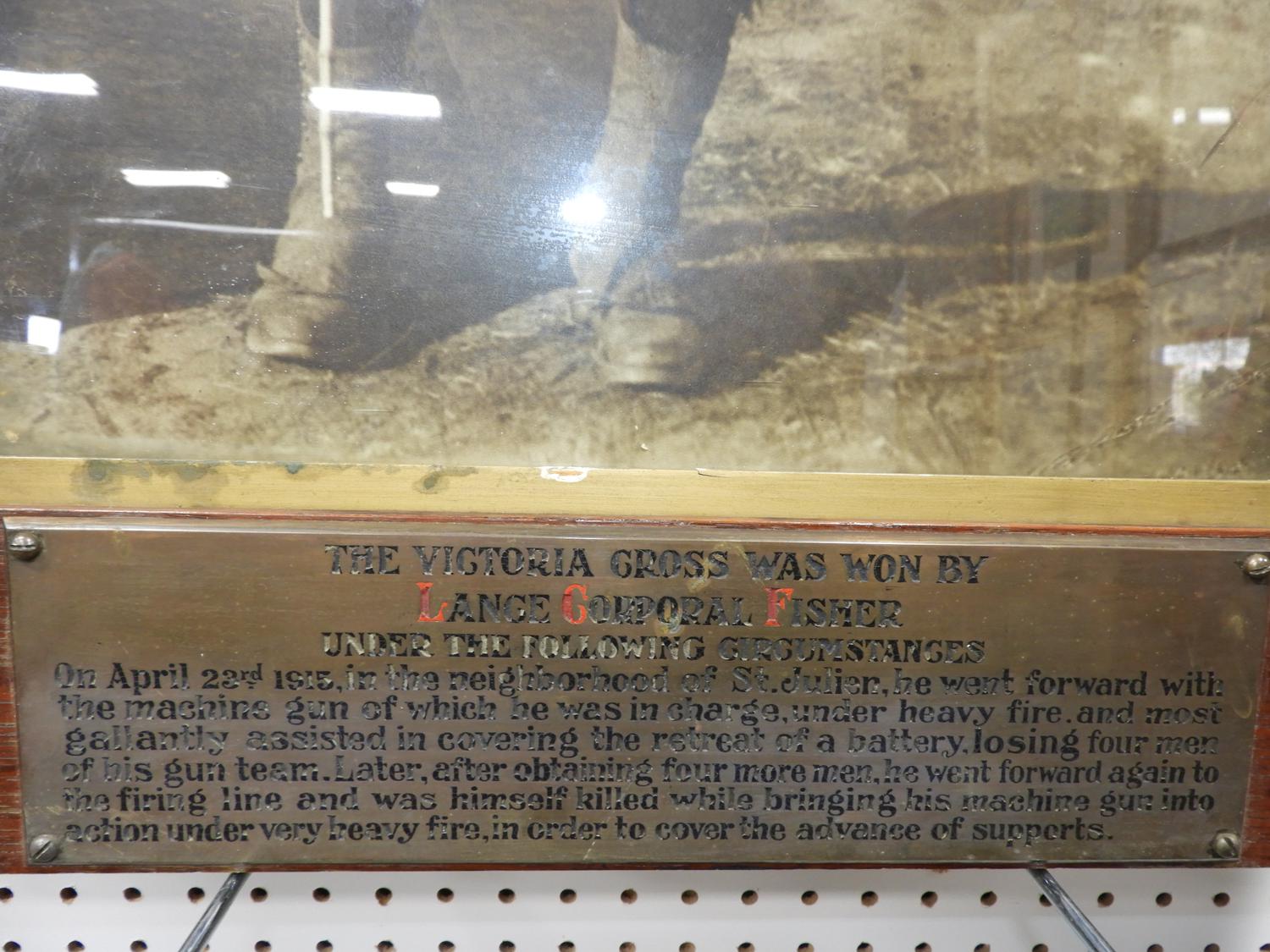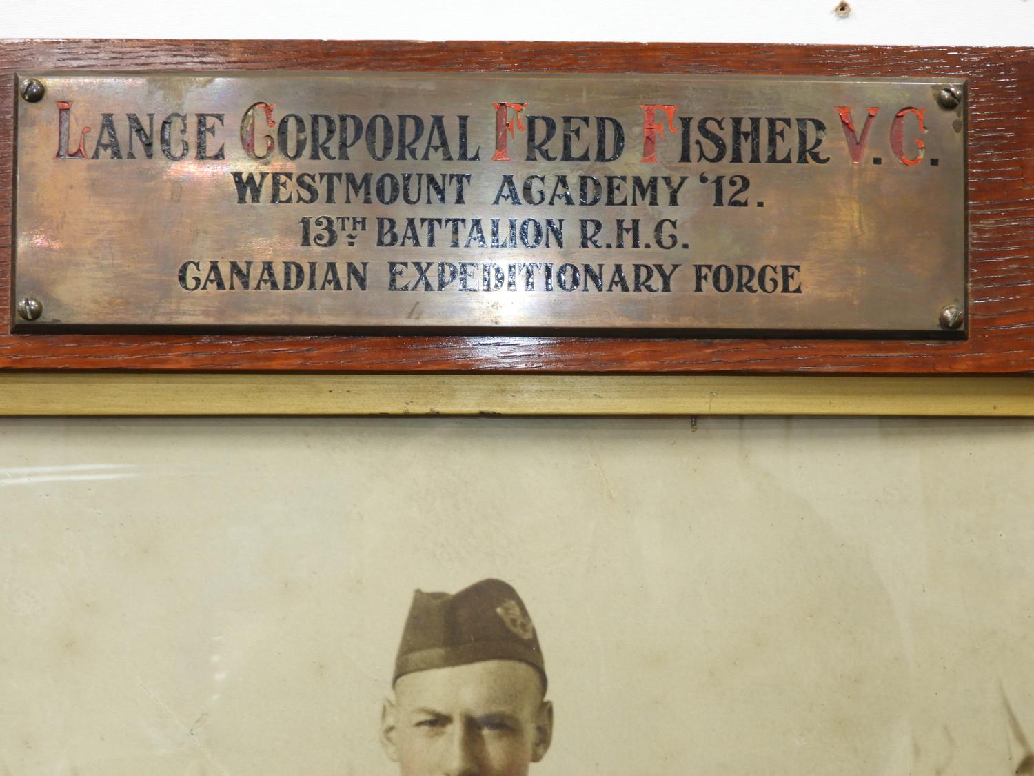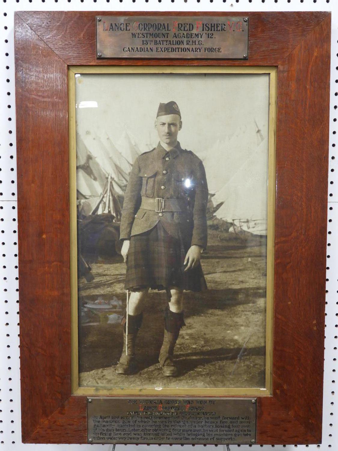 oak framed honorary photograph of victoria cross recipient - lance corporal fred fisher, westmount academy 12 13th battalion r. h. g. canadian expeditionary force, overall 33 1/2" x 24"