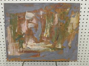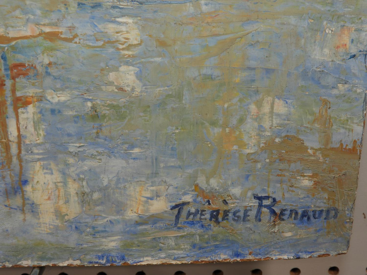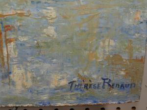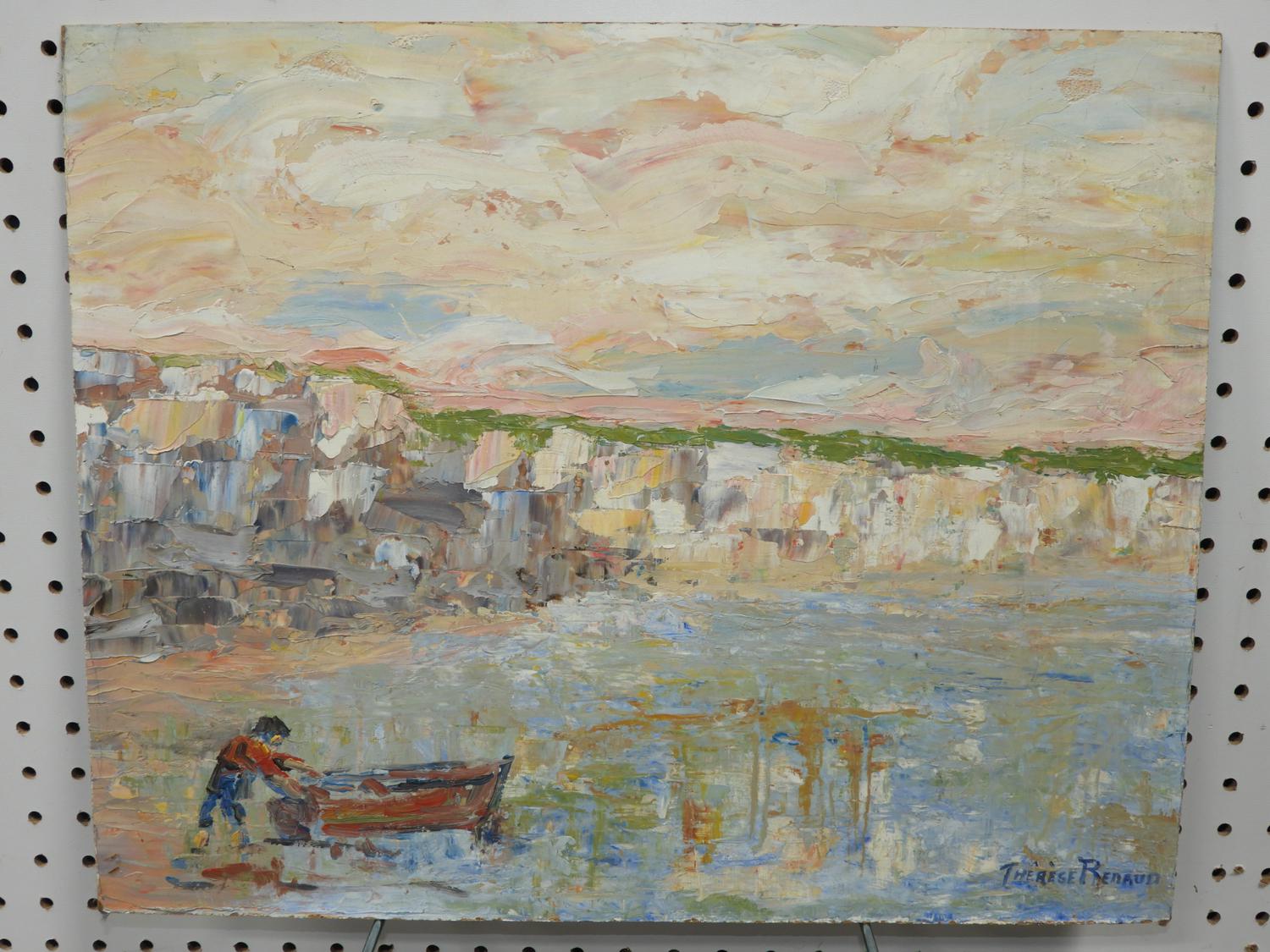 therese renaud, oil on board, 16" x 20", "shoreline landscape with boat"