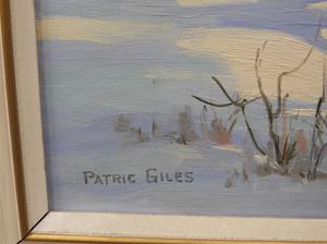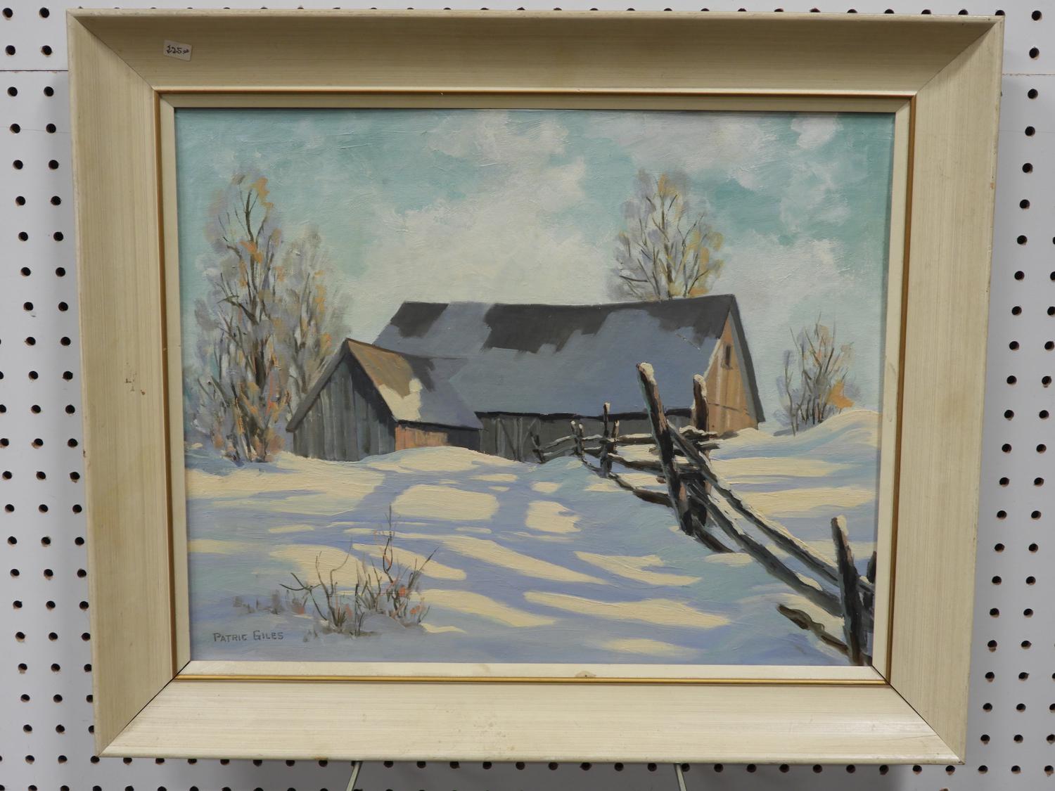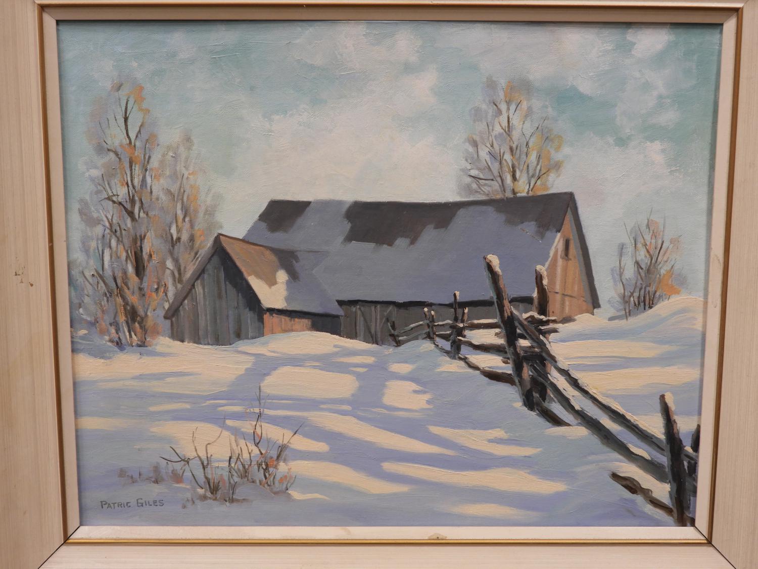patric giles, oil on board, 16" x 20", "winter scene with barn"