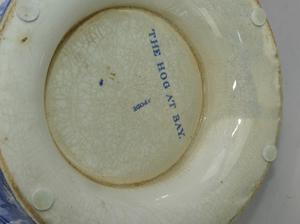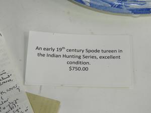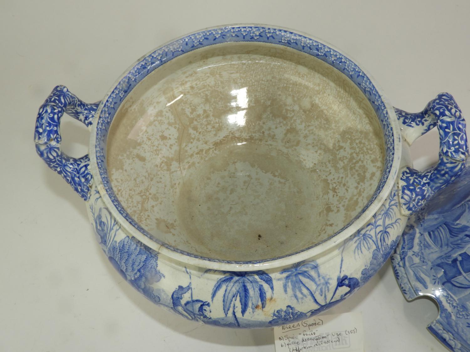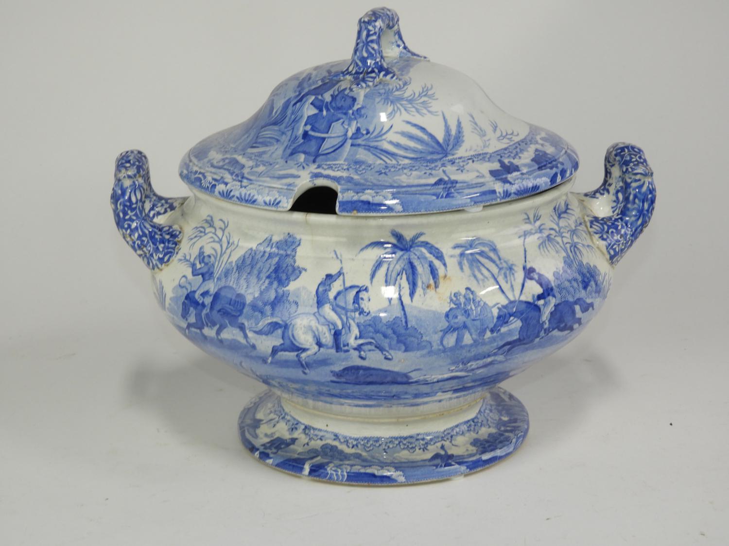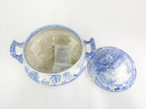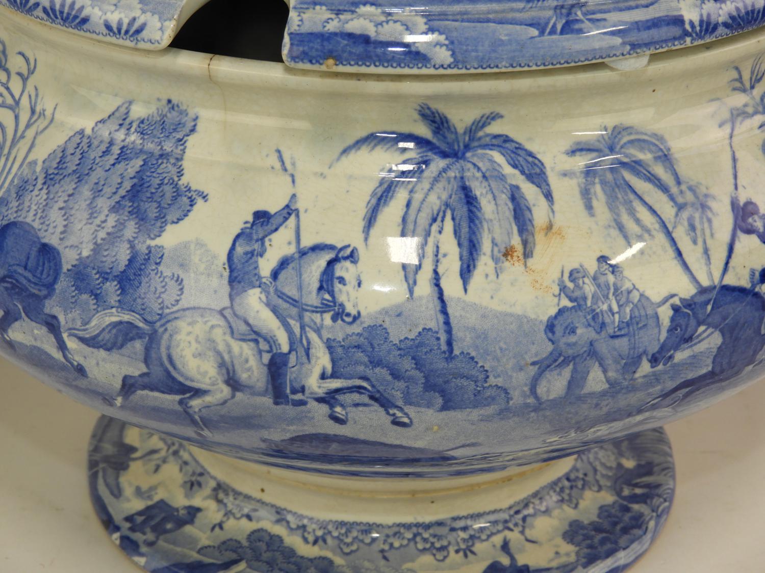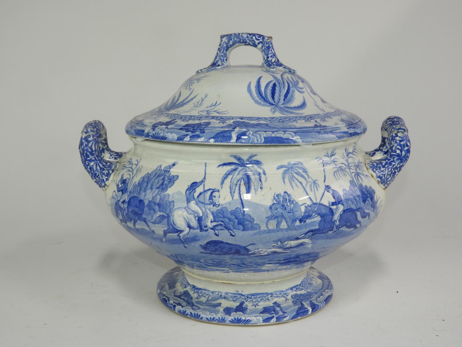 early 19th century spode "indian hunting a buffalo" pattern blue and white covered tureen, 11 1/2" x 13" x 11"