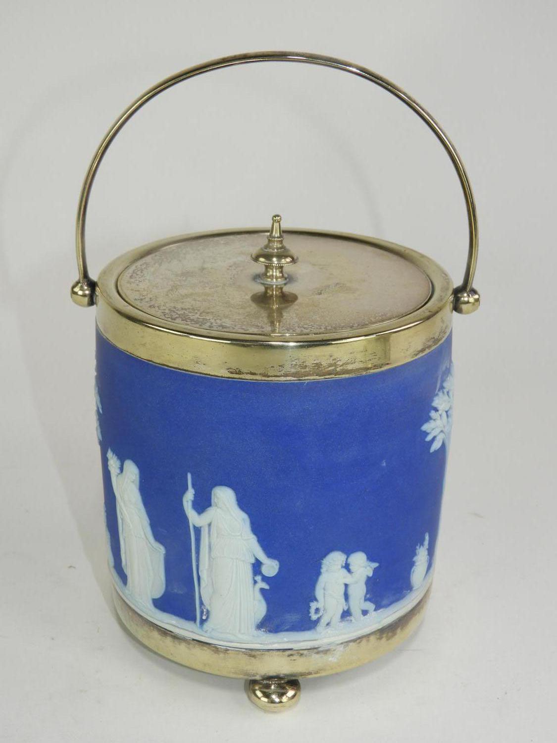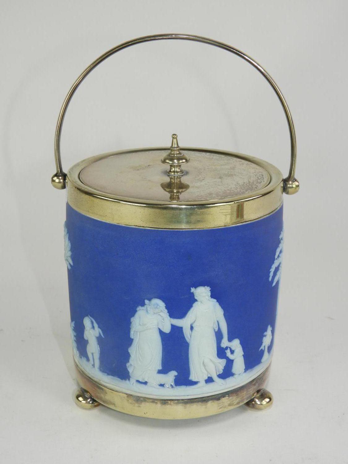wedgewood jasperware biscuit barrel with silver plate mounts, ht. 9"