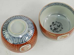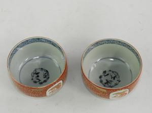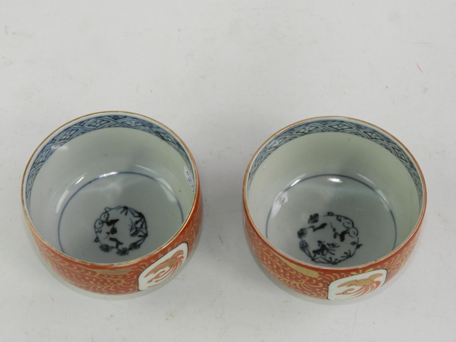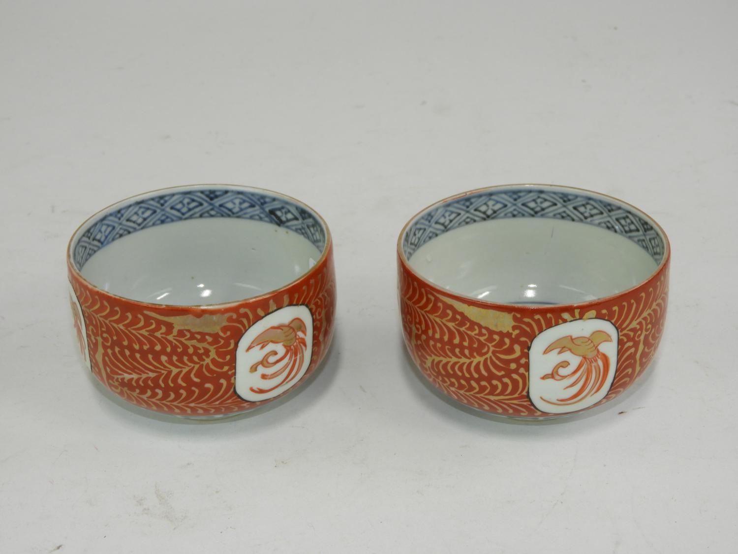 pair of japanese painted blue and white tea bowls, 2 1/4" x 3 1/2"
