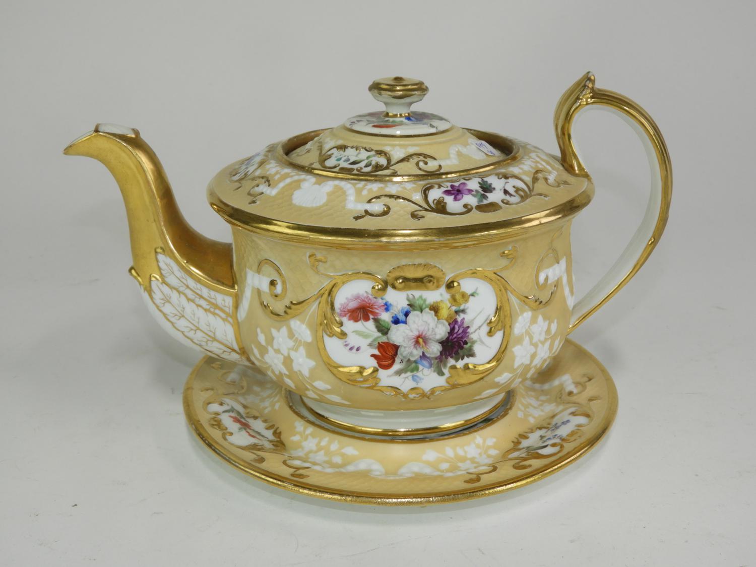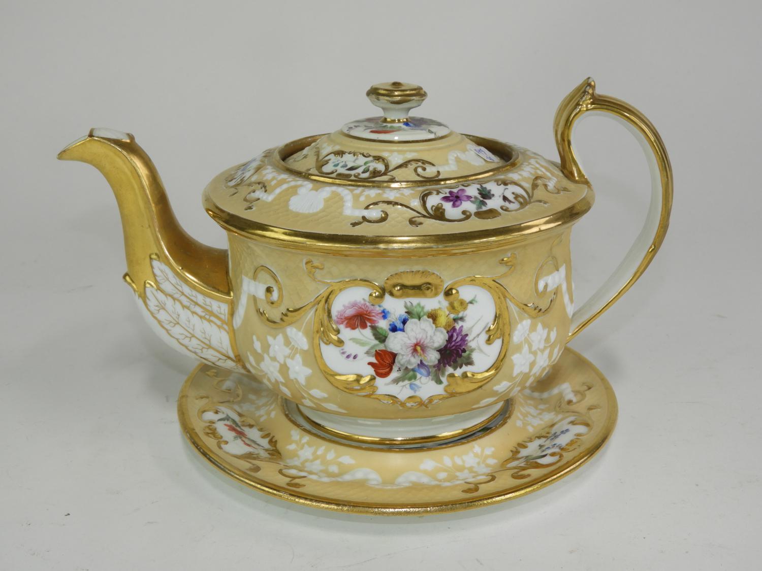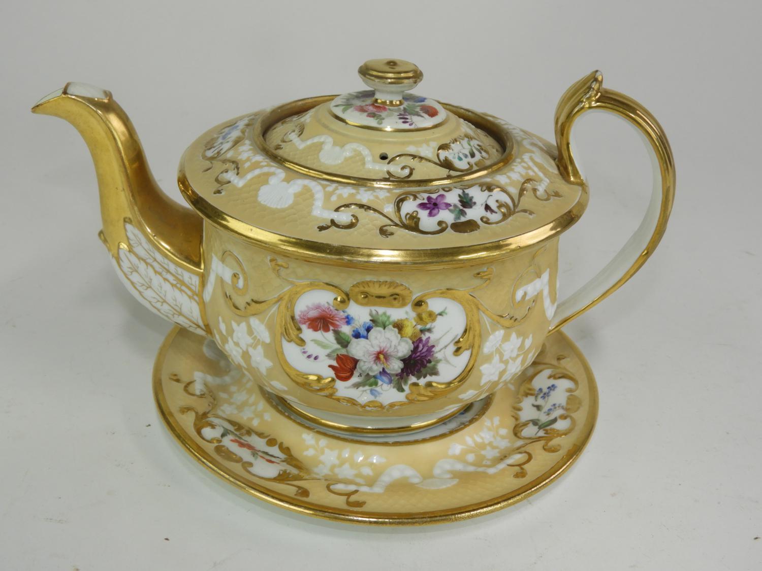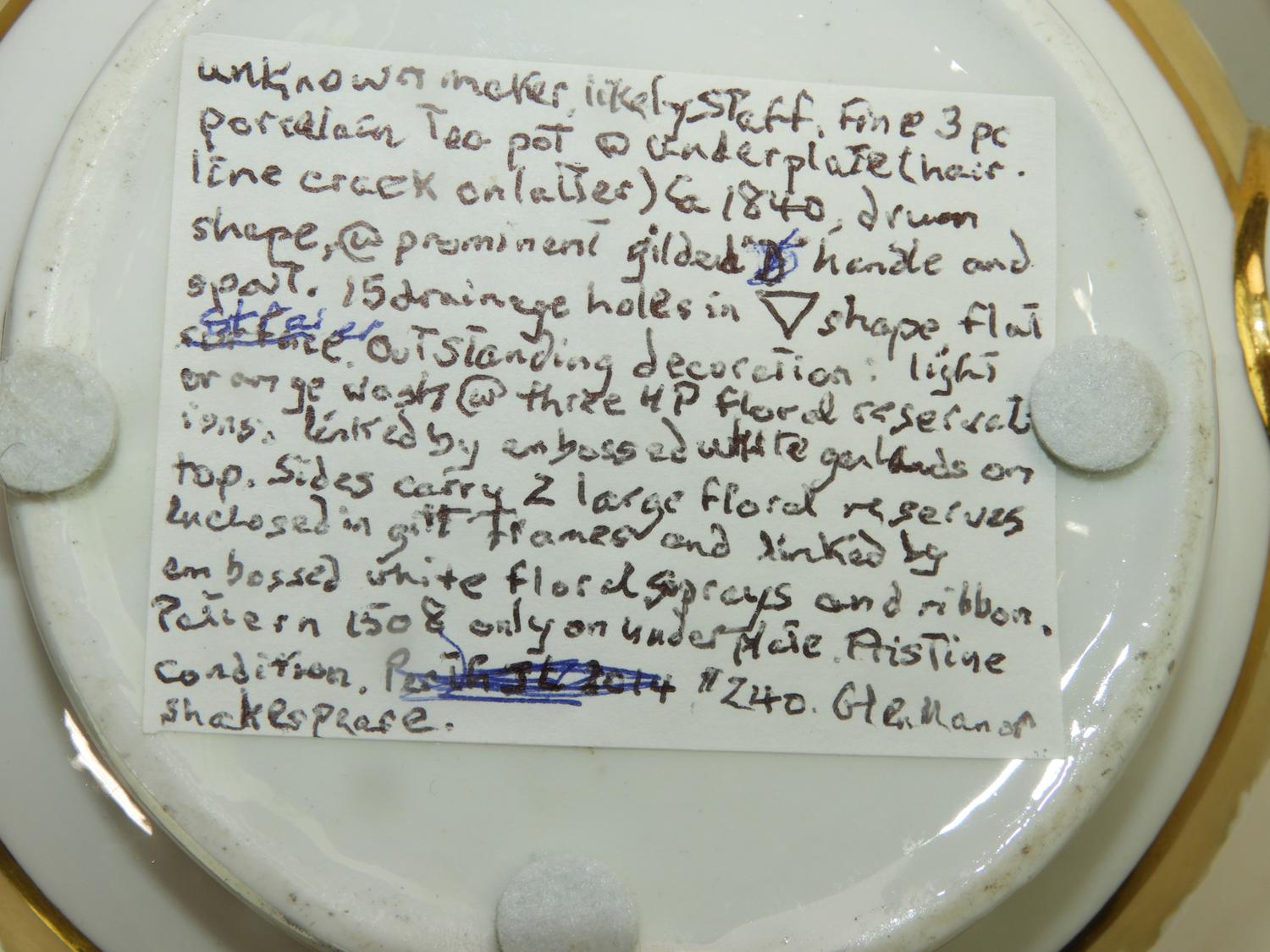 mid 19th century staffordshire tea pot on stand, 6 1/2" x 10"