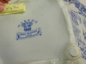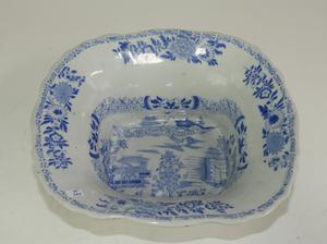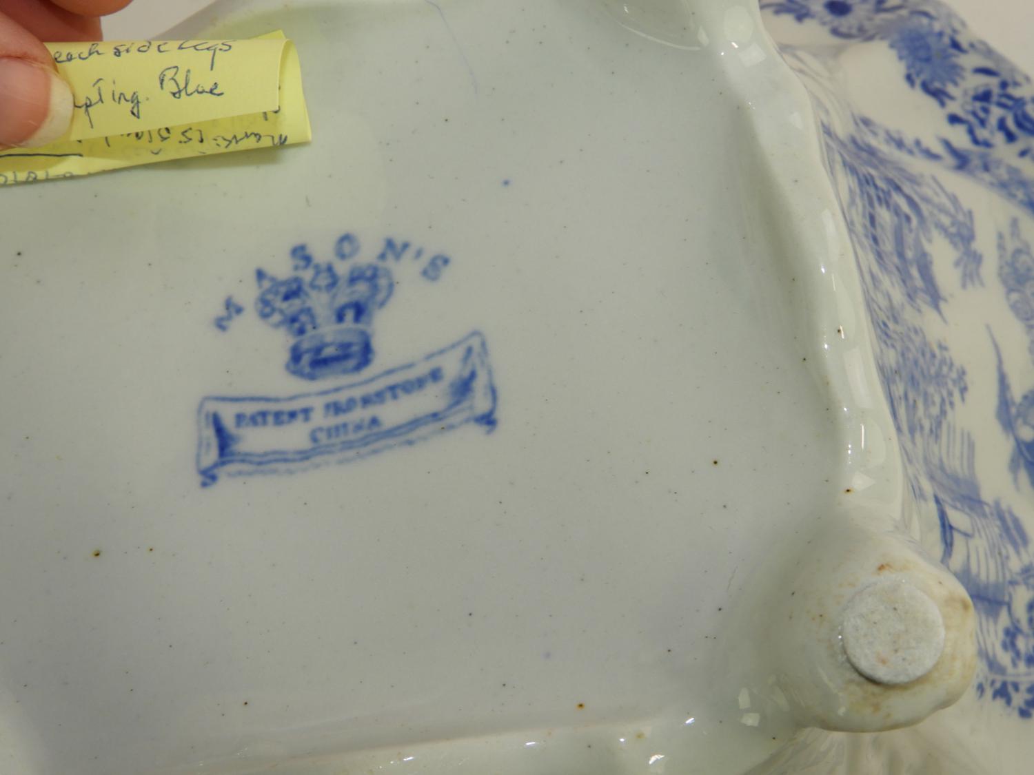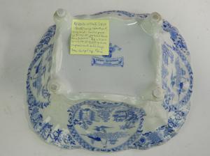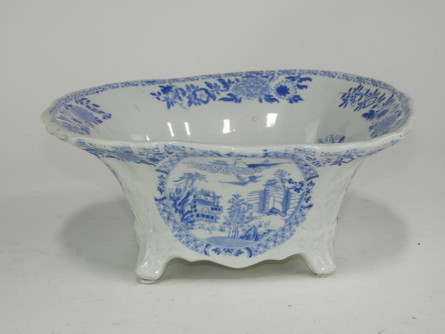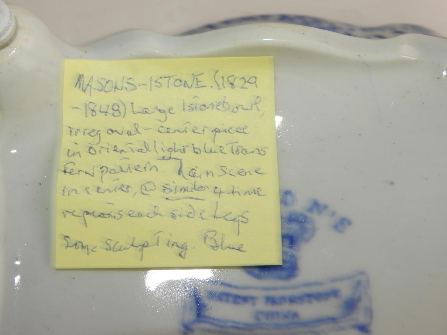 masons ironstone blue and white footed bowl, 5" x 10 1/2"