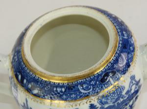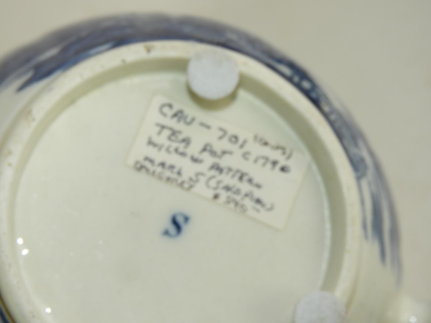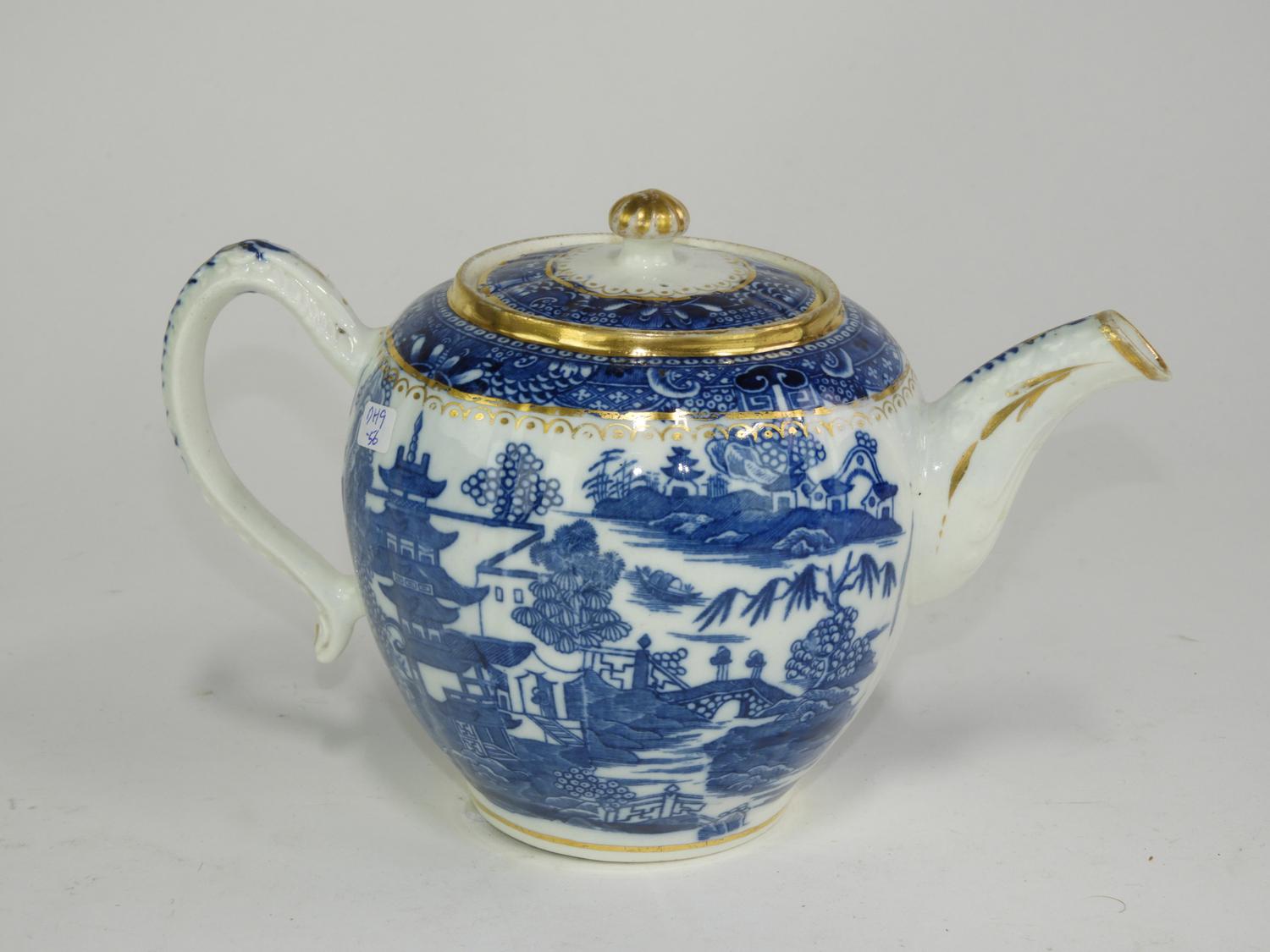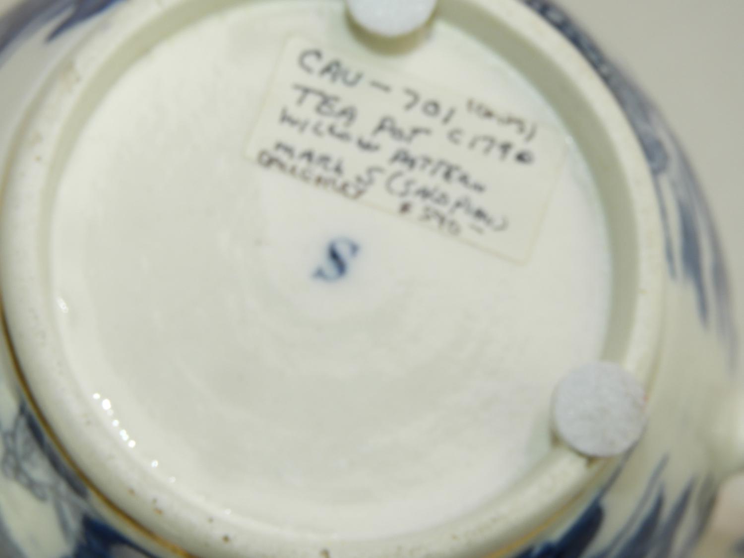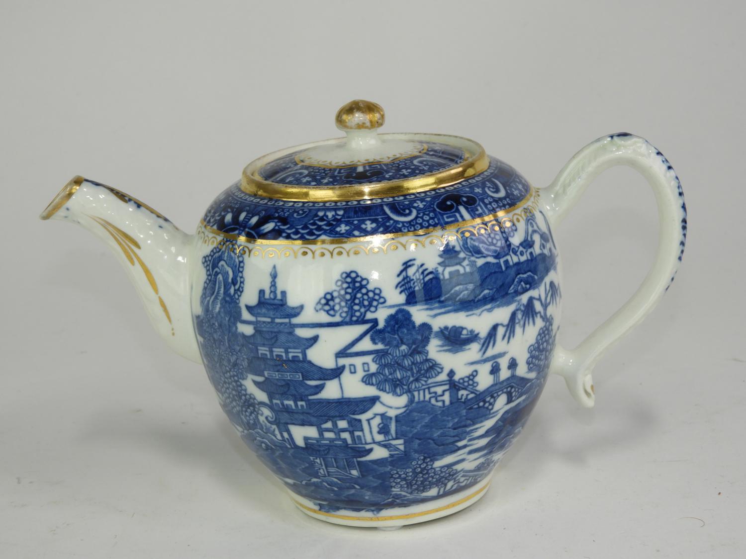caughley blue and white willow pattern tea pot, late 18th century, 6" x 9"