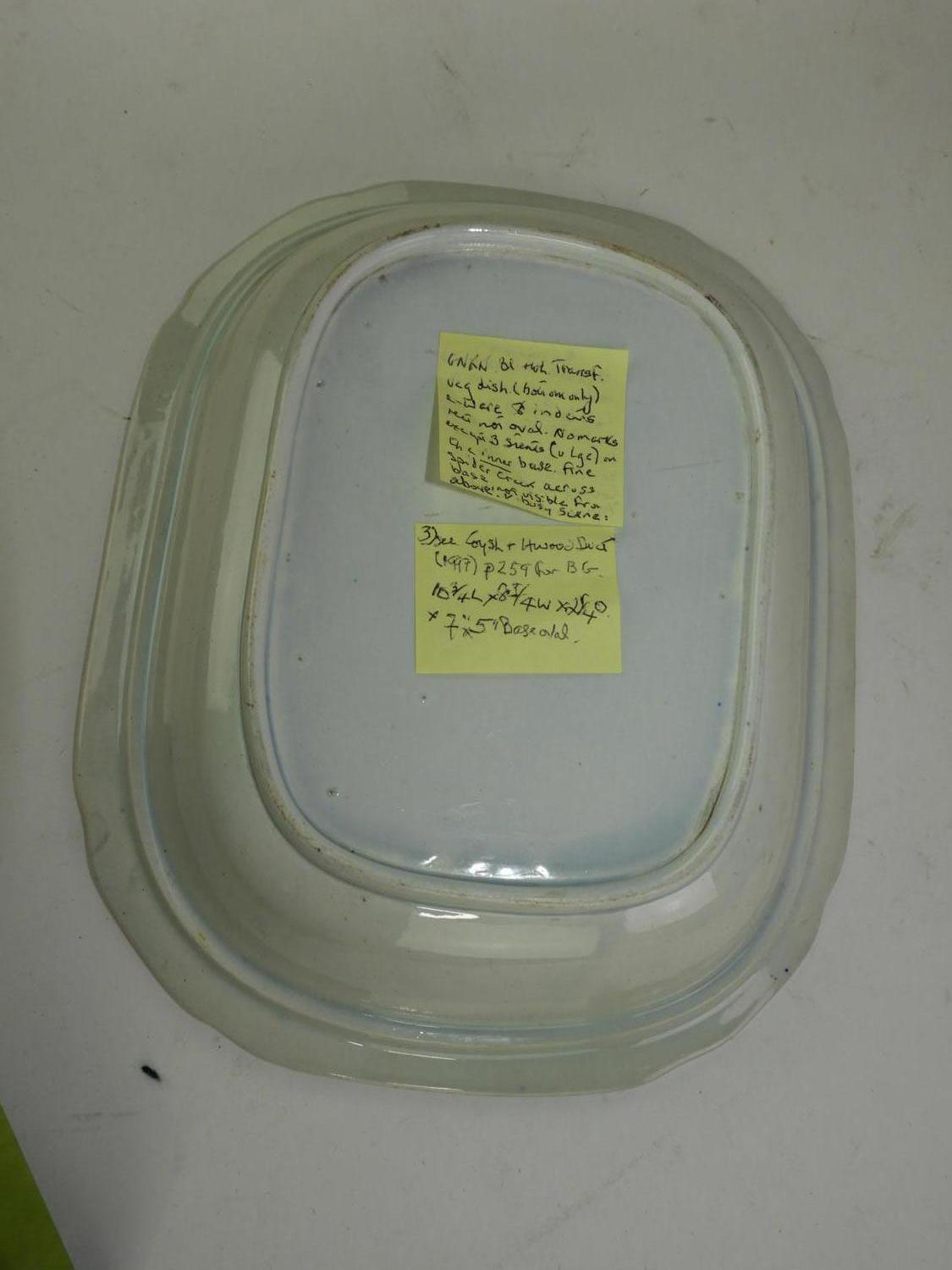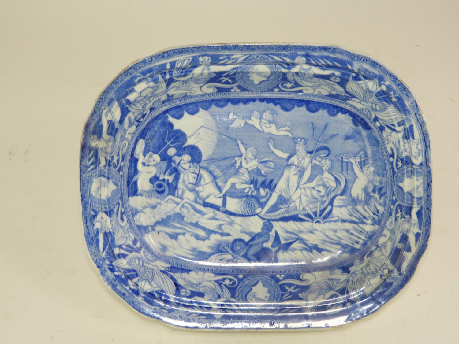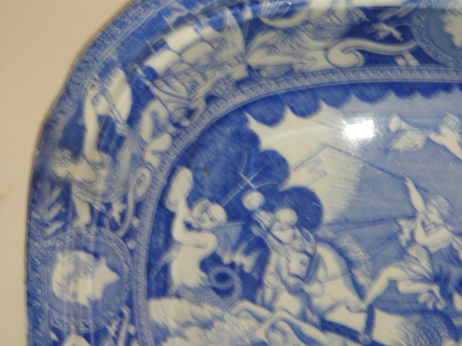 19th century blue and white veg dish, "britainne and neptune mouring the death of lord nelson" 2" x 10 3/4" x 8 3/4"