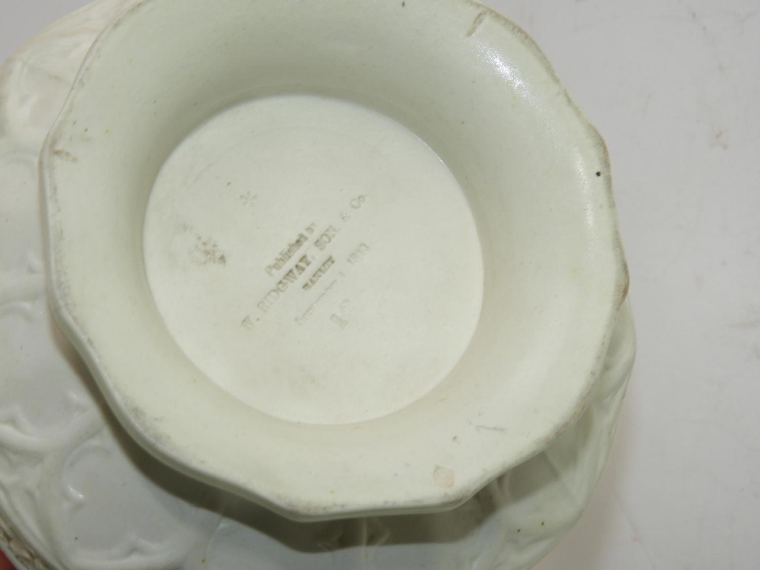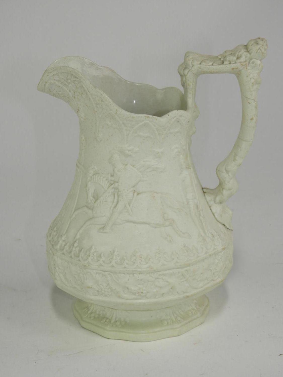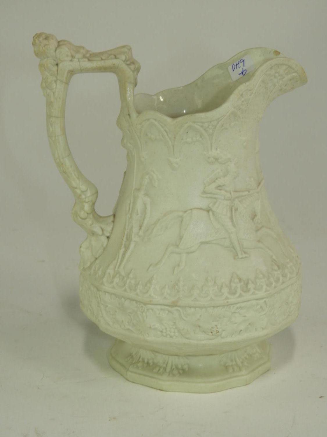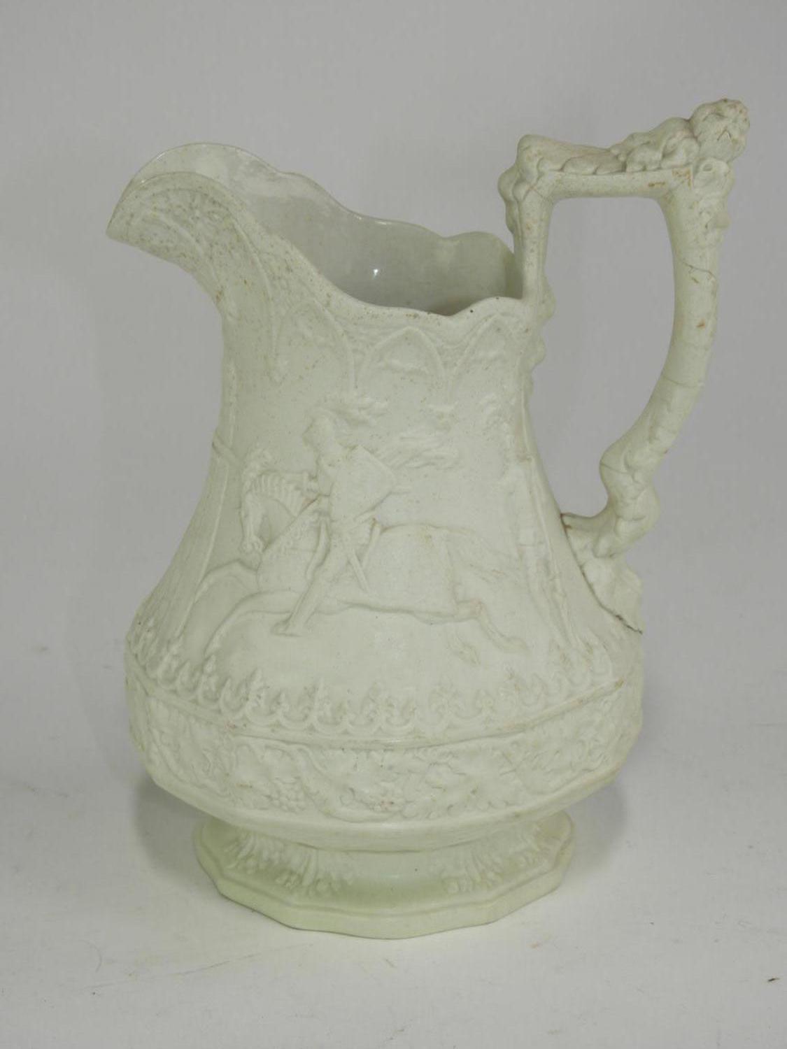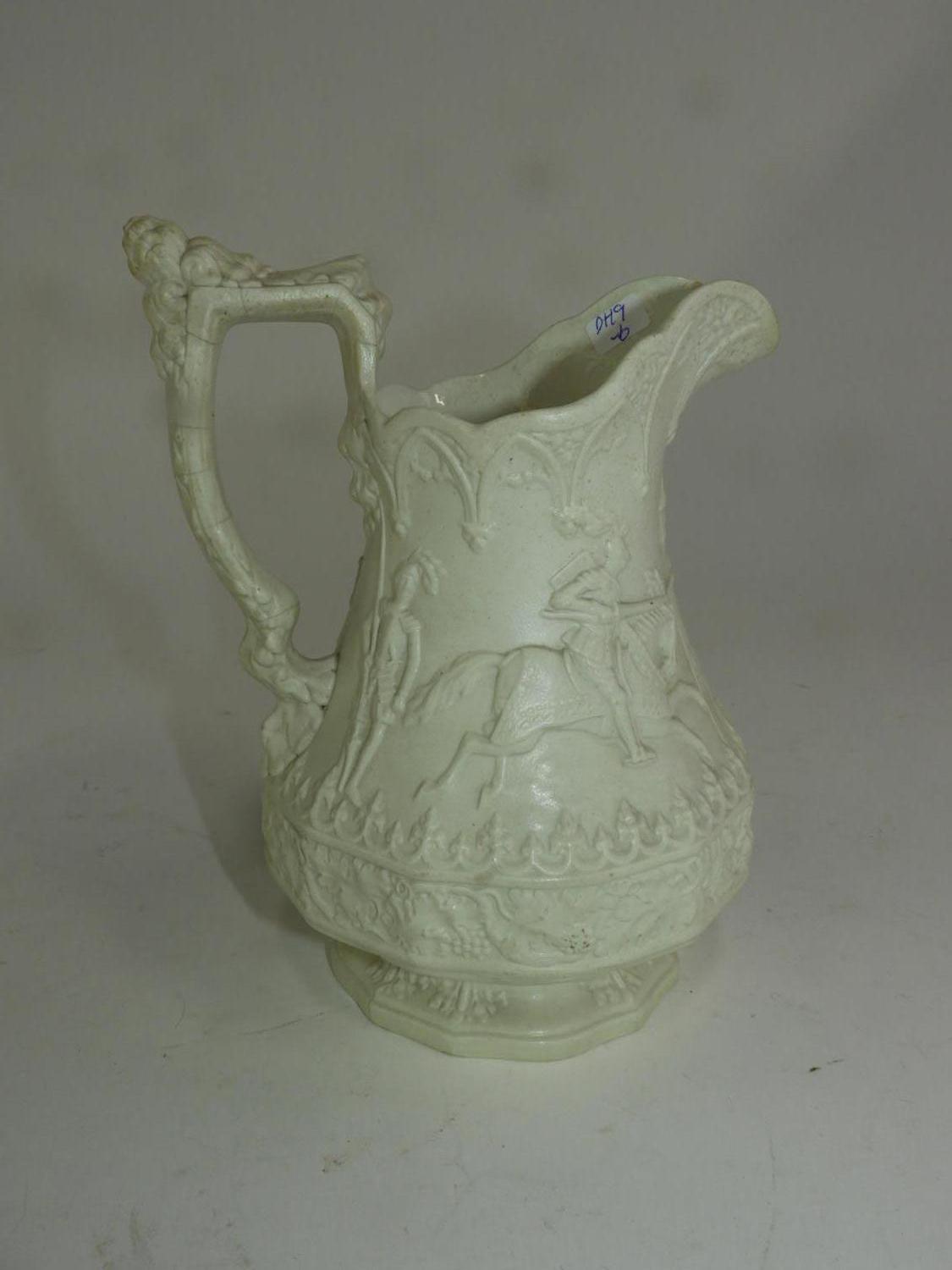 william ridgway & sons salt glazed "knights tournament" jug, ht. 7 1/2"