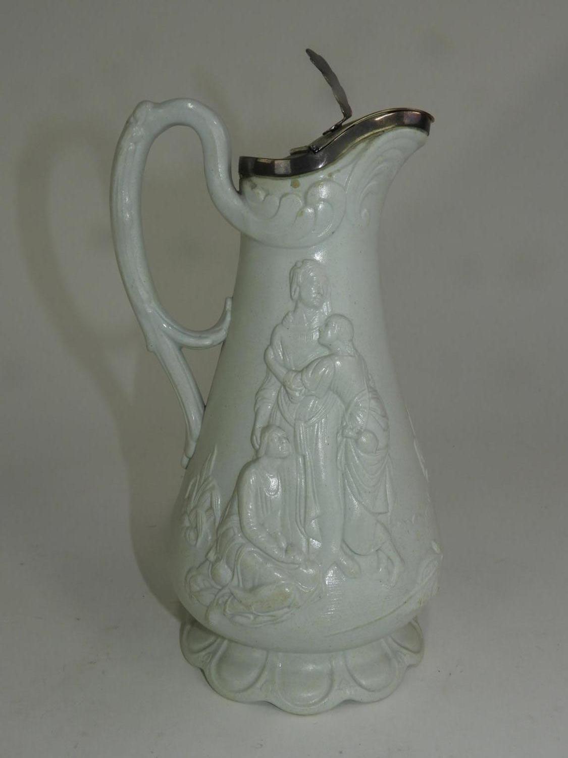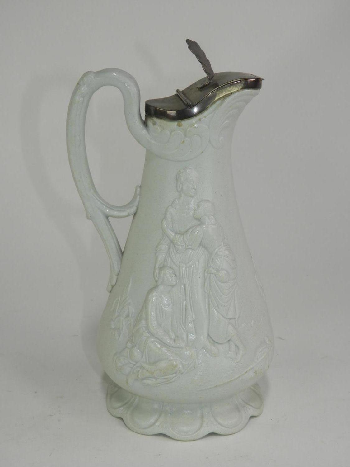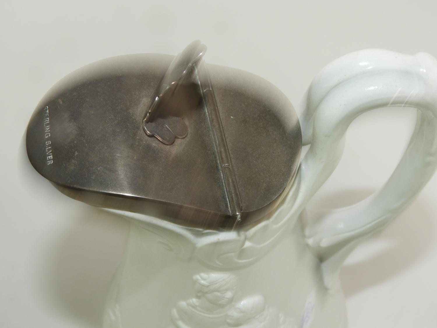 "naomi and her daughters-in-law" embossed salt glazed pitcher with sterling silver mount, ht. 10 1/2"