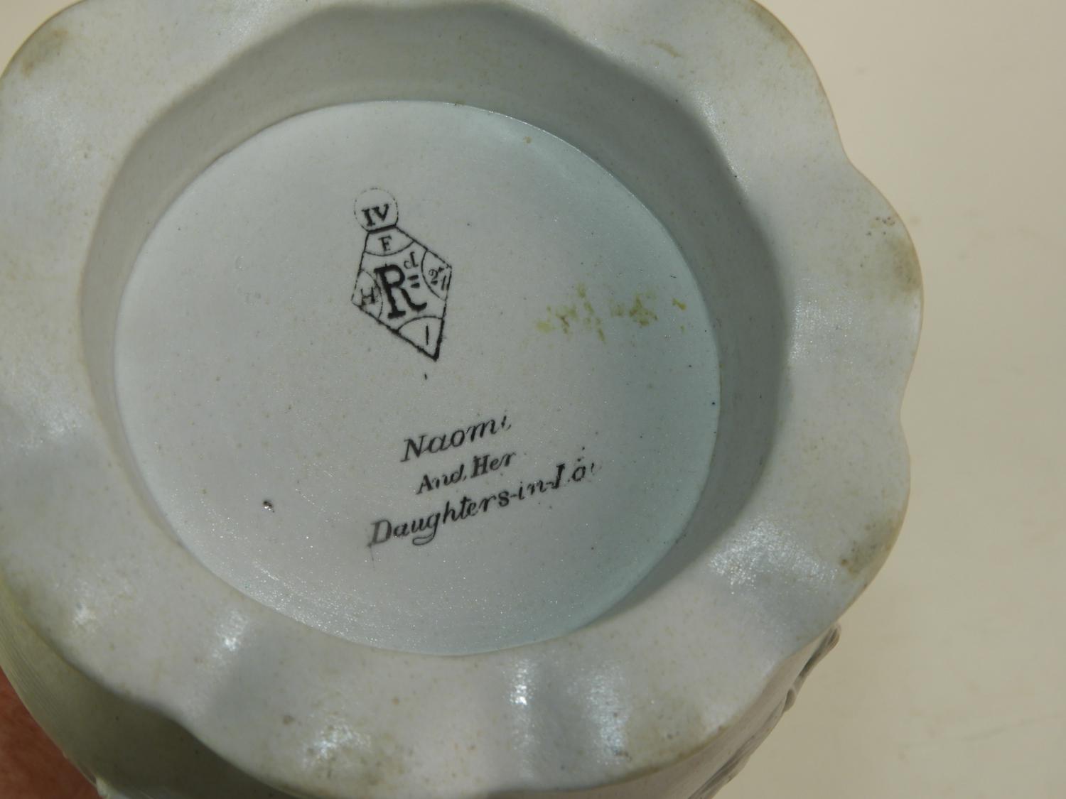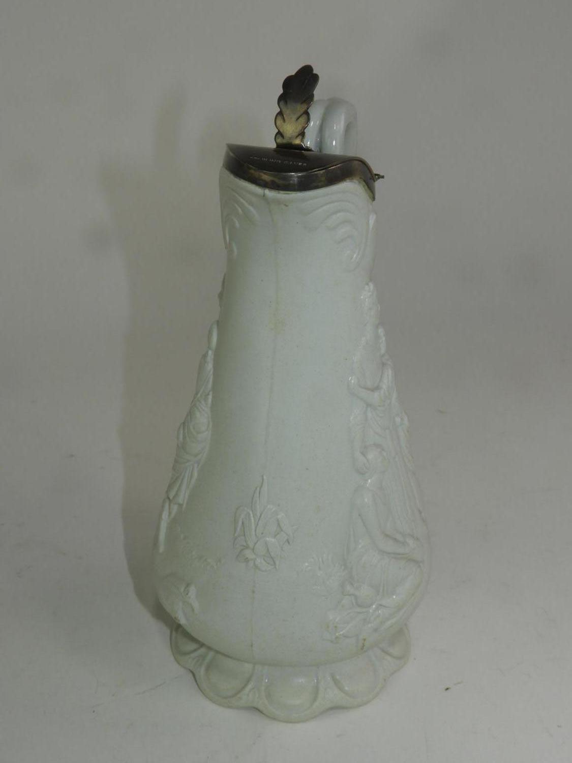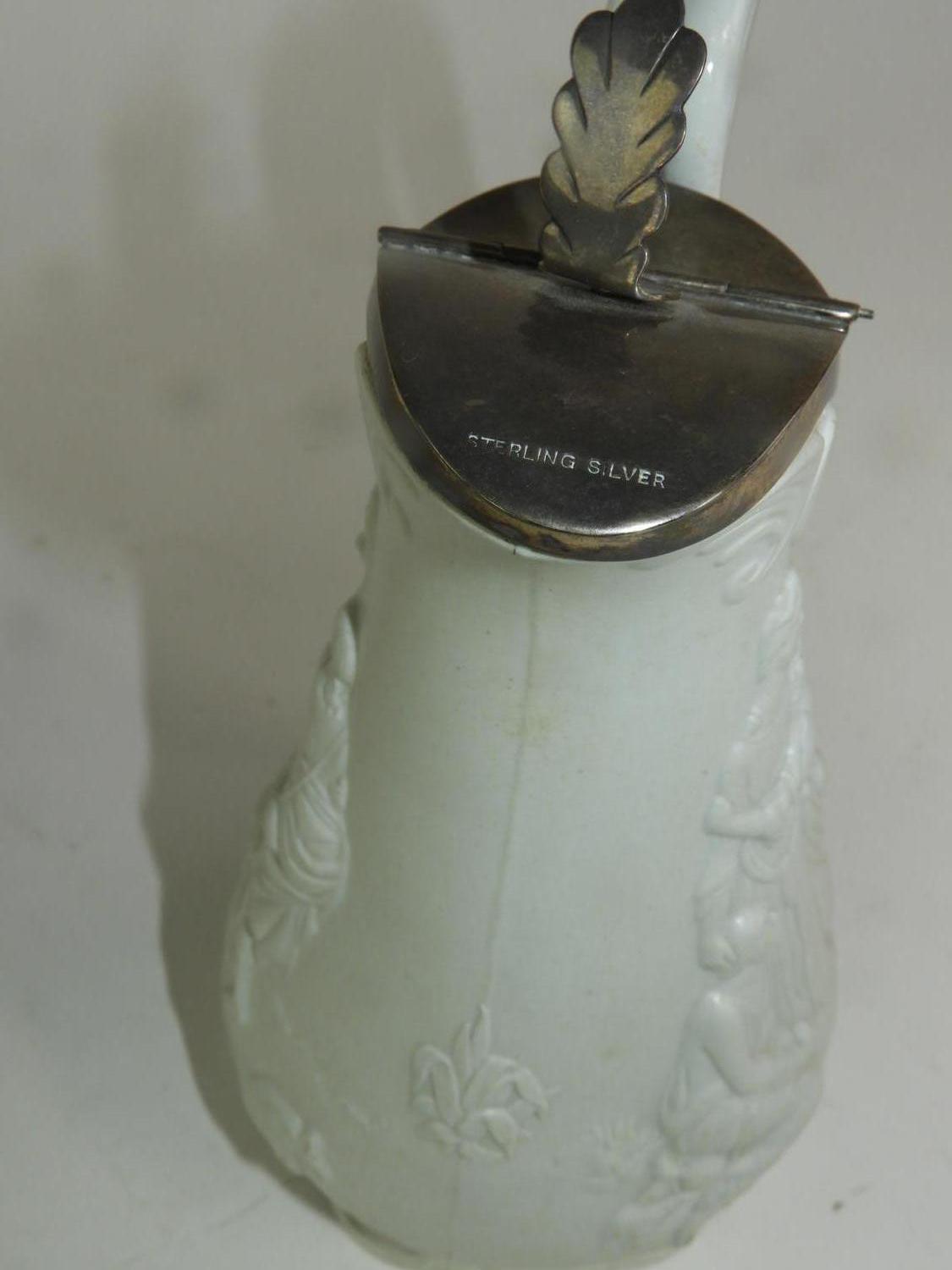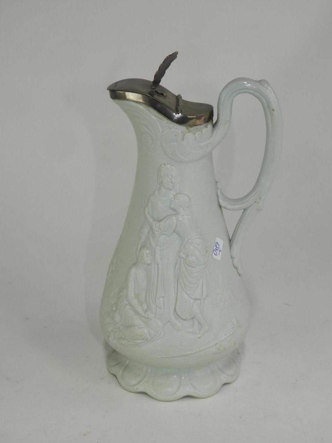 "naomi and her daughters-in-law" embossed salt glazed pitcher with sterling silver mount, ht. 10 1/2"