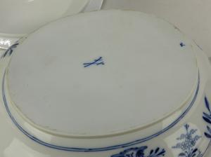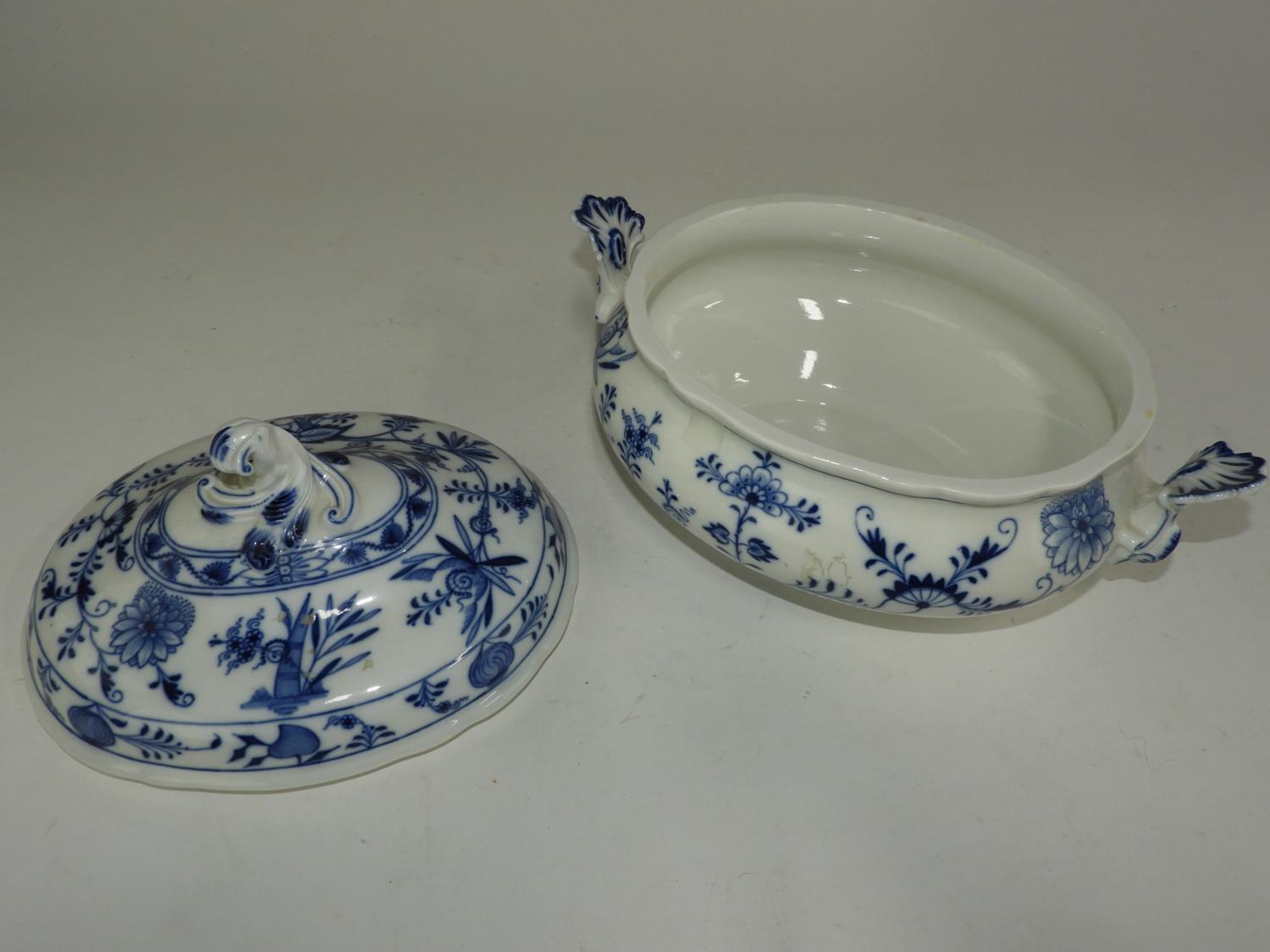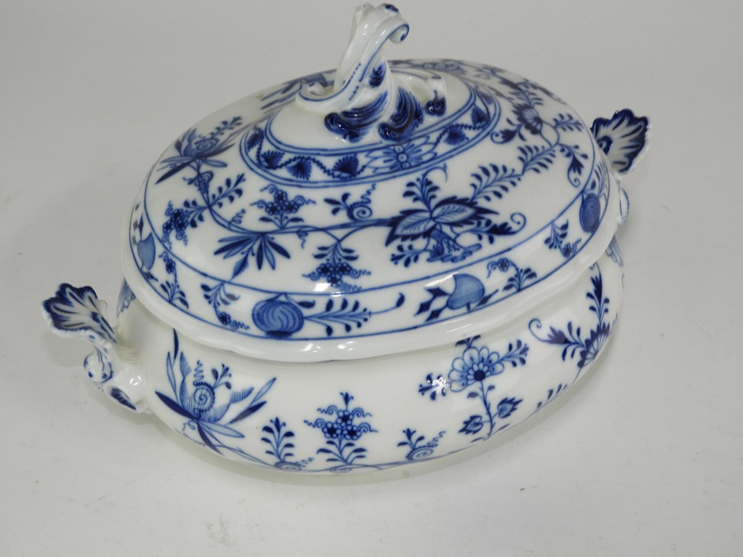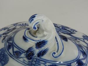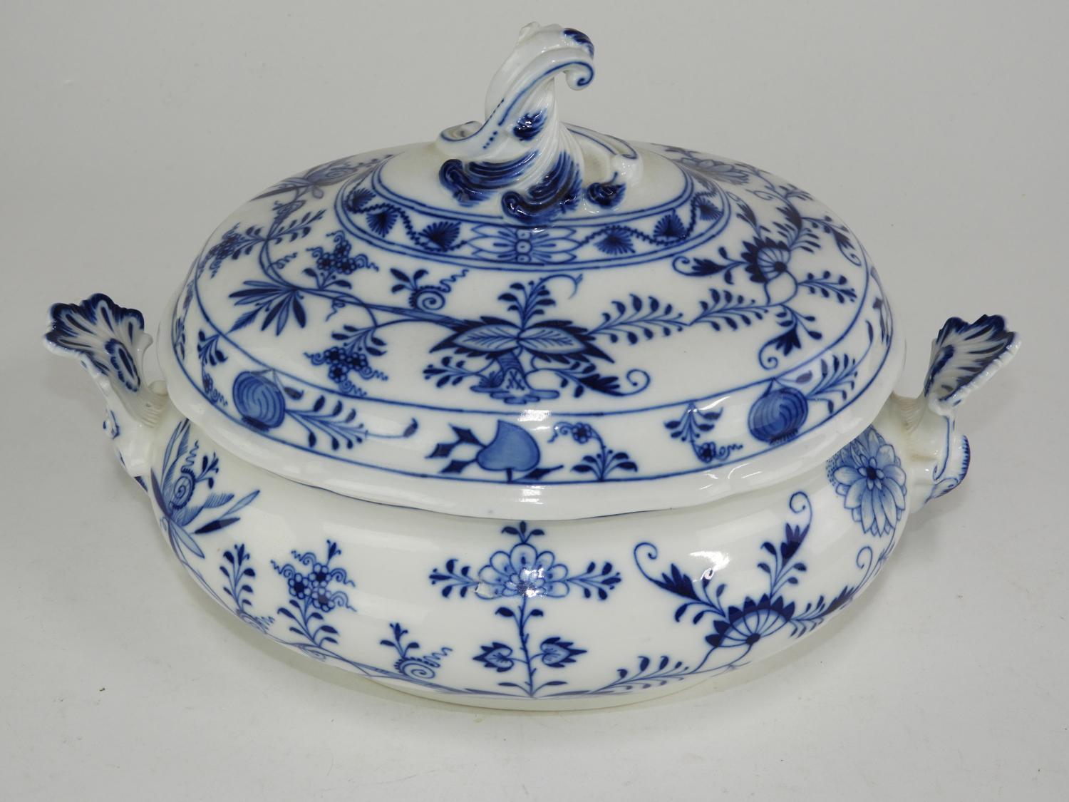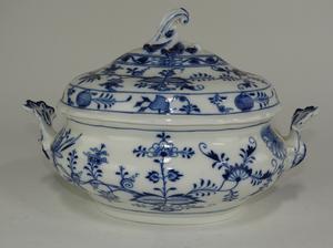 meissen blue and white covered tureen, large chip, 9 1/2 x 13 1/2" x 9"