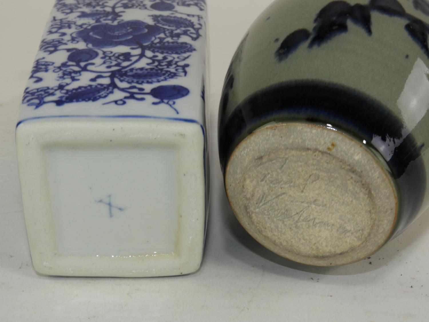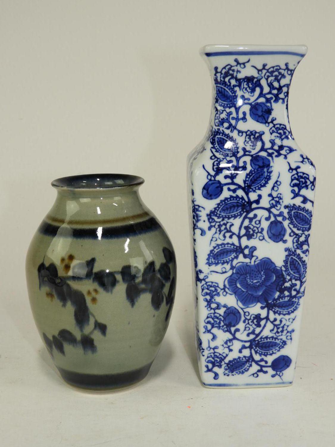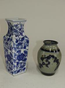 blue and white vase and an art pottery vase, signed