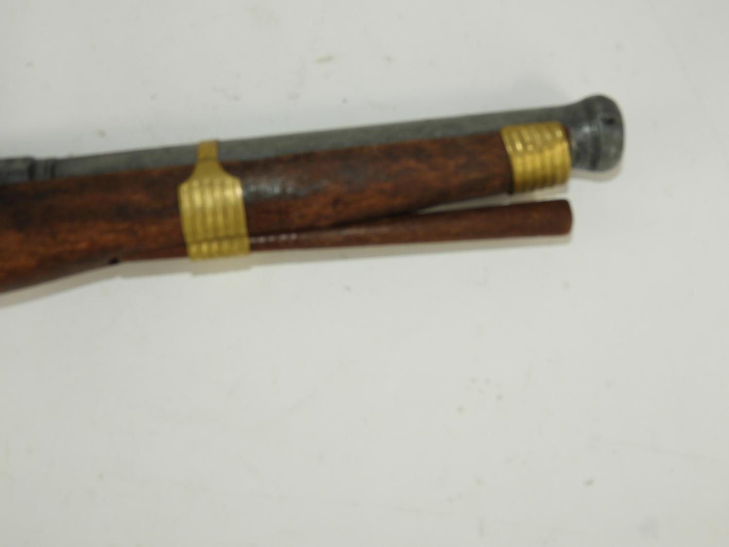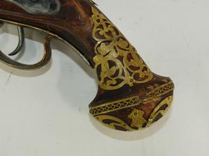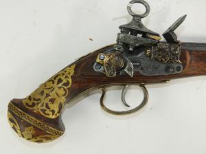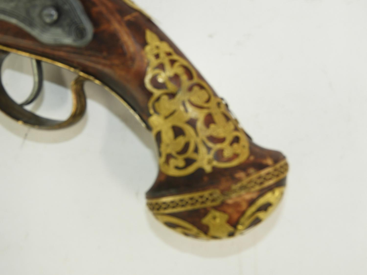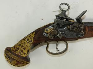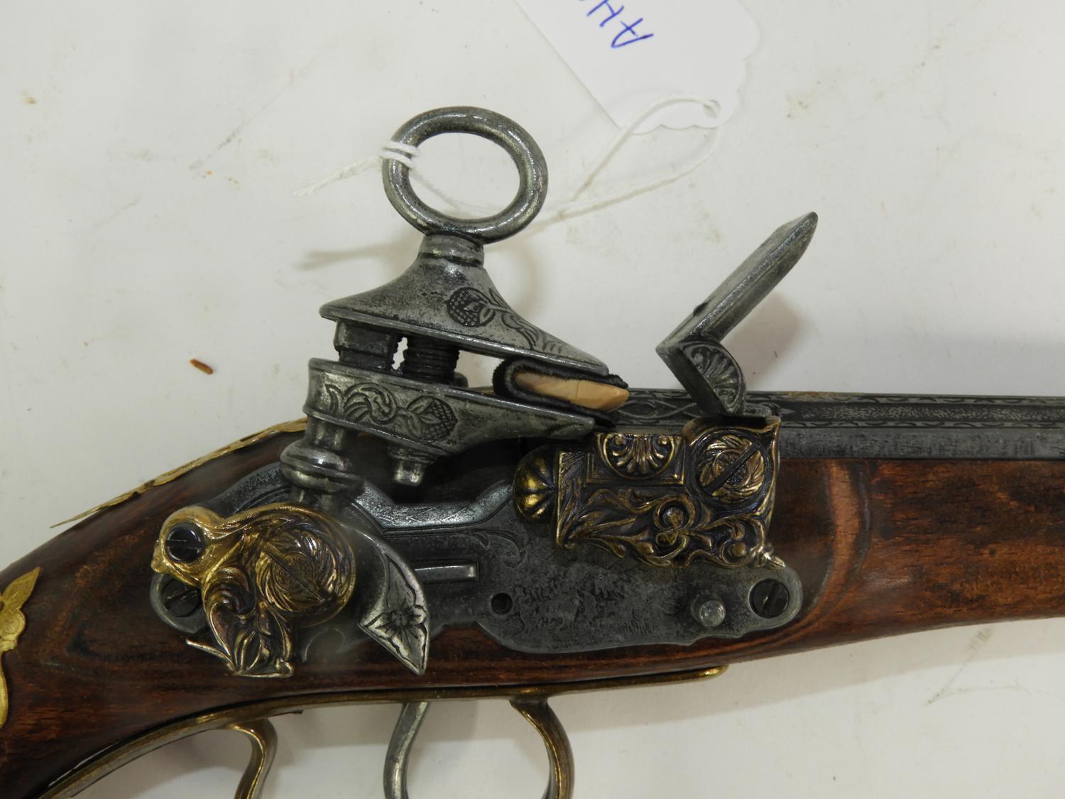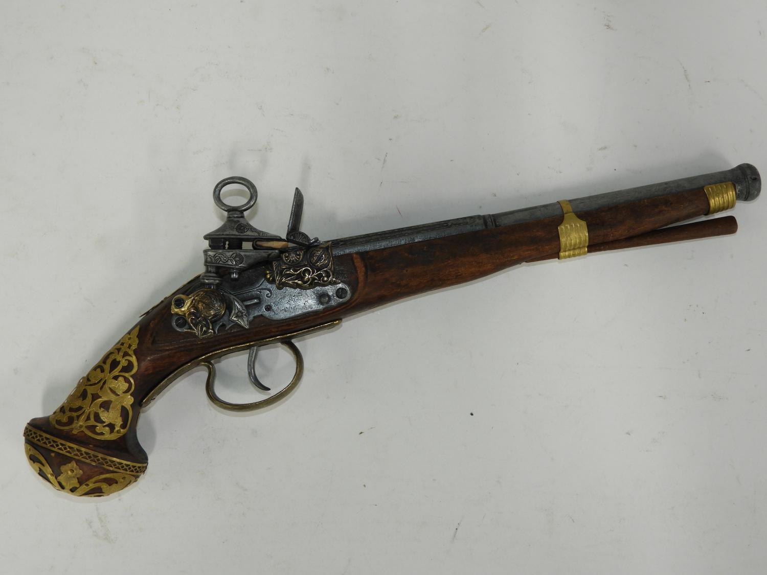 18th century style flintlock pistol with gilt filigree scrollwork, length 17"
