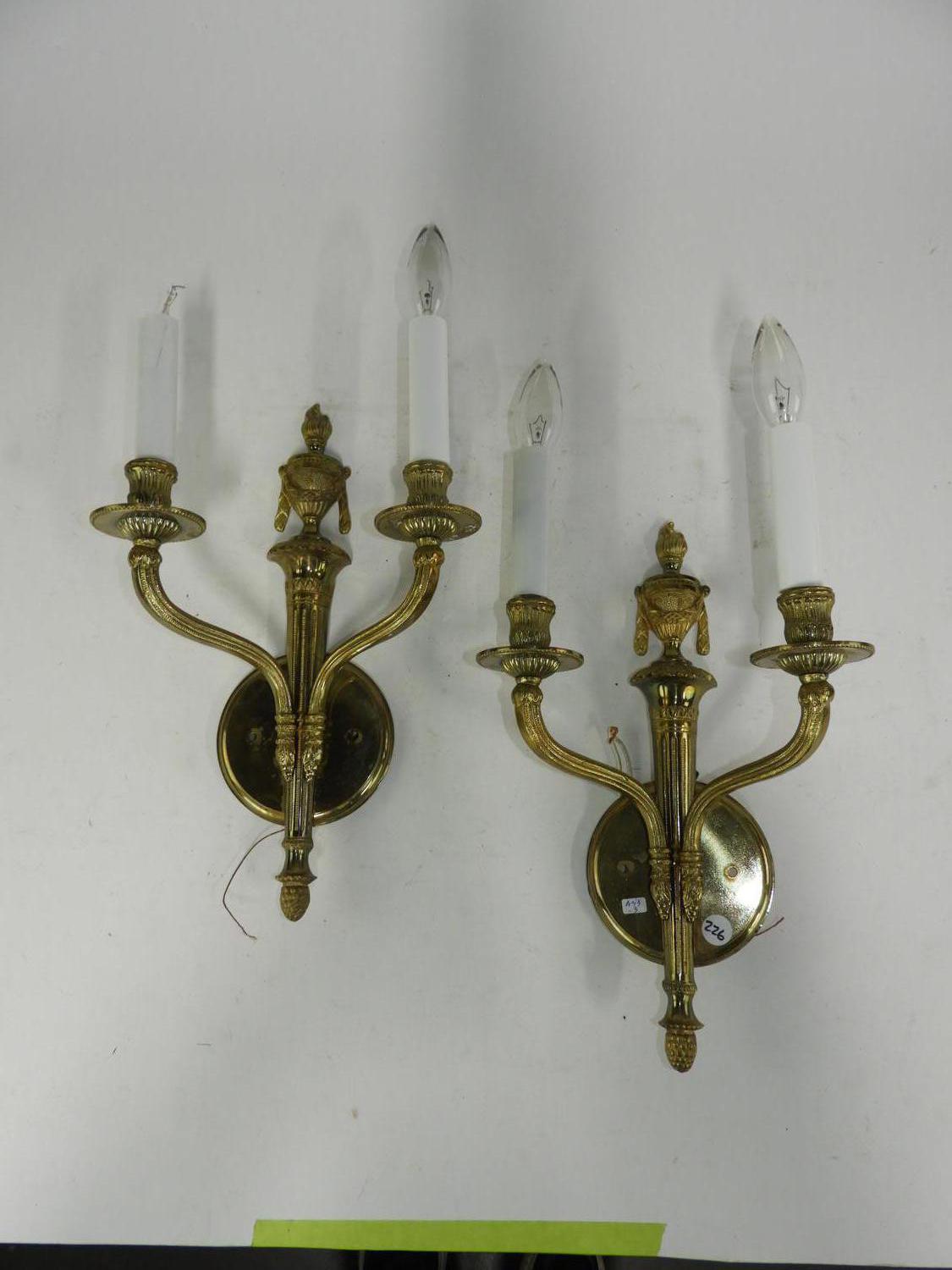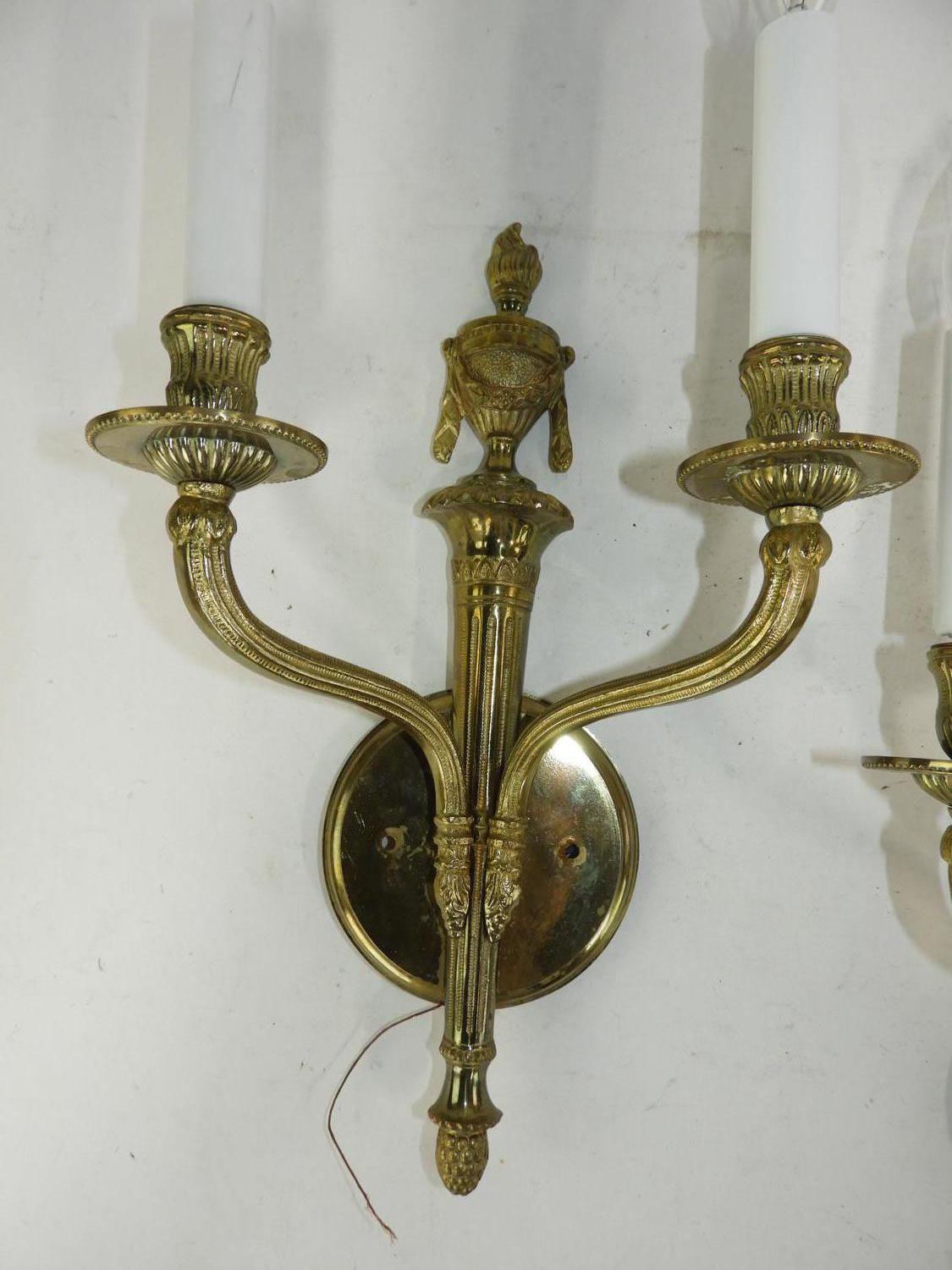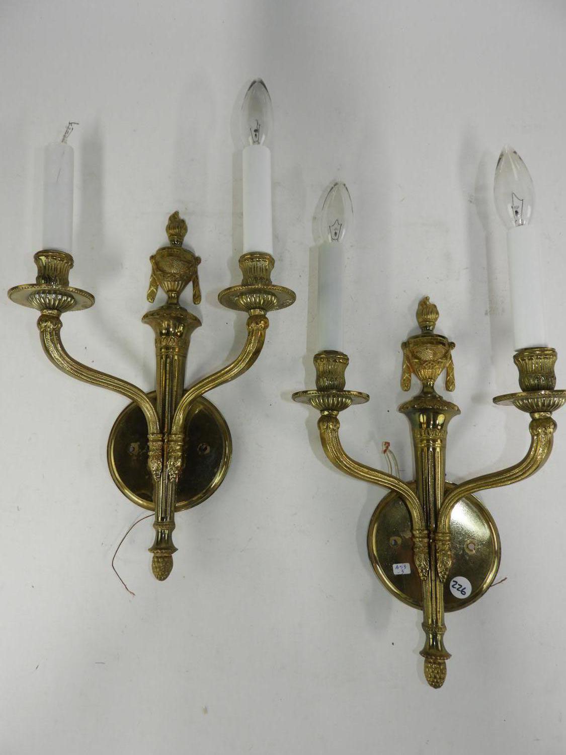 pair of brass two branch wall scones, 19" x 10"