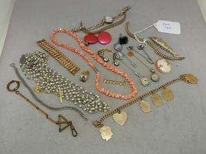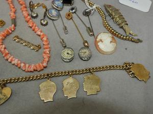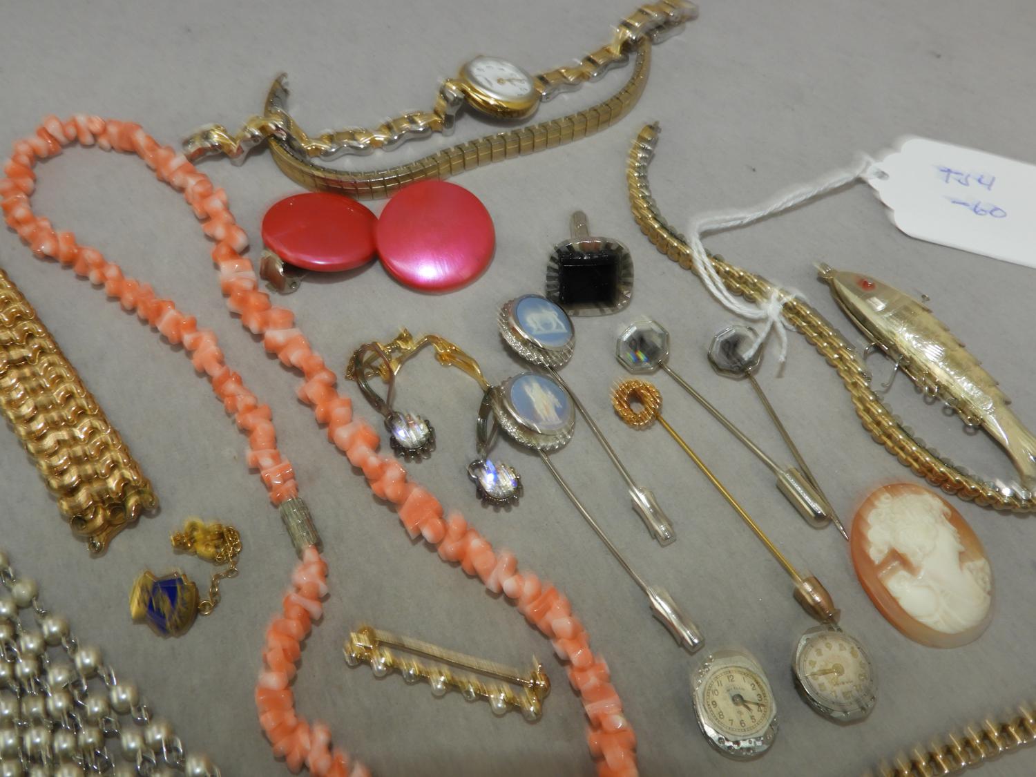 lot of vintage costume jewelery including 2 wedgewood stickpins, goldfilled jewelery, elgin movement