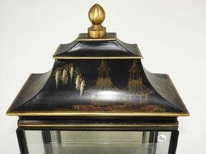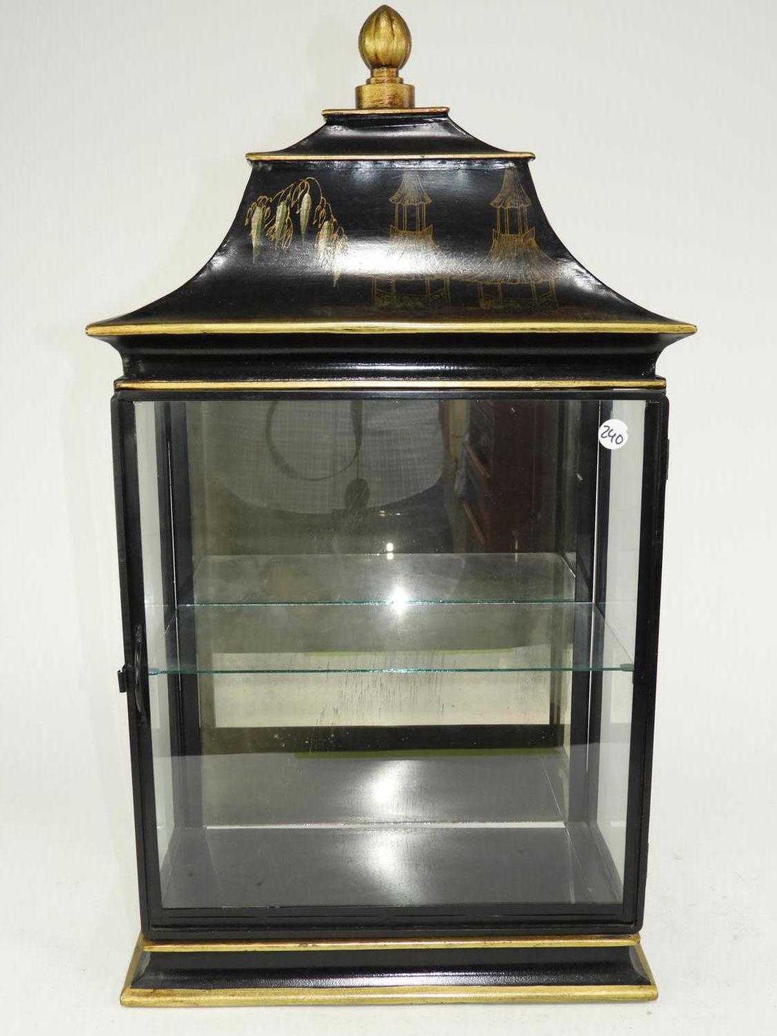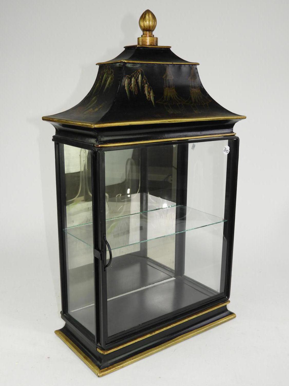 japanned tole and glass wall cabinet, 25" x 15" x 8"