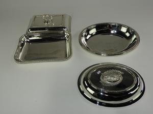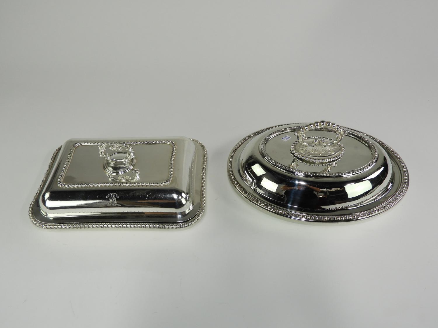 two silver plate covered entre dishes, 11" x 8 1/2"
