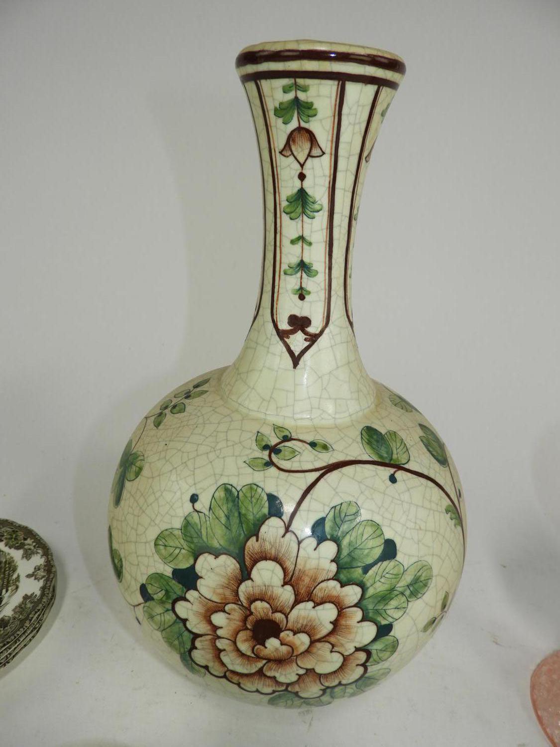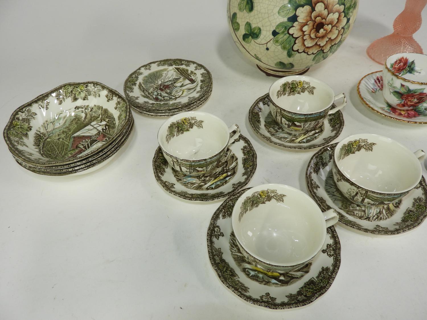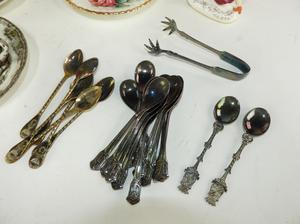 box of misc china spanish vase, johnson brother teacups, souvenir spoons