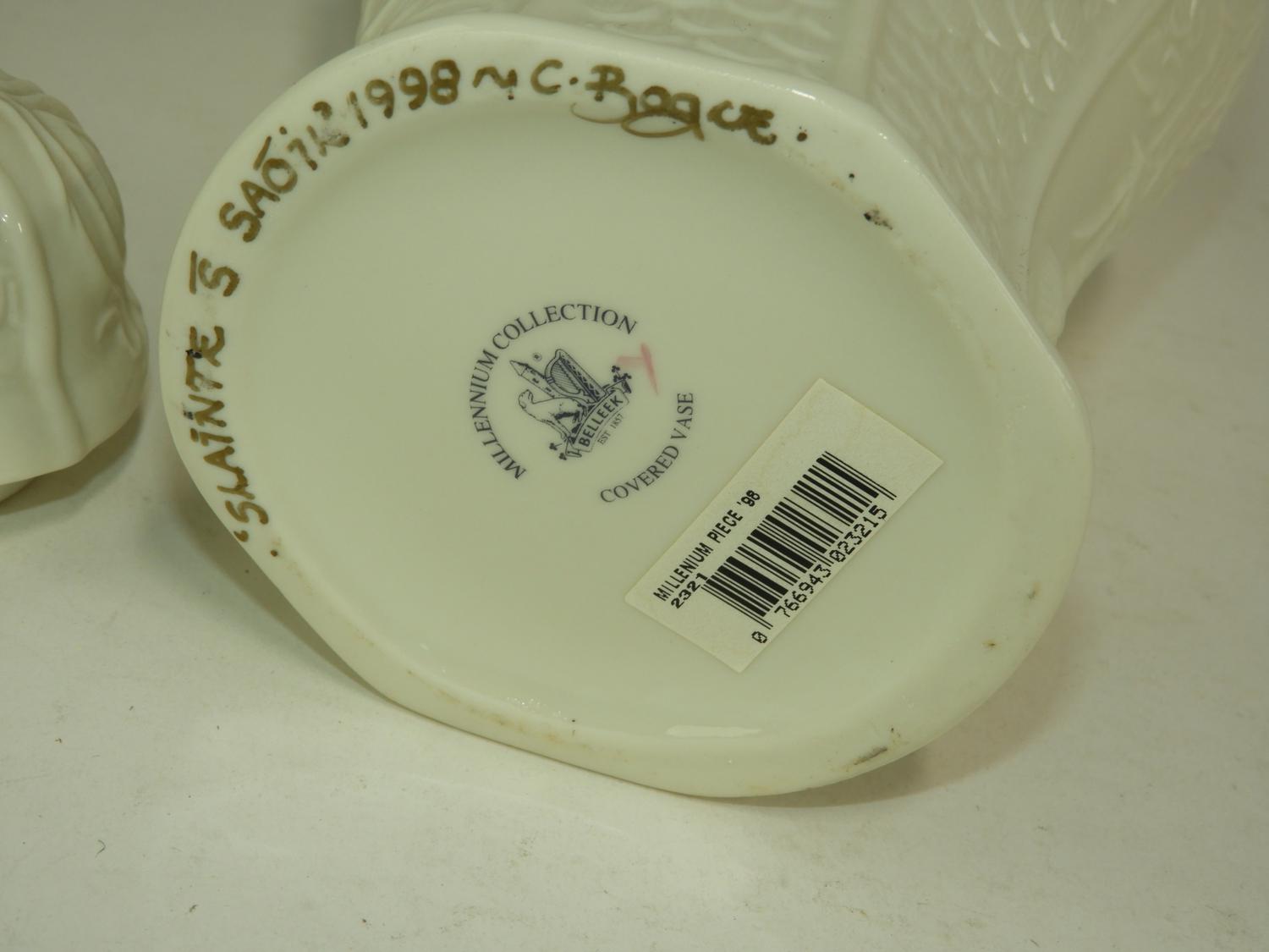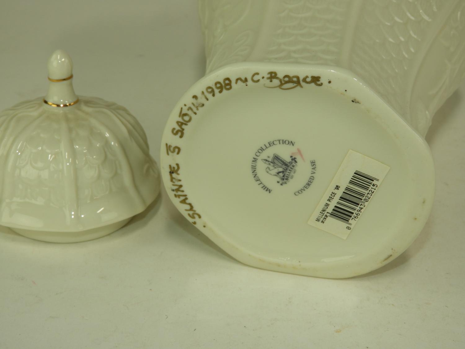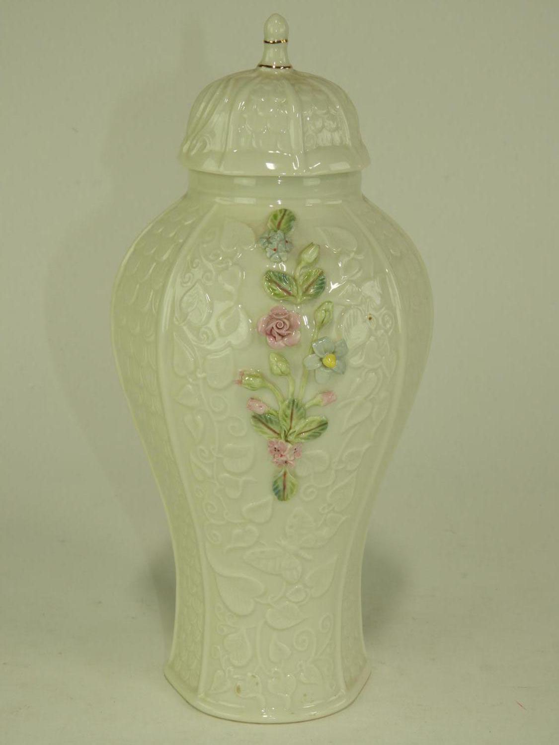 belleek covered vase, ireland, ht 11 1/2"