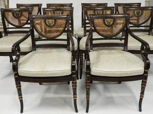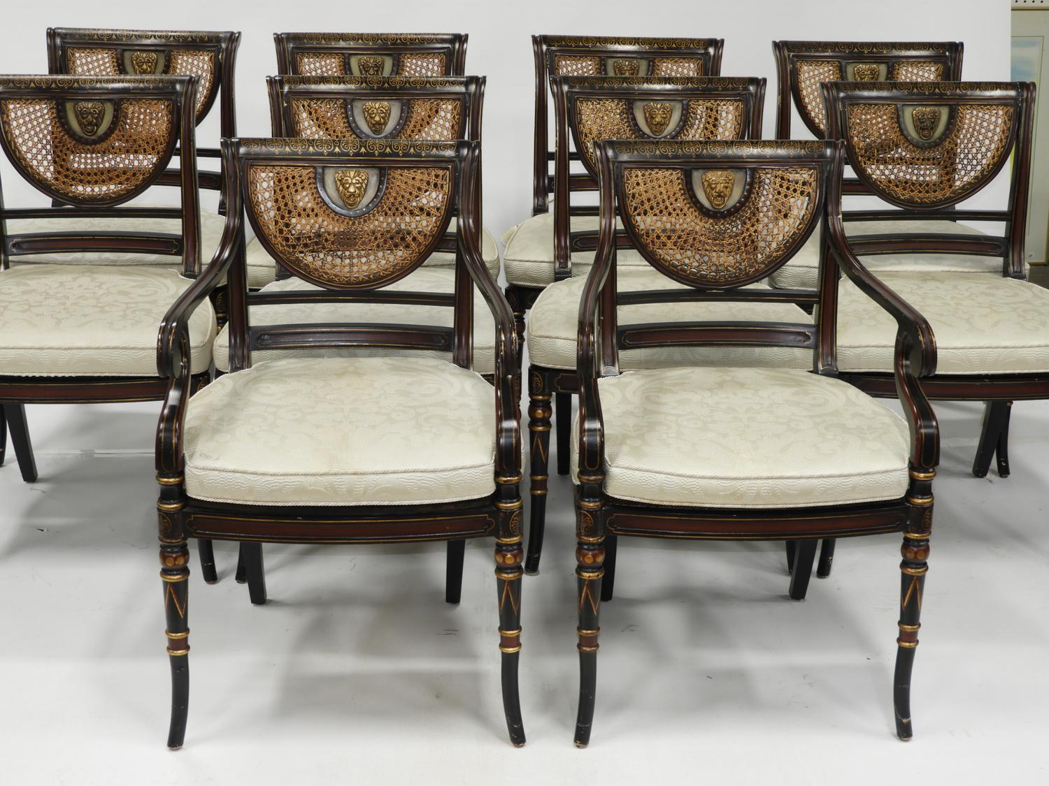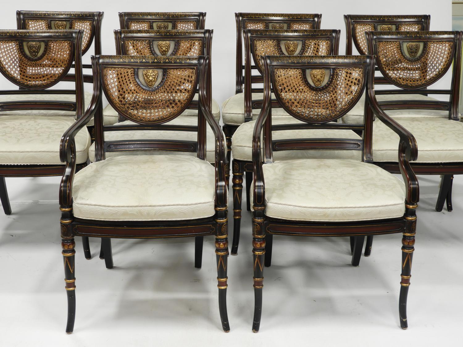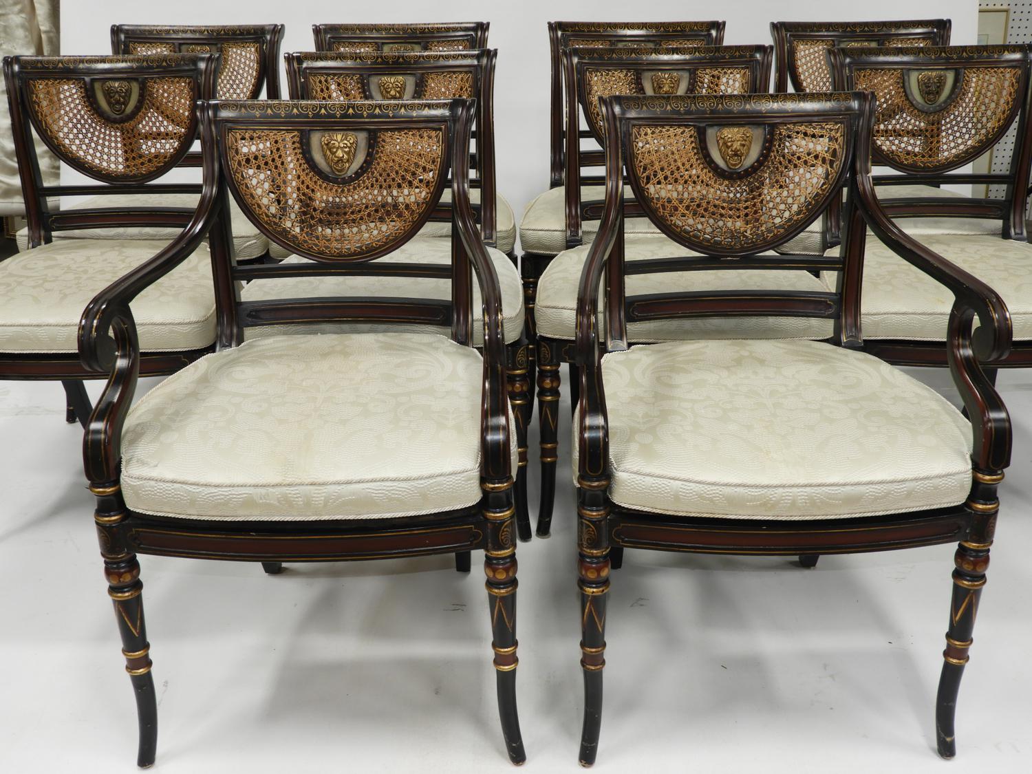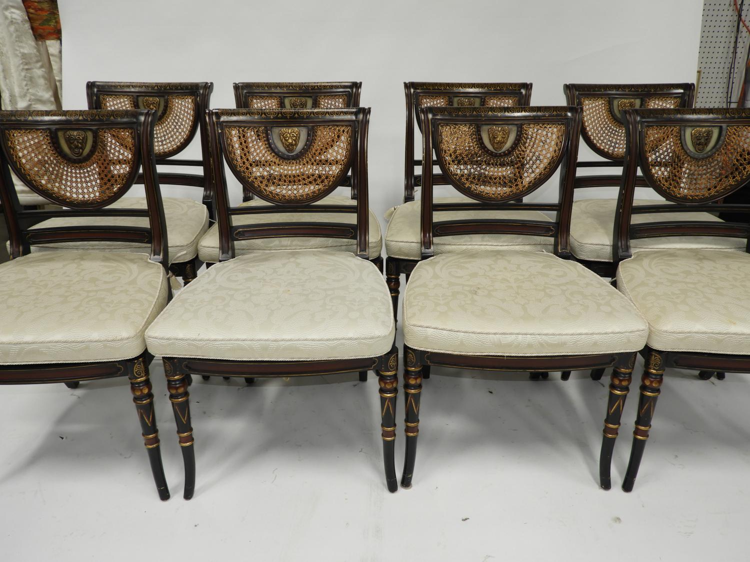 set of 10 egyptian revival style painted partial gilt caned seat dining chairs, late 20th century