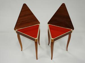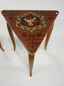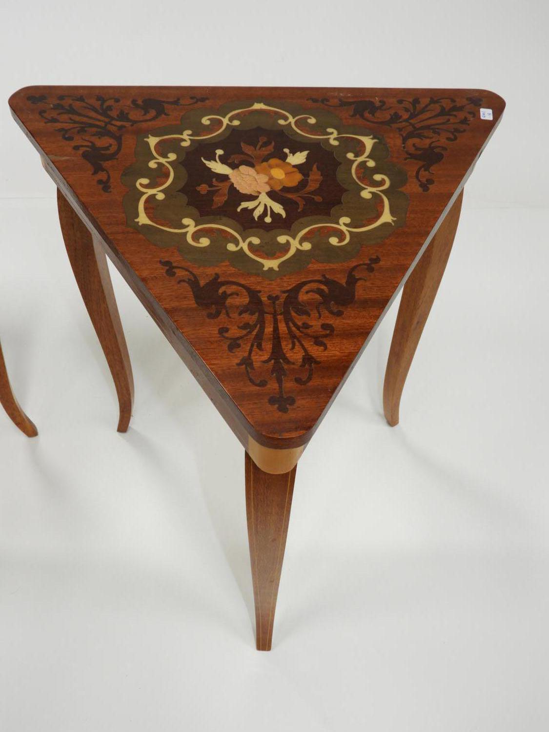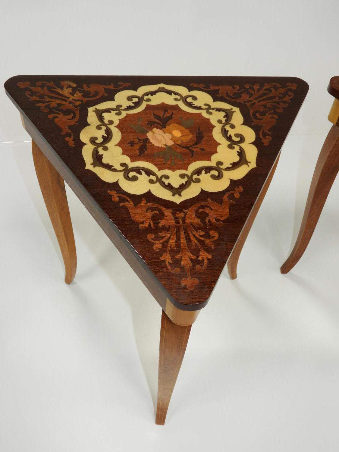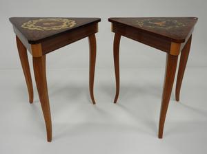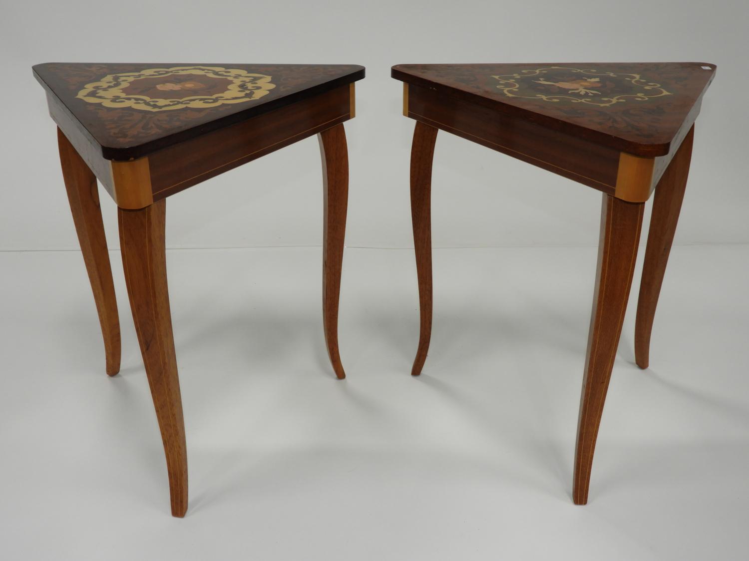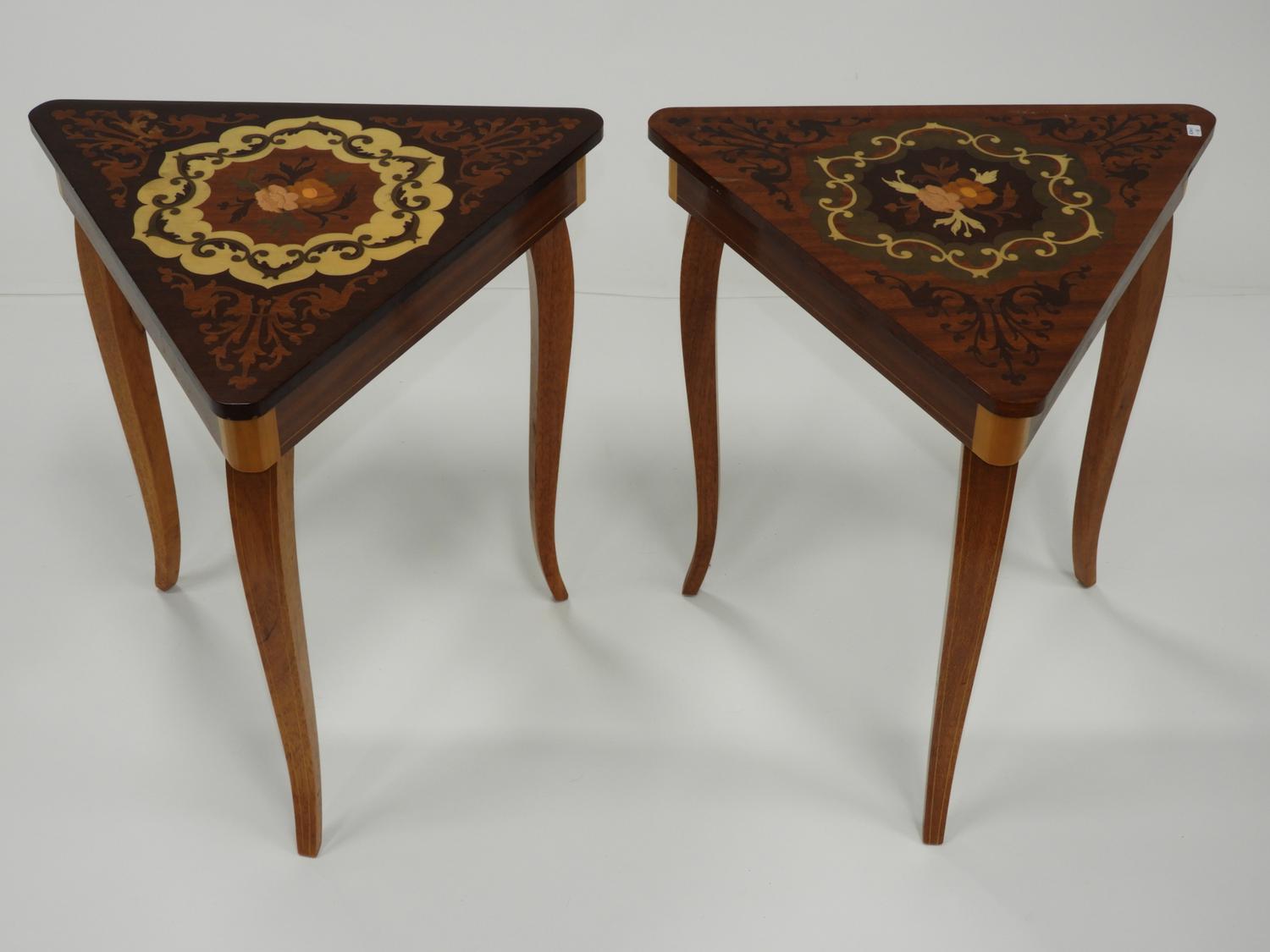 pair of italian inlaid triangular musical side tables, 17" x 14" x 15 1/2"