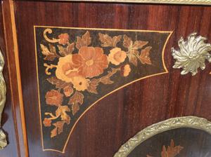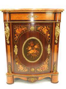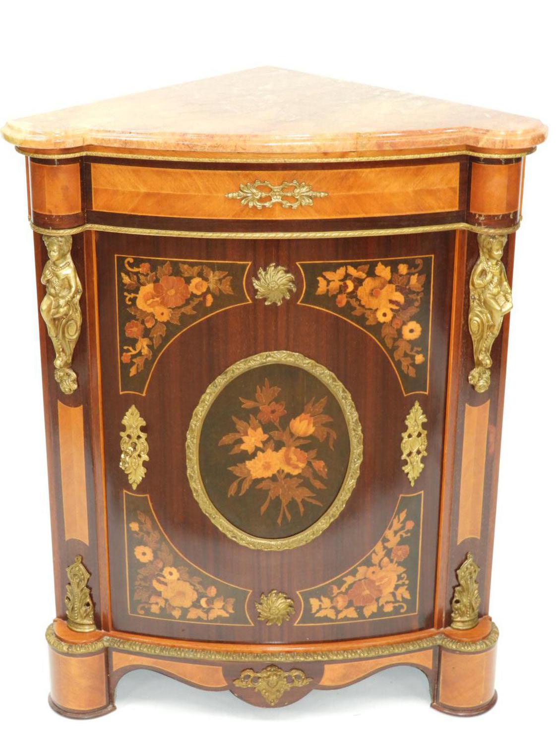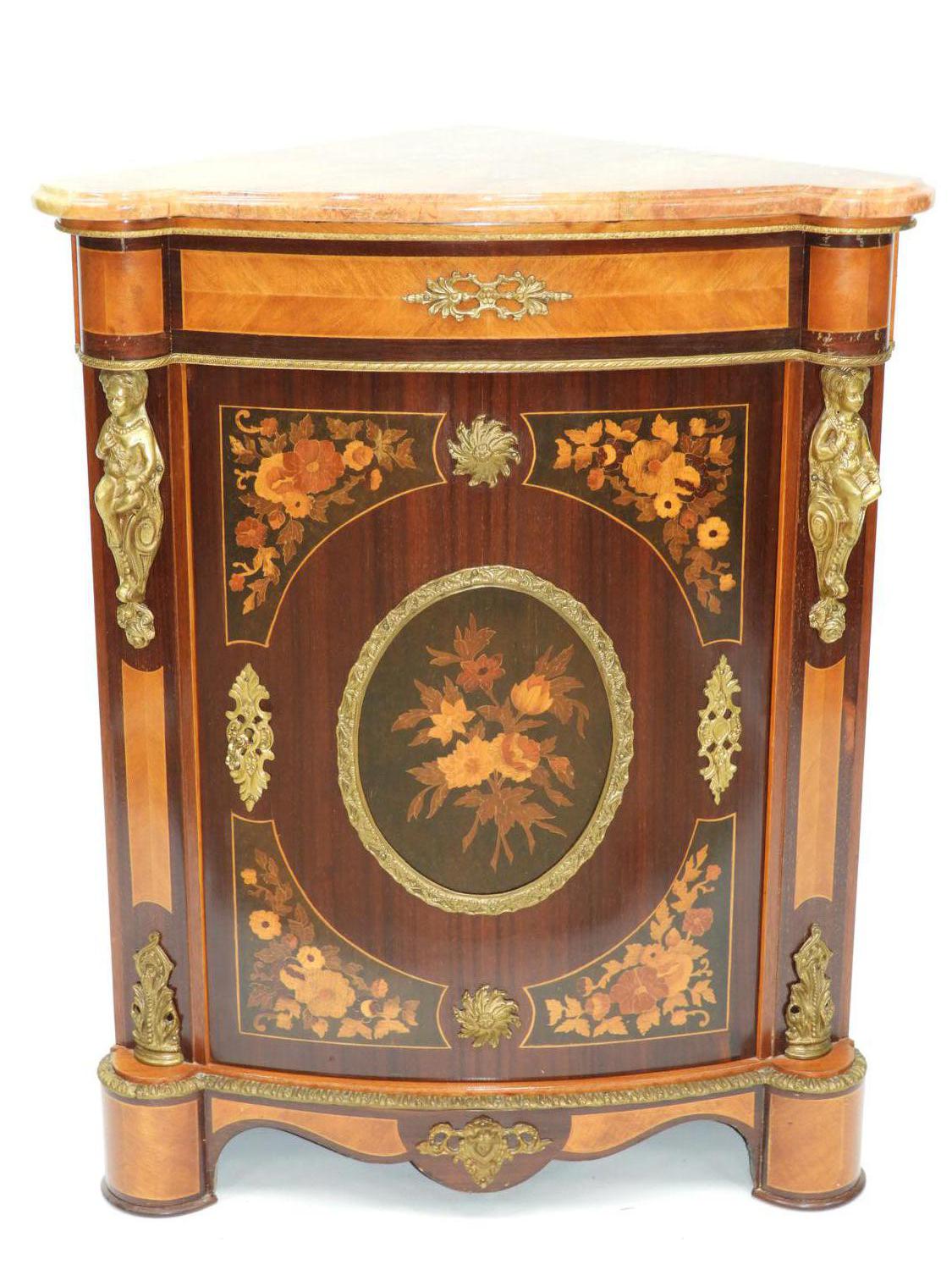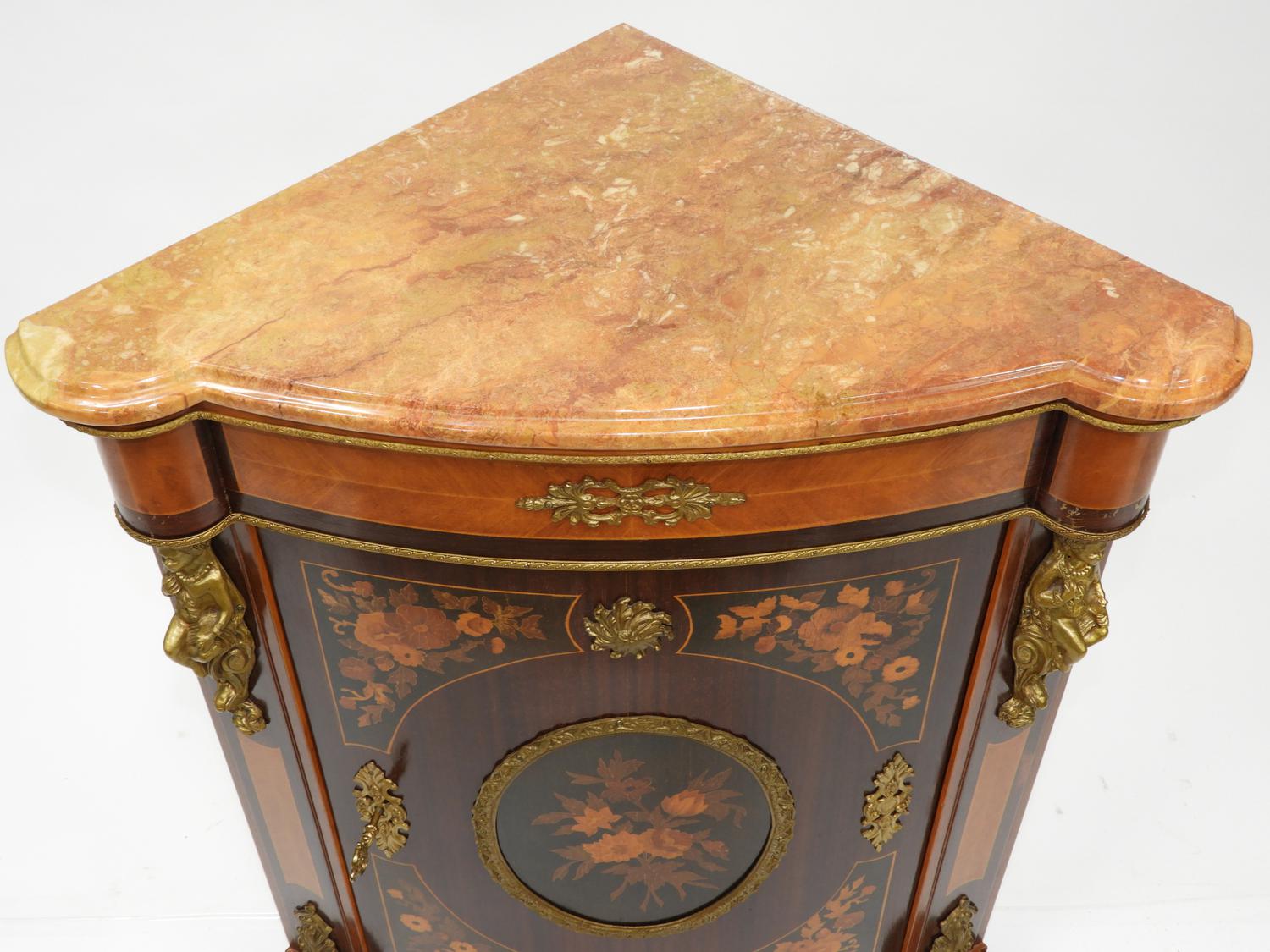 napoleon iii style marble top marquetry inlaid corner cabinet, late 20th century, 34 3/4" x 28" x 18"