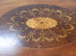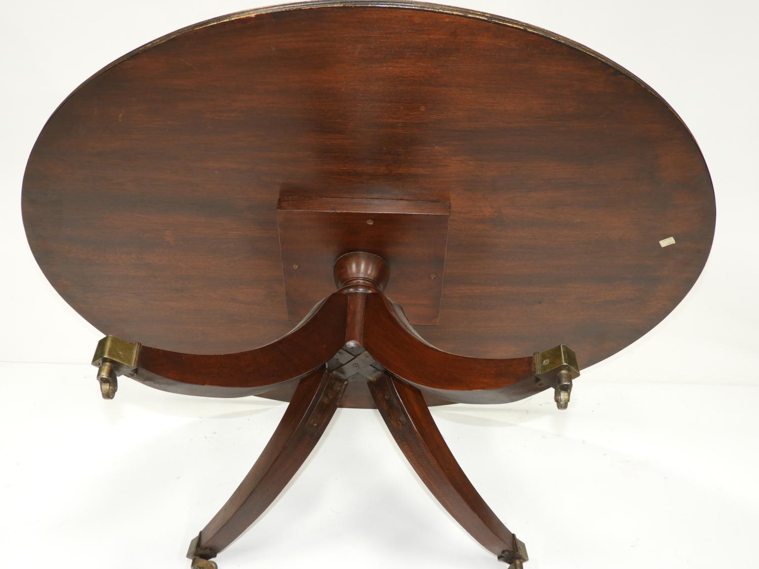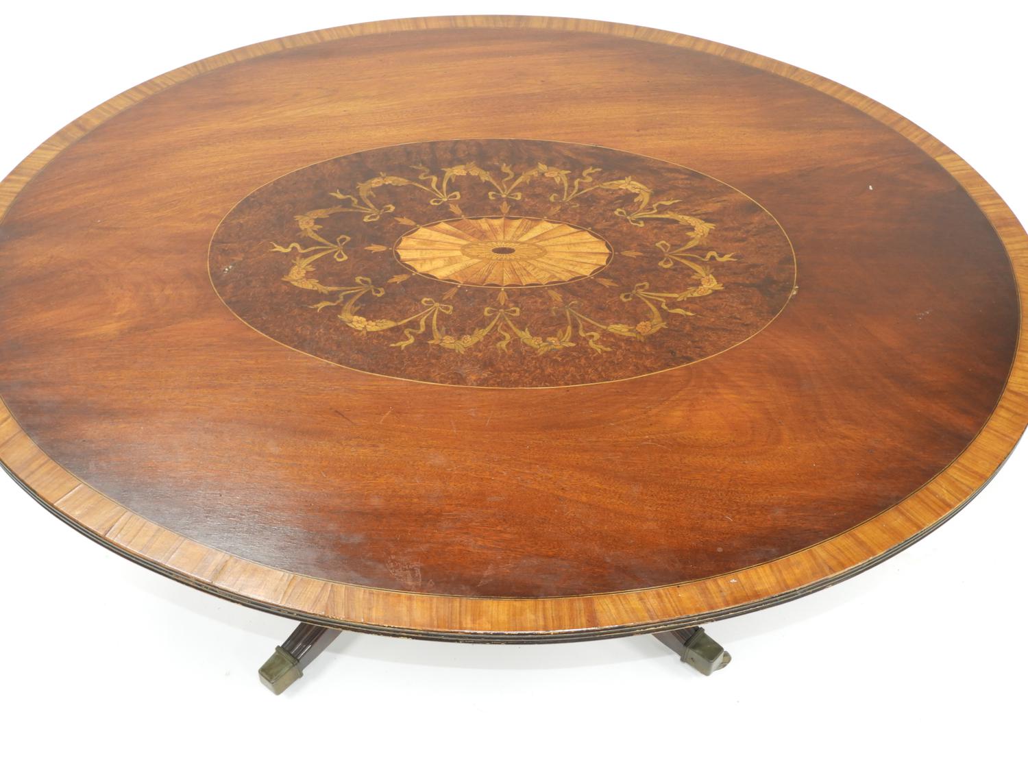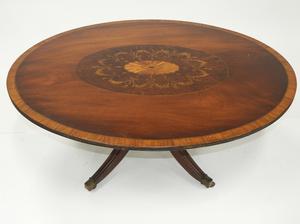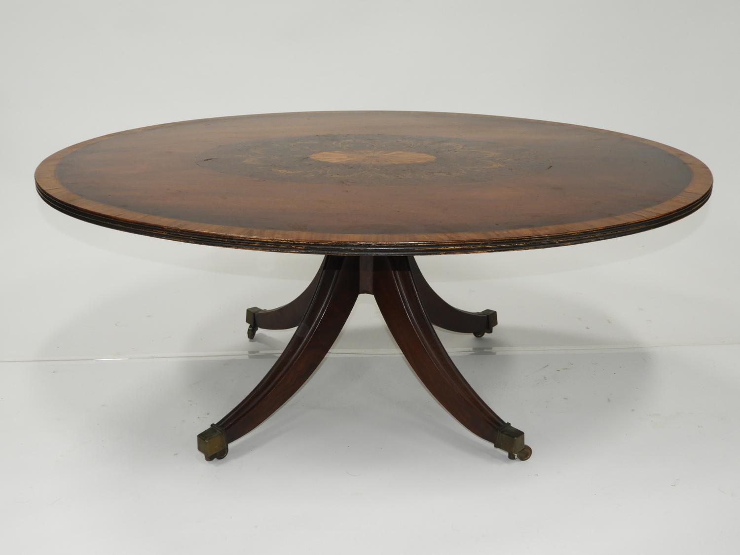 marquetry inlaid mahogany pedestal coffee table, mid 20th century, 18" x 45" x 36"