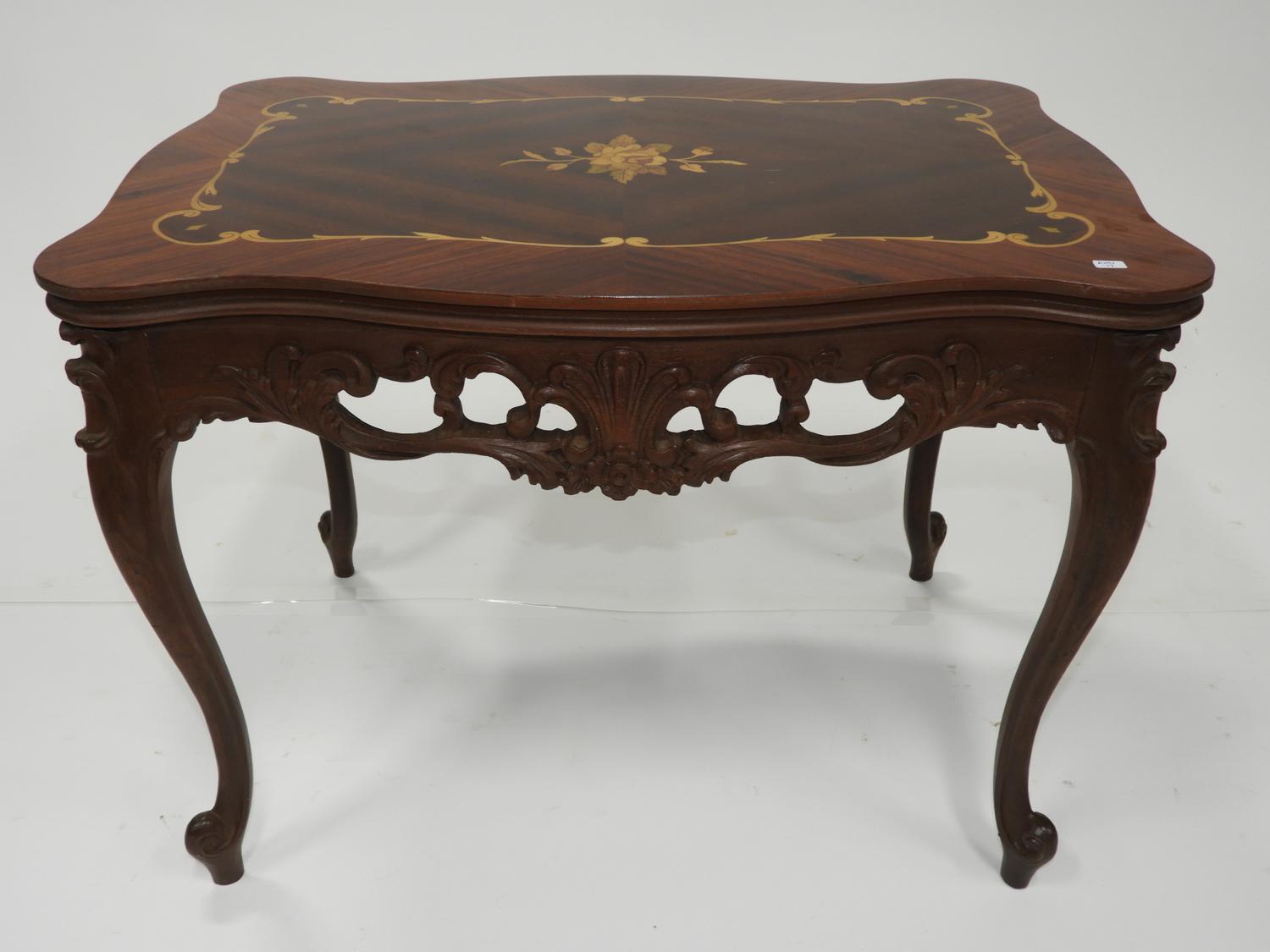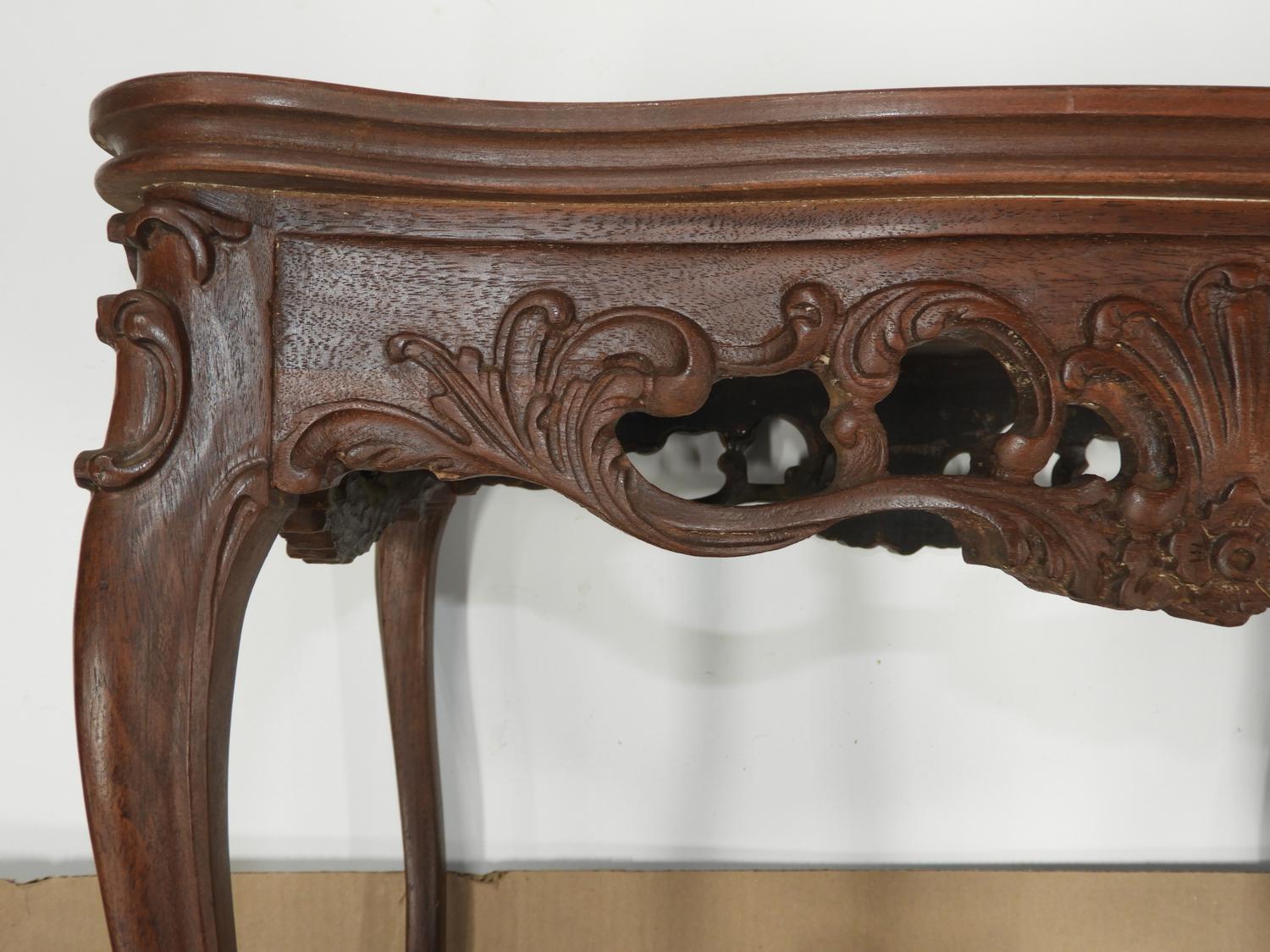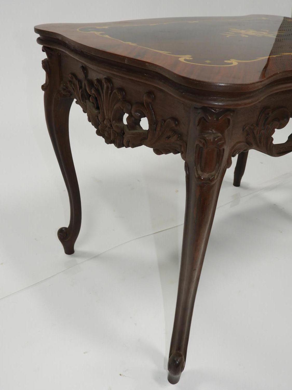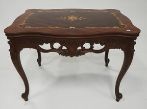 maquetry inlaid carved mahogany side table, 18" x 24" x 17"