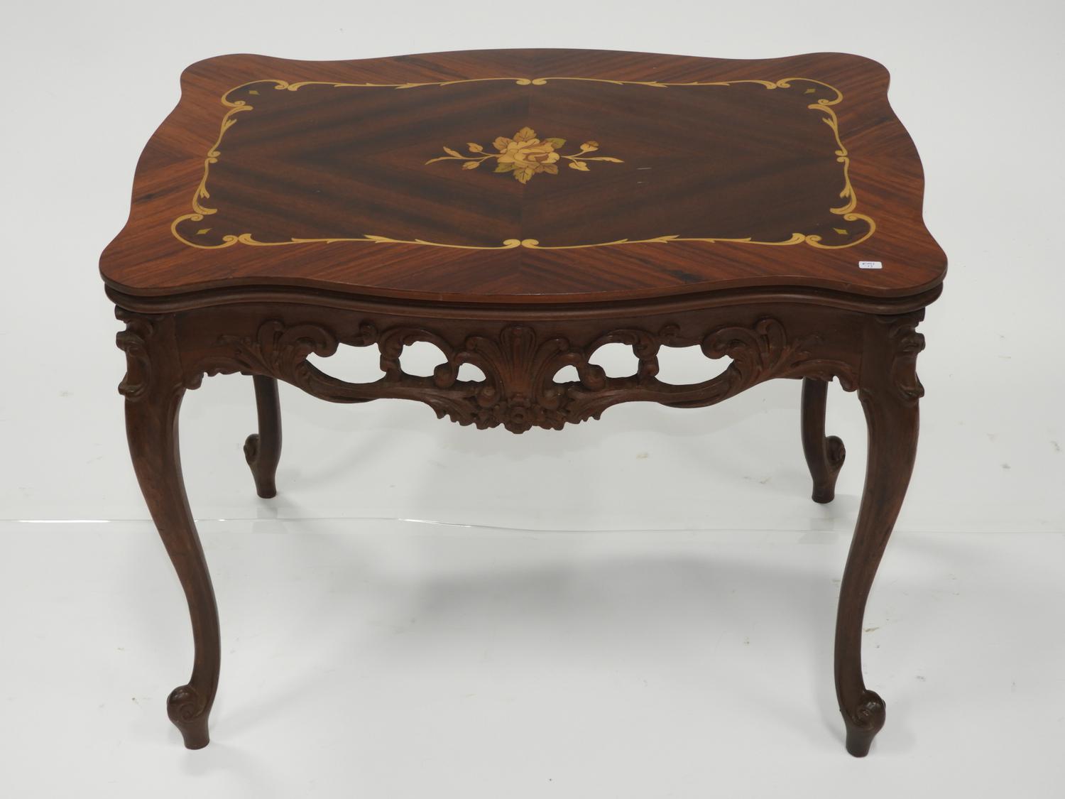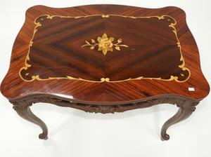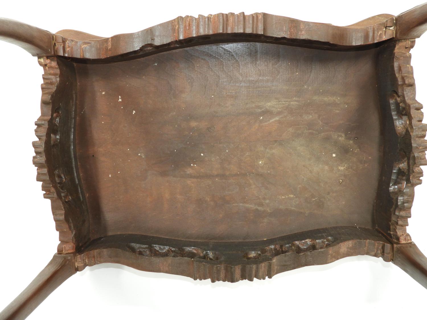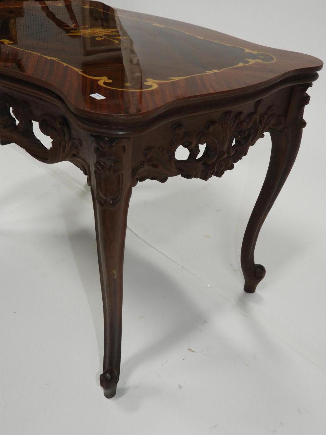 maquetry inlaid carved mahogany side table, 18" x 24" x 17"
