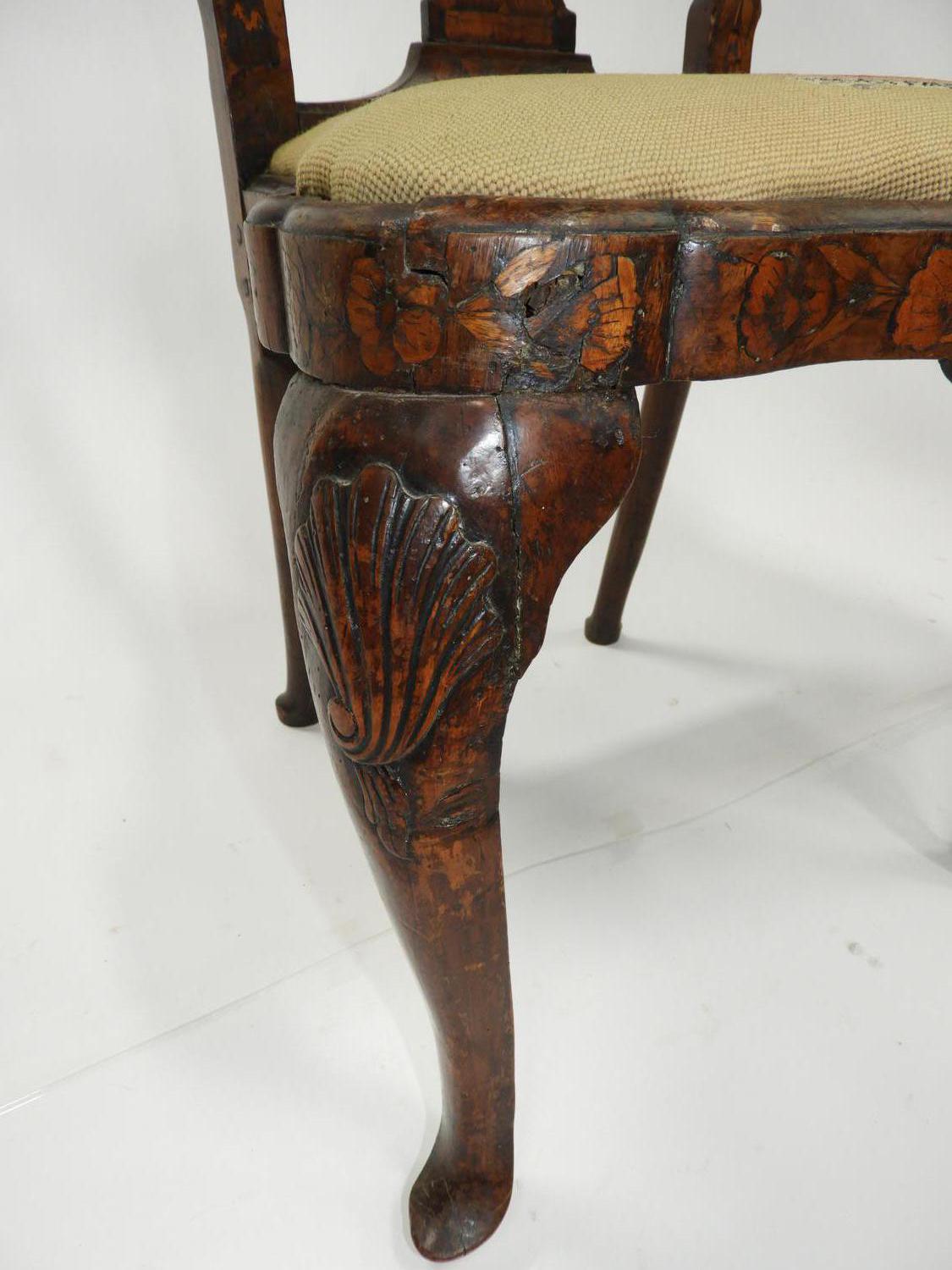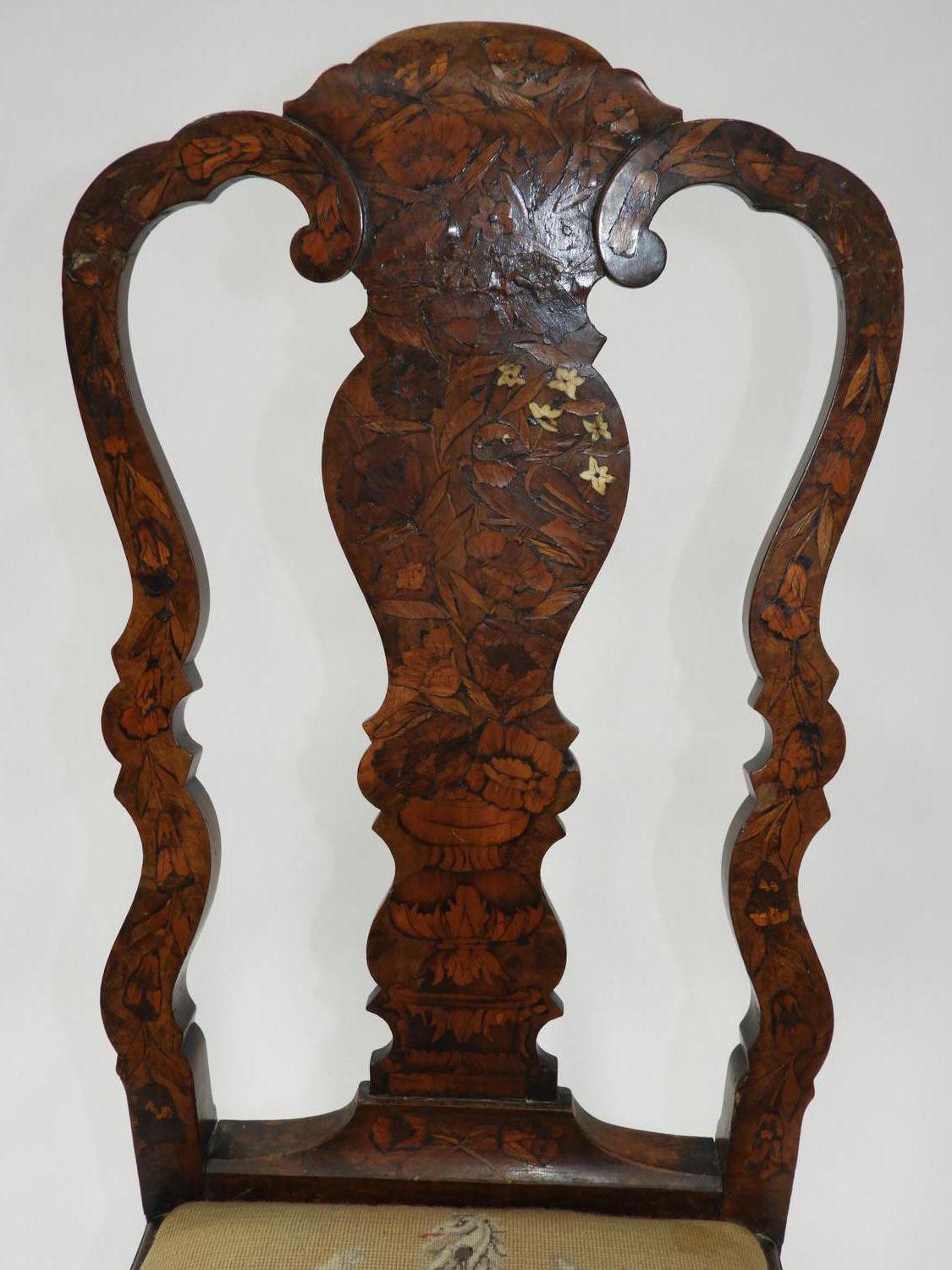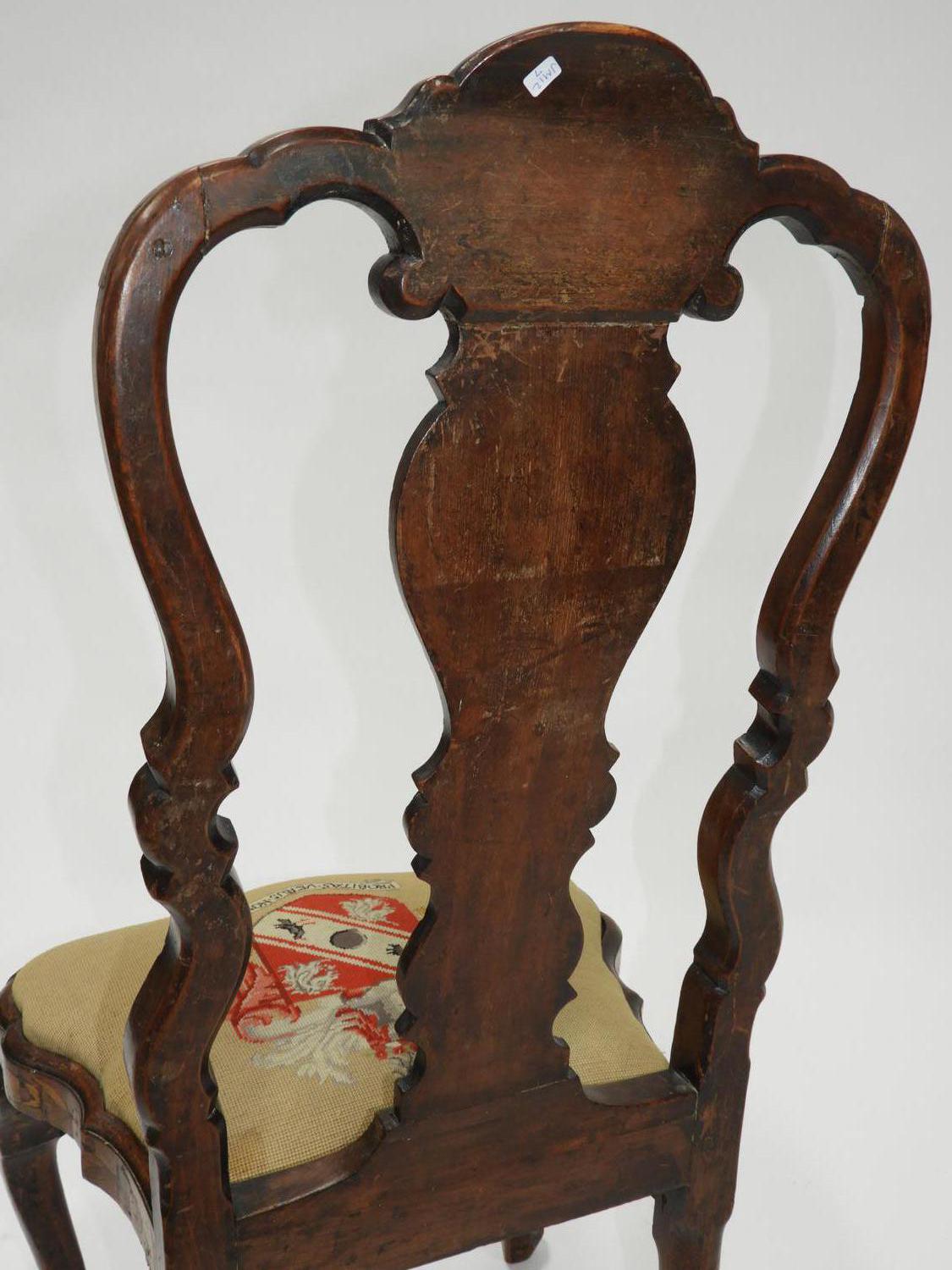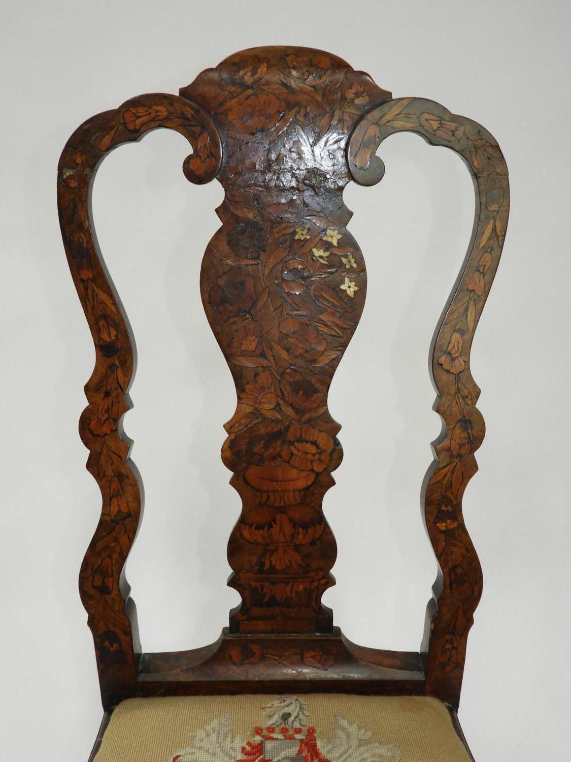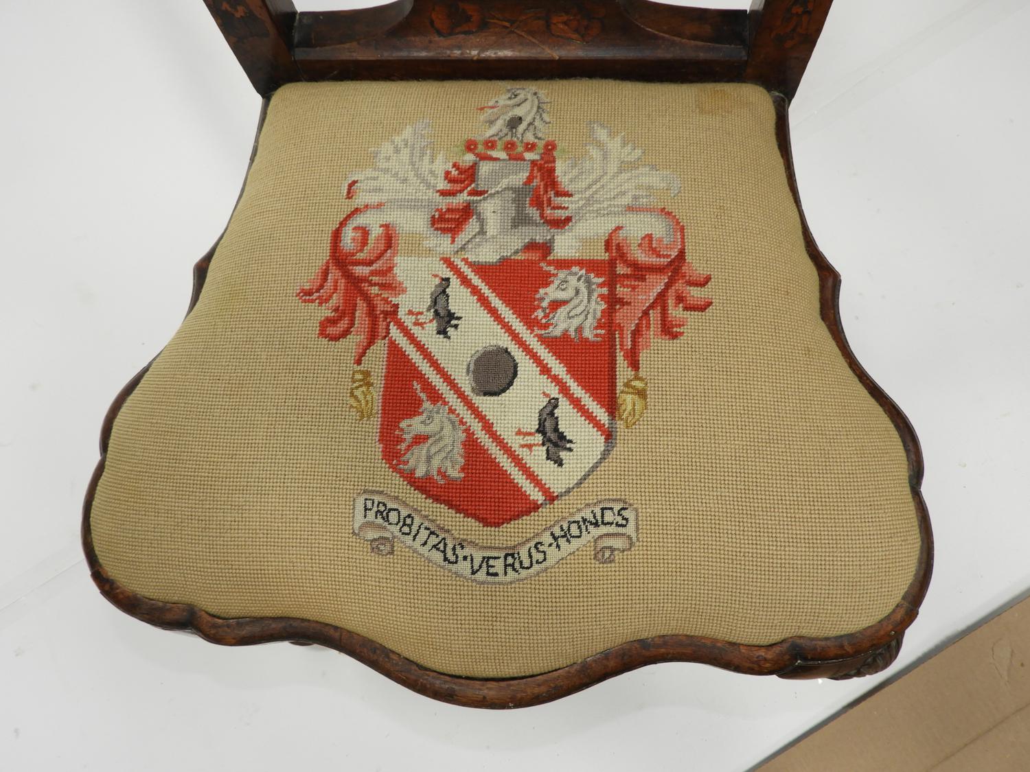 queen anne marquetry inlaid mahogany side chair with coat of arms needlepoint seat, early 18th century, 42 1/2" x 21" x 18"