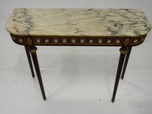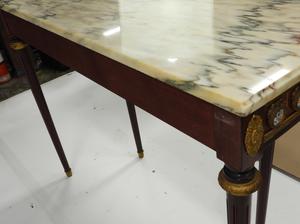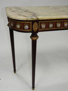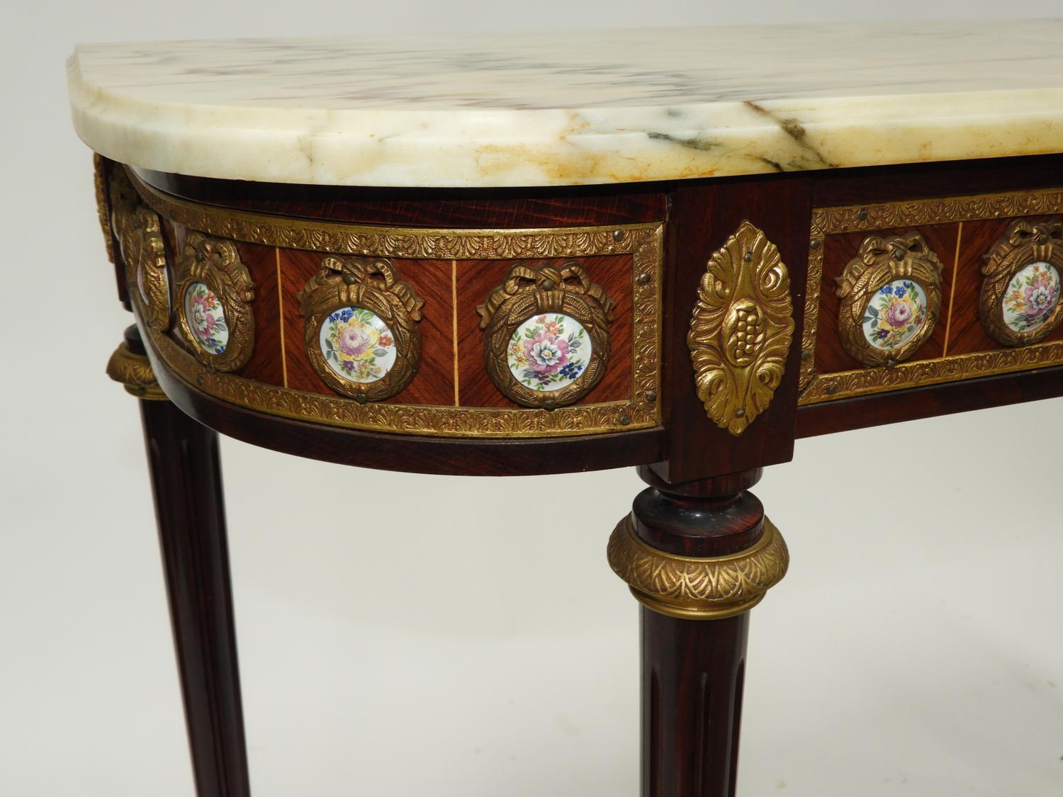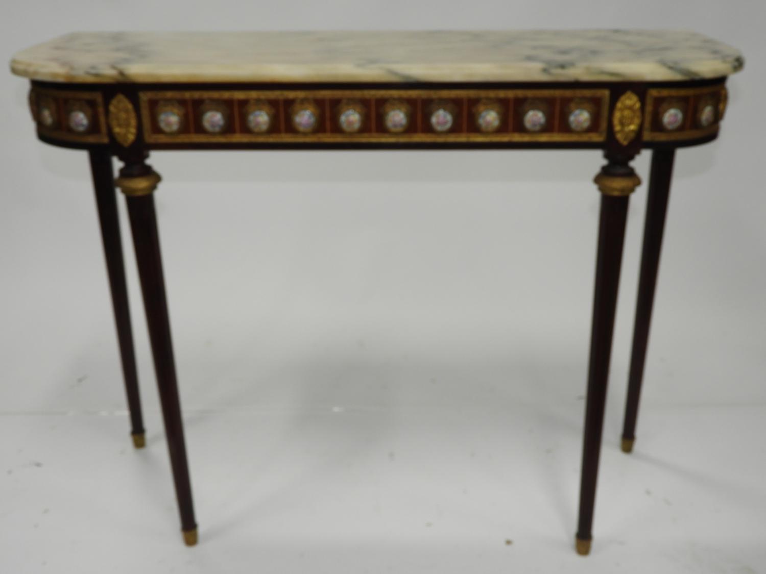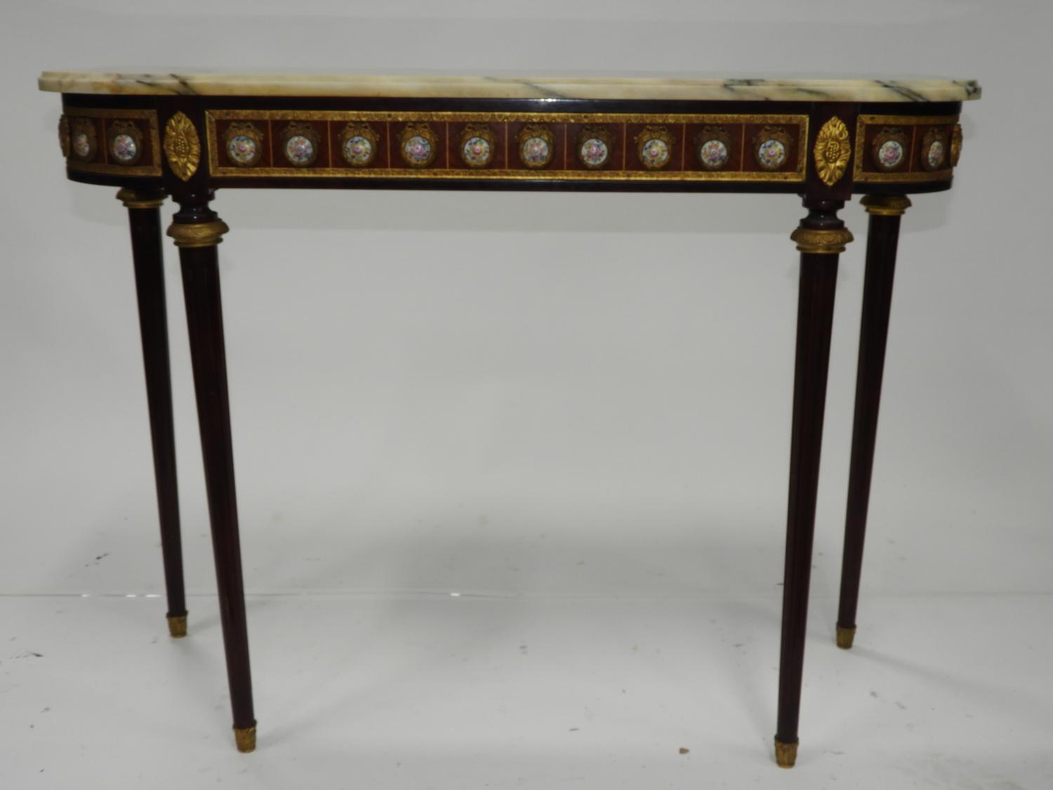 louis xvi style marble top porcelain and gilt mounted console table, mid 20th century, 30" x 38 1/2" x 14"