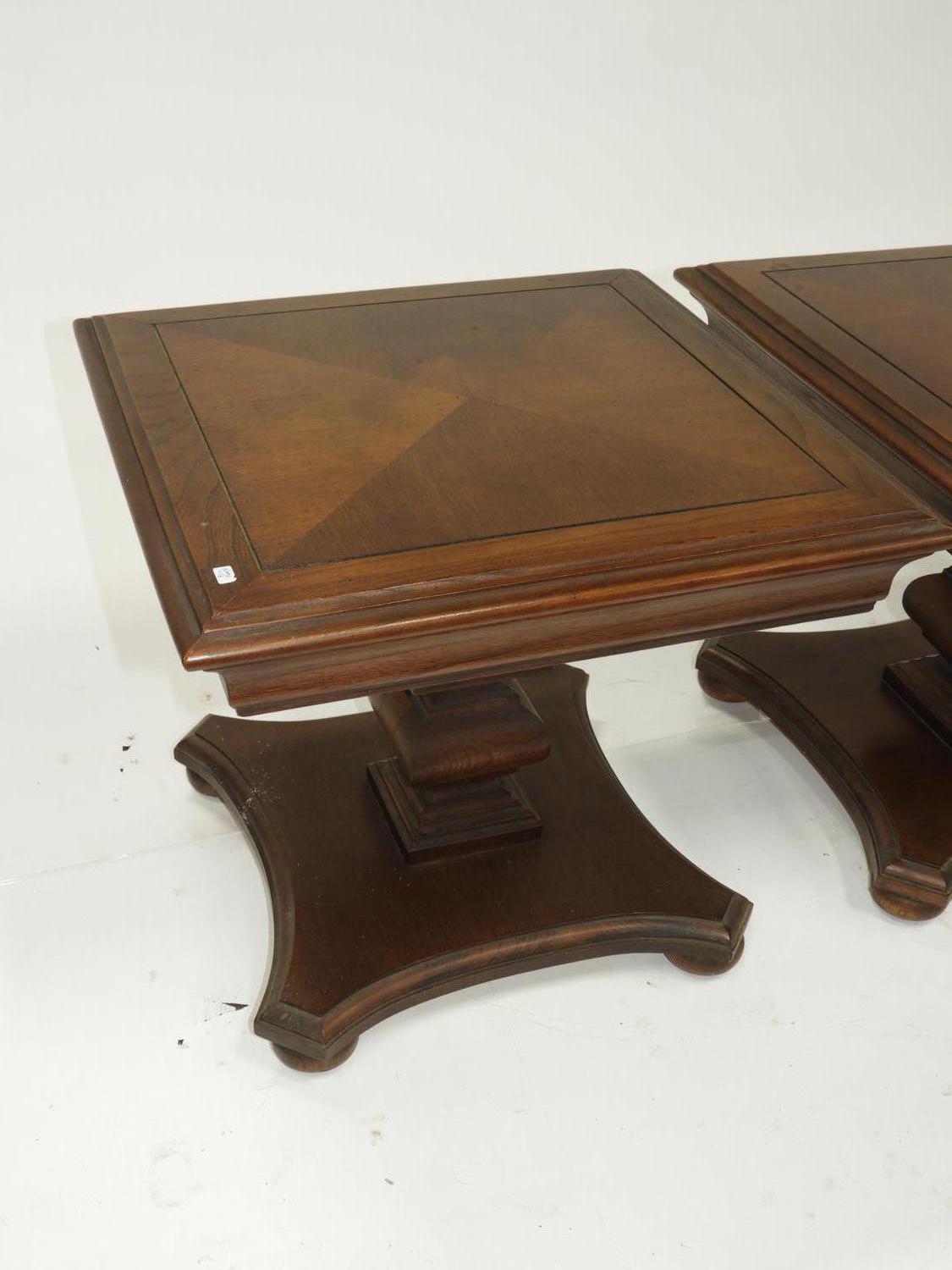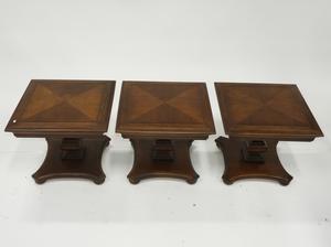 set of three parquetry inlaid walnut finish pedestal tables, mid 20th century, 16 1/2" x 18" x 18"