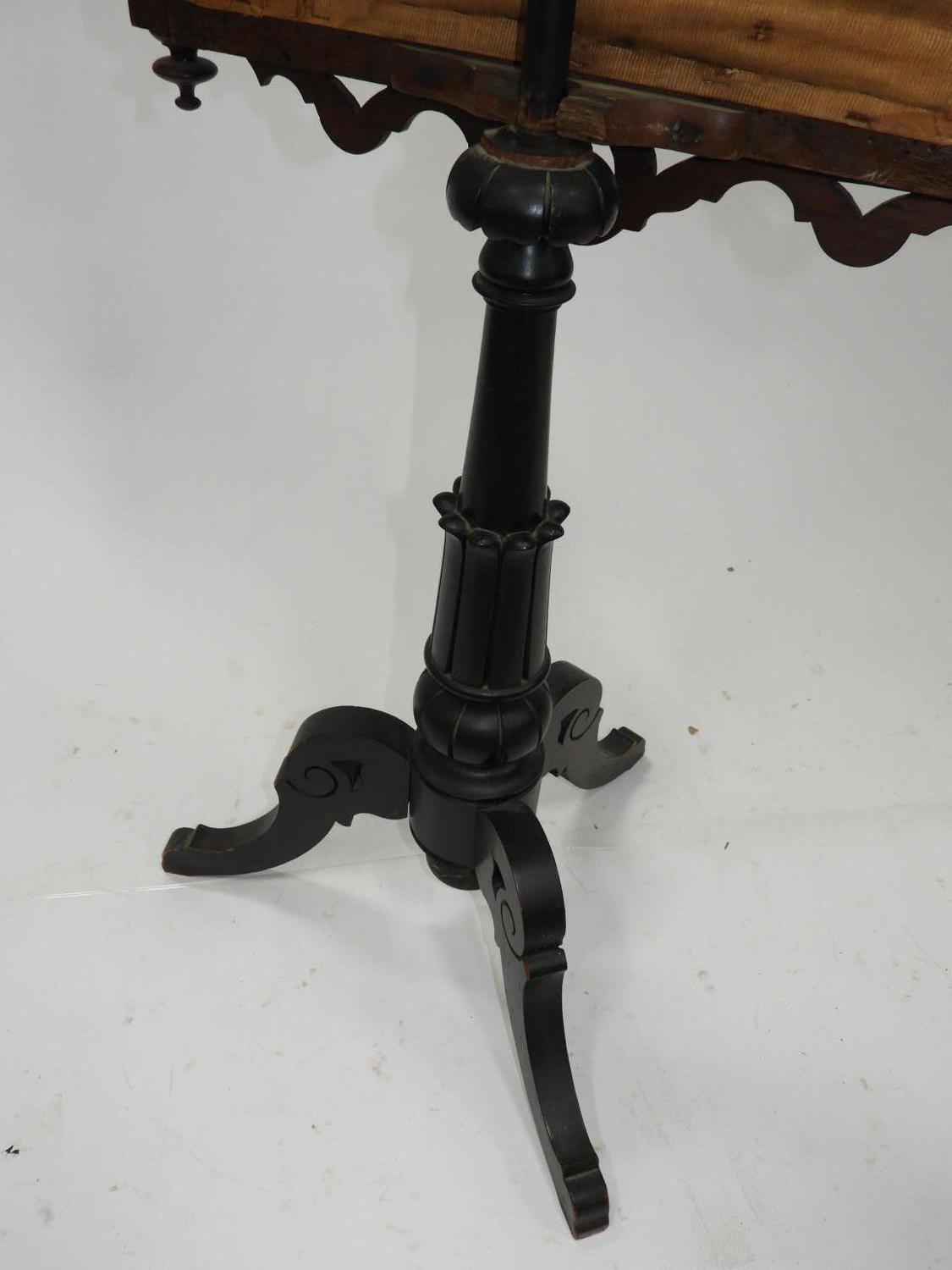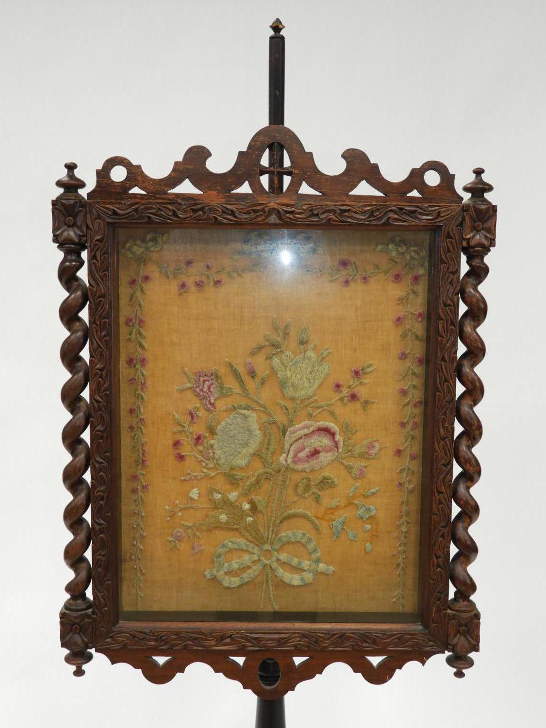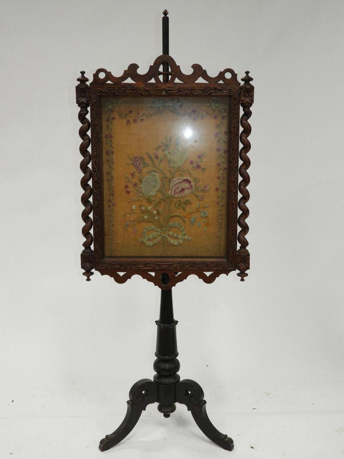 19th century carved oak and ebonized pole screen, 63" x 24"