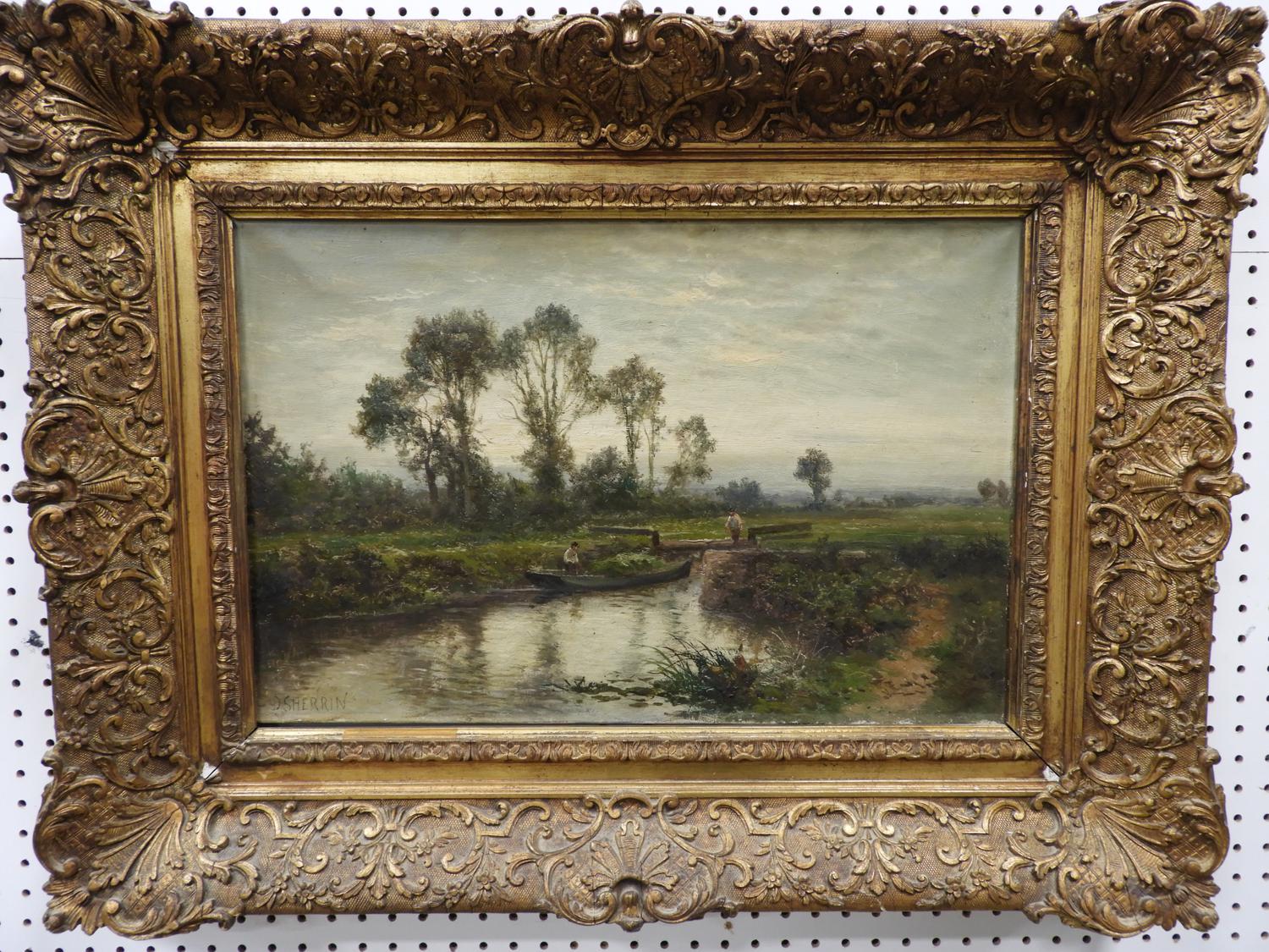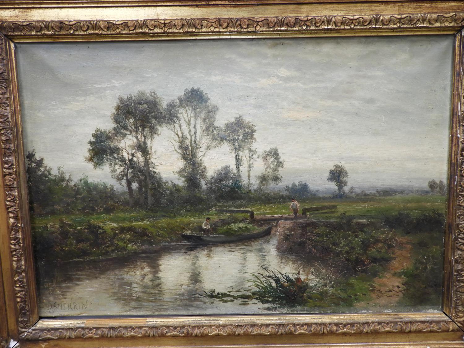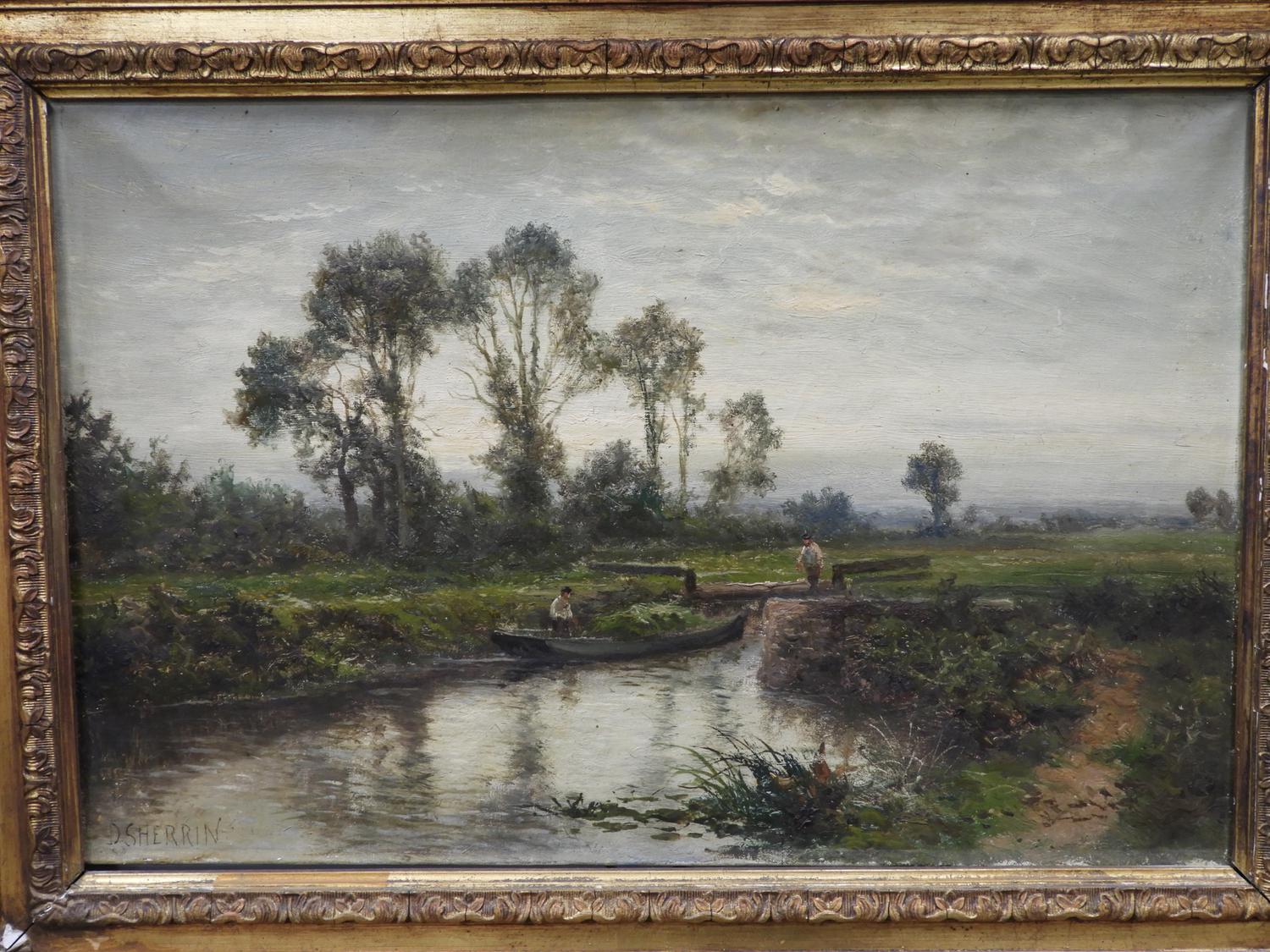 daniel sherrin (1868-1940), oil on canvas, 16" x 24", "landscape - men navigating a punt"