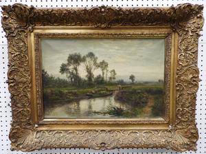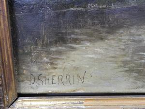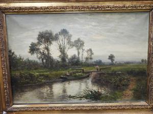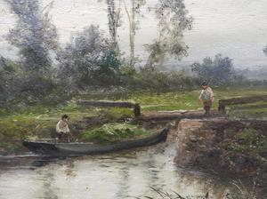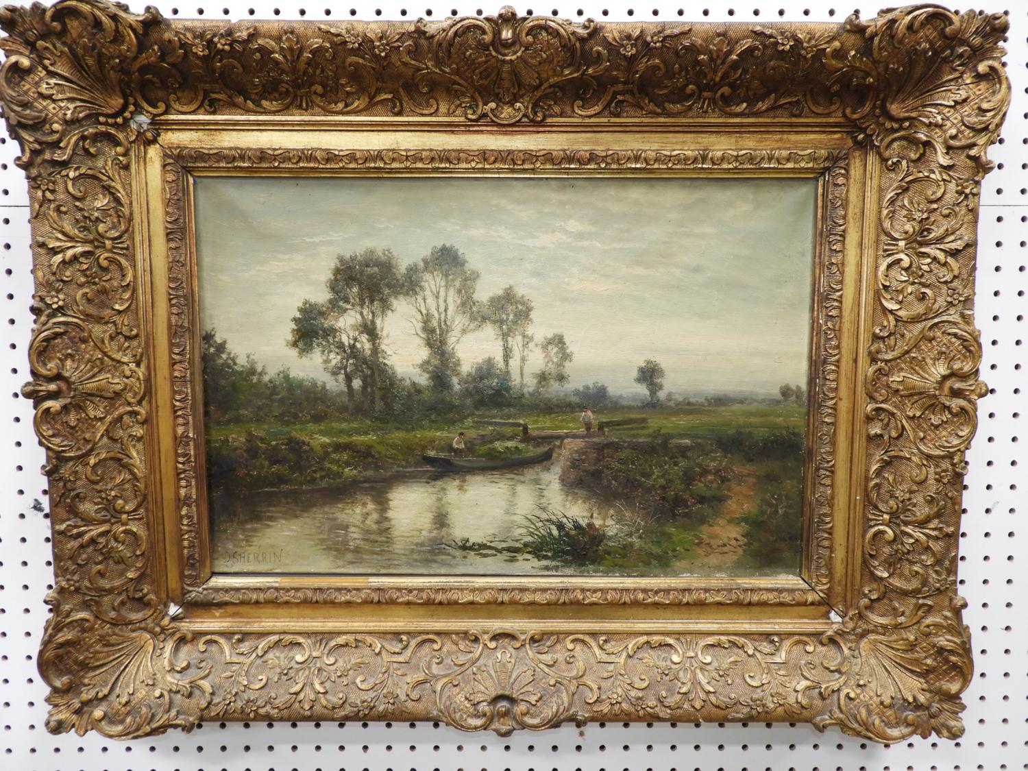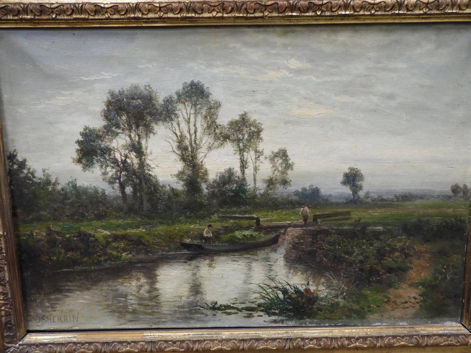 daniel sherrin (1868-1940), oil on canvas, 16" x 24", "landscape - men navigating a punt"