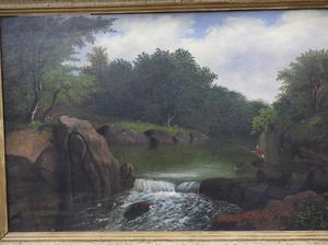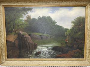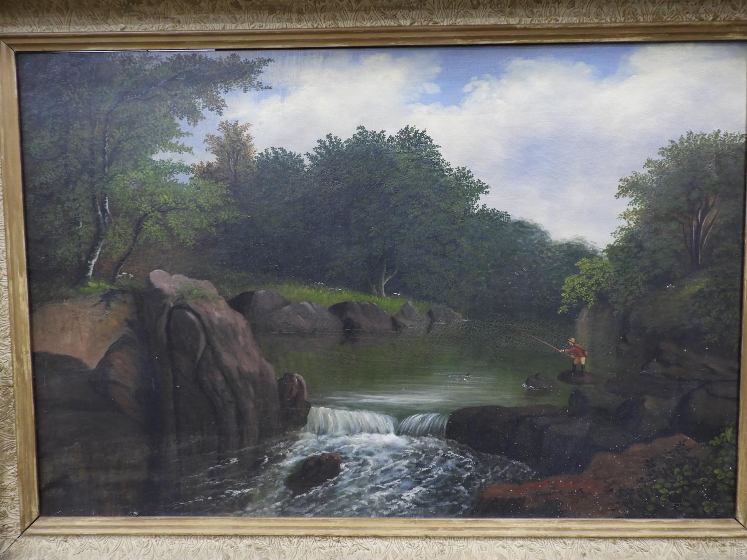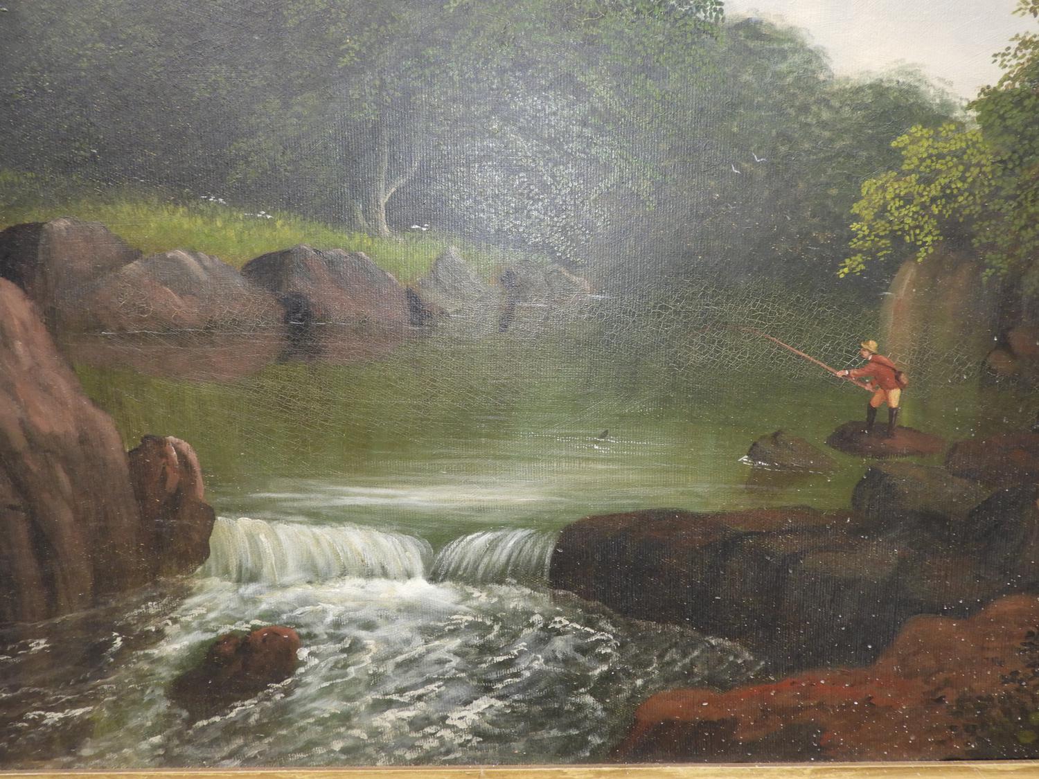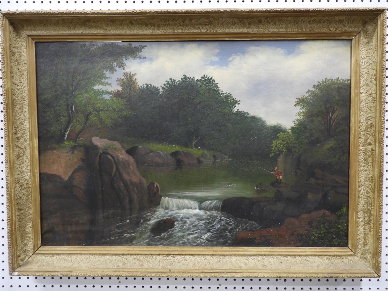 19th century english school oil on canvas, unsigned, 24" x 36", "spey casting above the rapids"