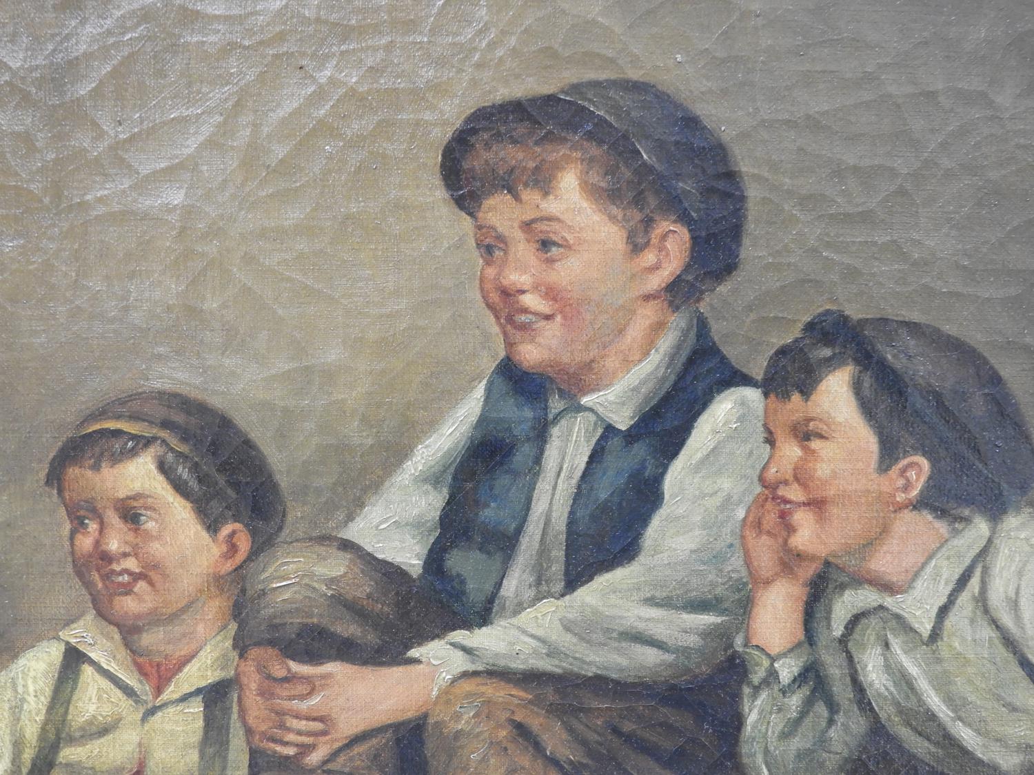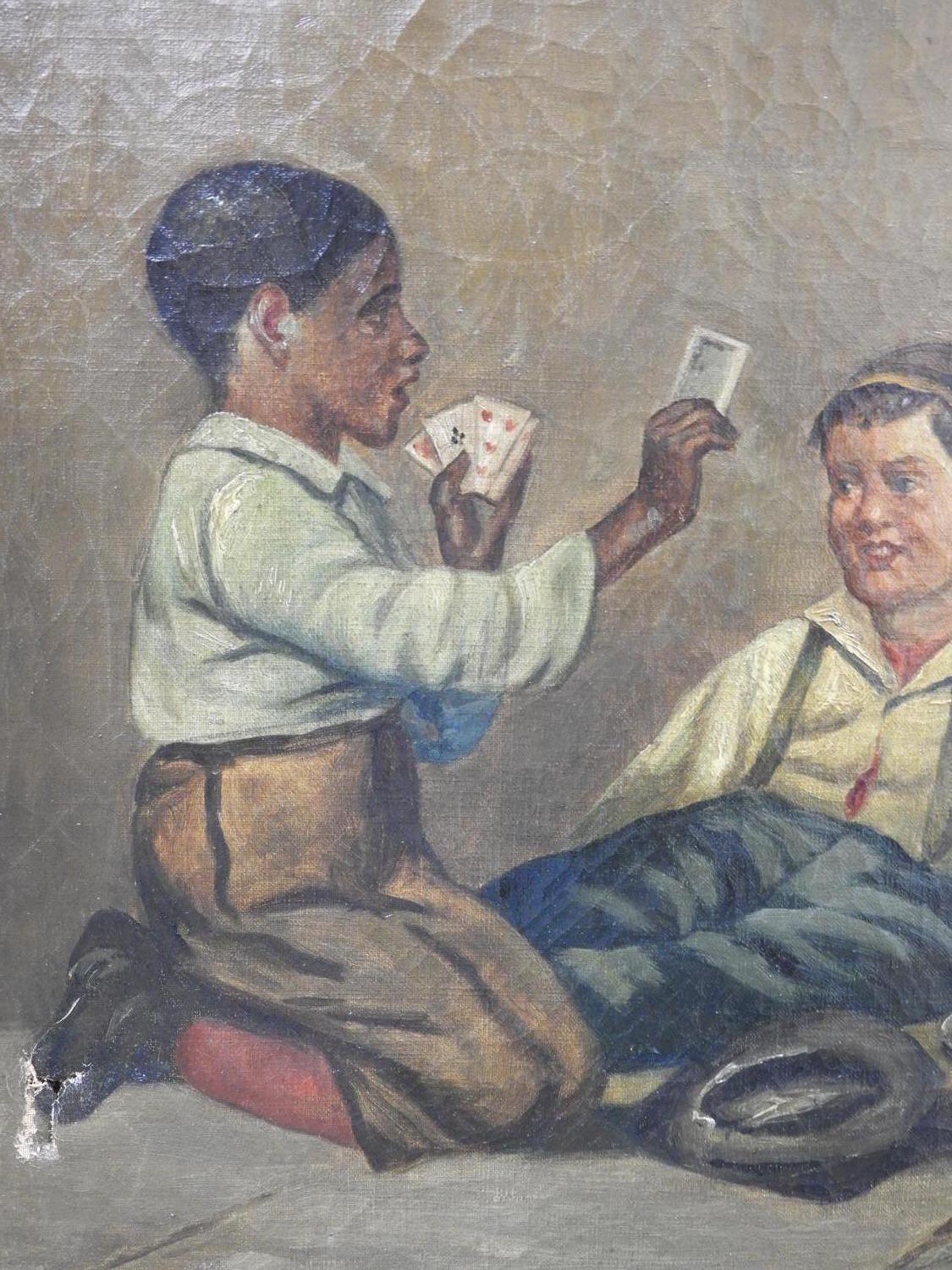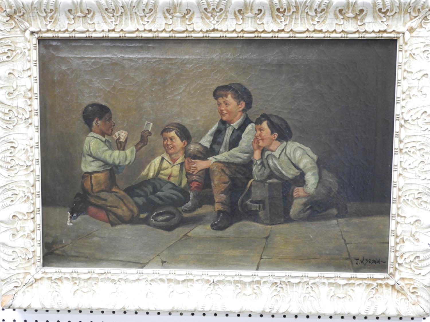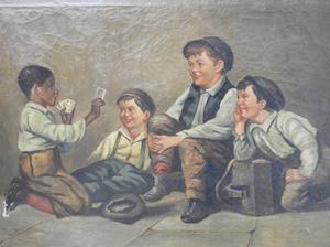 john w. brown (1842-1928), oil on canvas, 20" x 30", "the card trick - shoe shine boys"